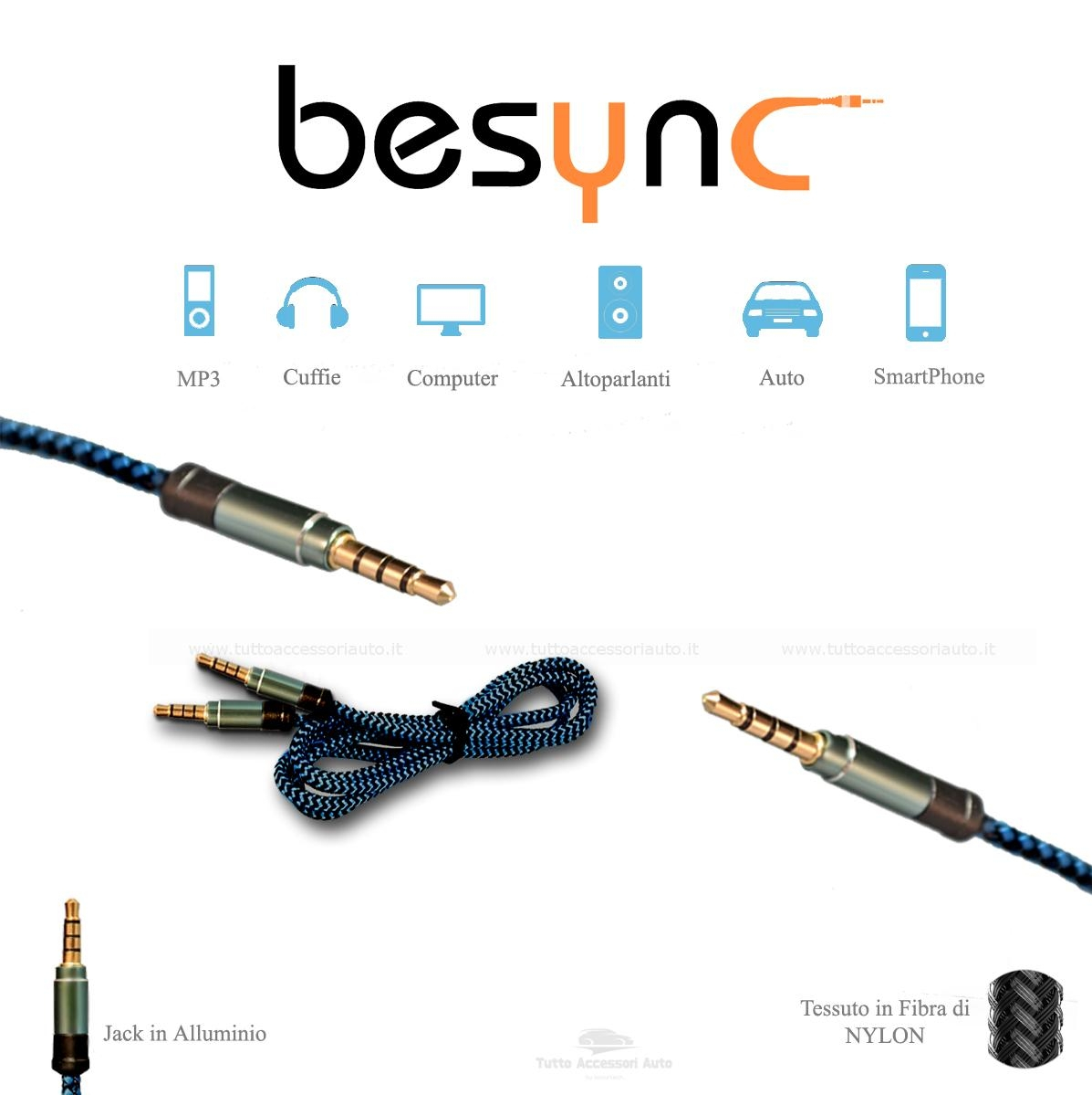 Il cavo Besync dispone di due connettori dorati da 3,5mm tipo jack delle cuffie. I connettori sono in lega di alluminio anodizzato per garantire la massima affidabilità nel tempo ed un'eccezionale qualità del trasferimento del segnale audio. La lunghezza di 1 metro è molto utile soprattutto in auto se si vuol collegare lo smartphone o l'ipod all'impianto stereo tramite la funzione AUX