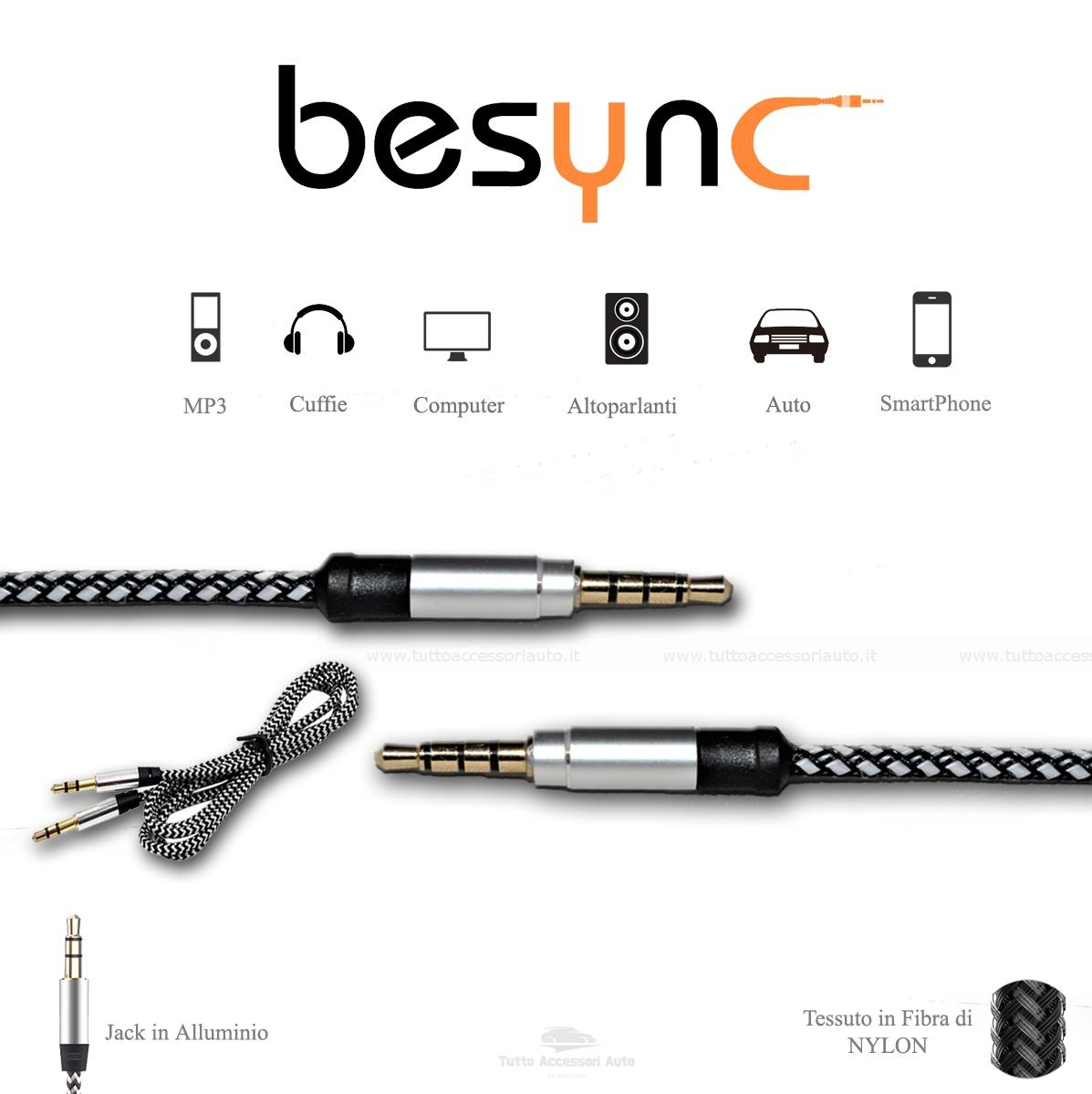 Il cavo Besync dispone di due connettori dorati da 3,5mm tipo jack delle cuffie. I connettori sono in lega di alluminio anodizzato per garantire la massima affidabilità nel tempo ed un'eccezionale qualità del trasferimento del segnale audio. La lunghezza di 1 metro è molto utile soprattutto in auto se si vuol collegare lo smartphone o l'ipod all'impianto stereo tramite la funzione AUX