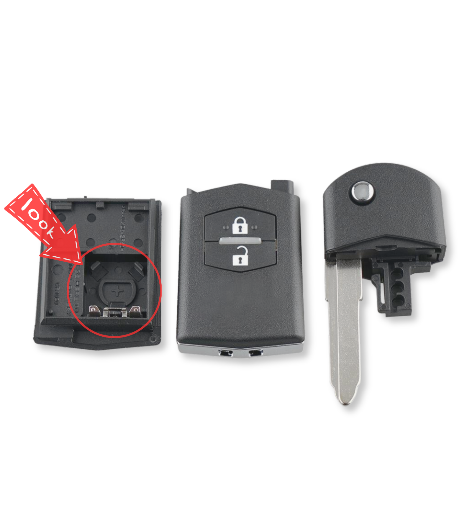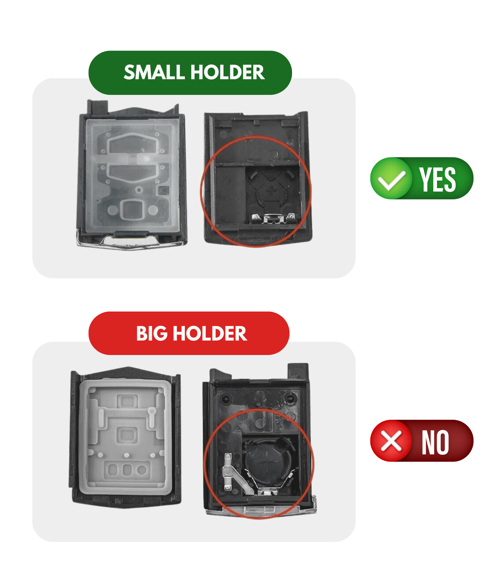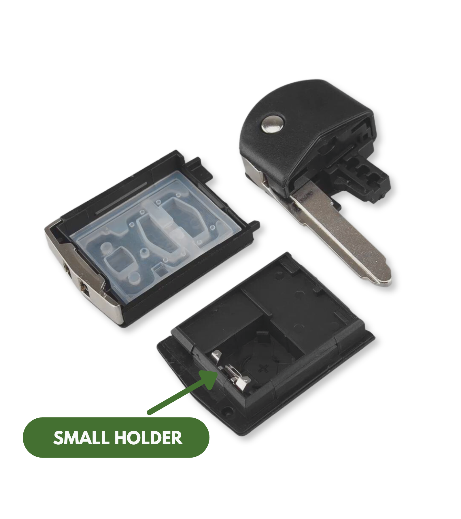 AVVERTENZE Prima di procedere con l'acquisto, prestare la massima attenzione al vano batteria della tua chiave. Il telecomando compatibile con Mazda può avere due vani batteria differenti. L'alloggio batteria della chiave in vendita è la versione "small holder" con i contatti della batteria posizionati in modo differente alla versione "big holder". Osserva attentamente le foto della galleria immagini del prodotto
