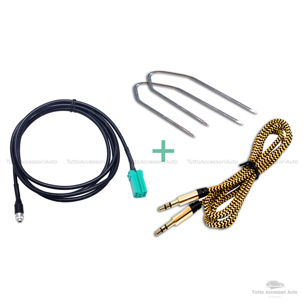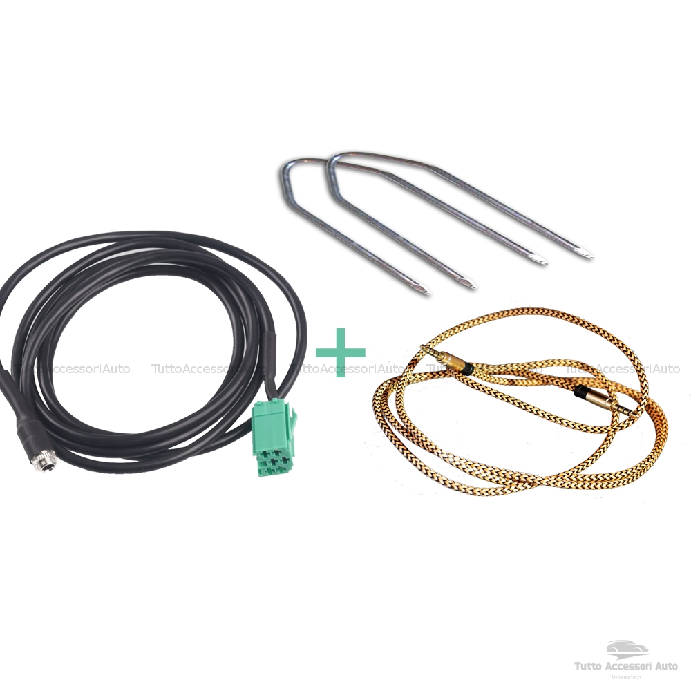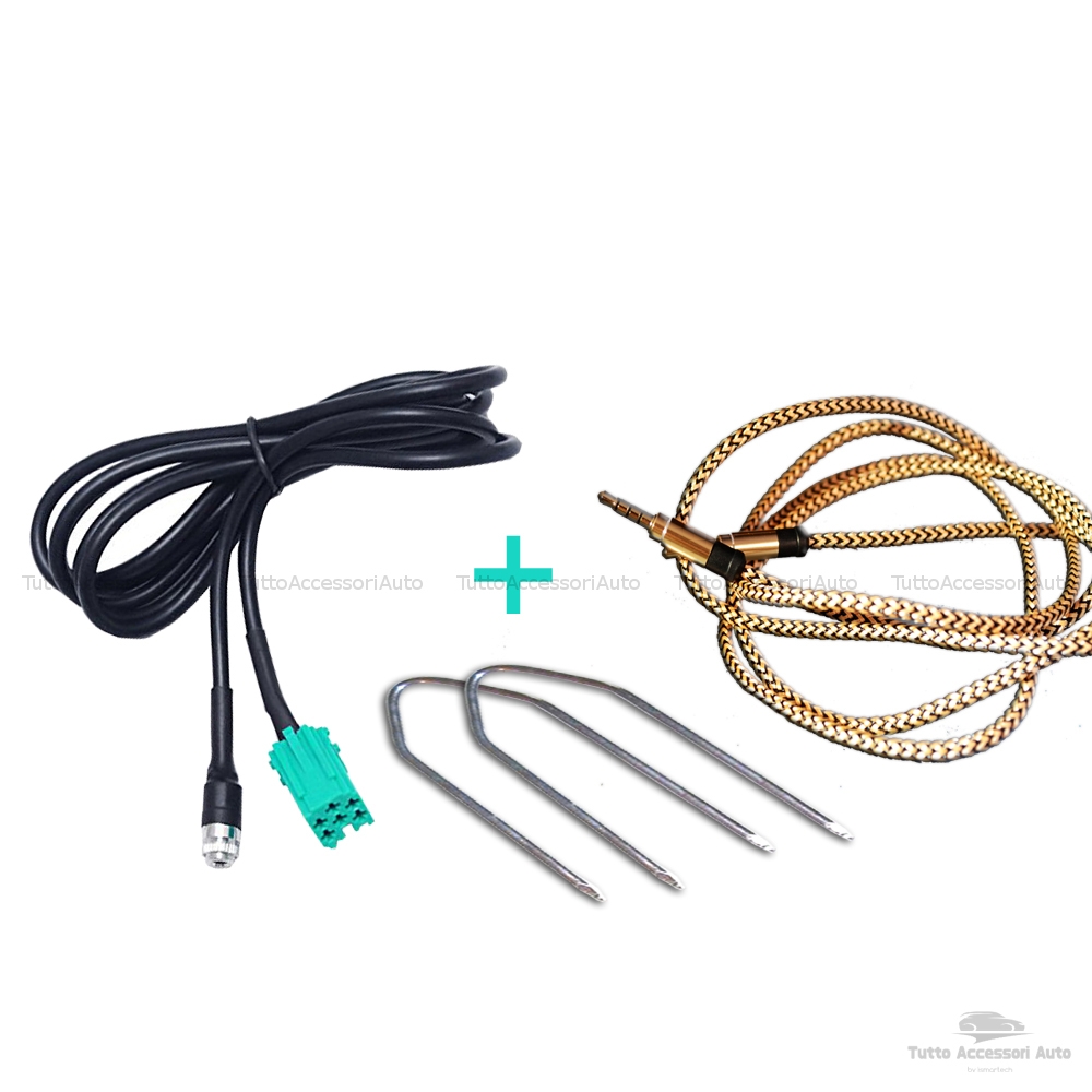 DESCRIZIONE Il cavo aux consente il collegamento di una qualsiasi sorgente audio, smartphone, iPod, iPhone o lettore mp3 all'autoradio della vostra autovettura Renault. Il cavo dispone di un jack femmina da 3,5mm e di un connettore da collegare al retro dello stereo. In omaggio il cavo Besync con n. 2 jack maschi dorati in lega di alluminio anodizzato da 3,5 mm e rivestito in nylon. La rete in nylon intrecciato che riveste la guaina offre un'ottima resistenza alle torsioni ed un'efficiente funzionalità anti groviglio. Tale rivestimento rende il cavo ultra resistente nel tempo