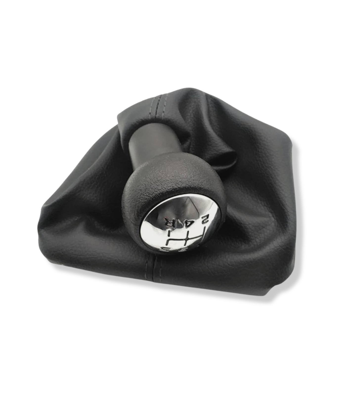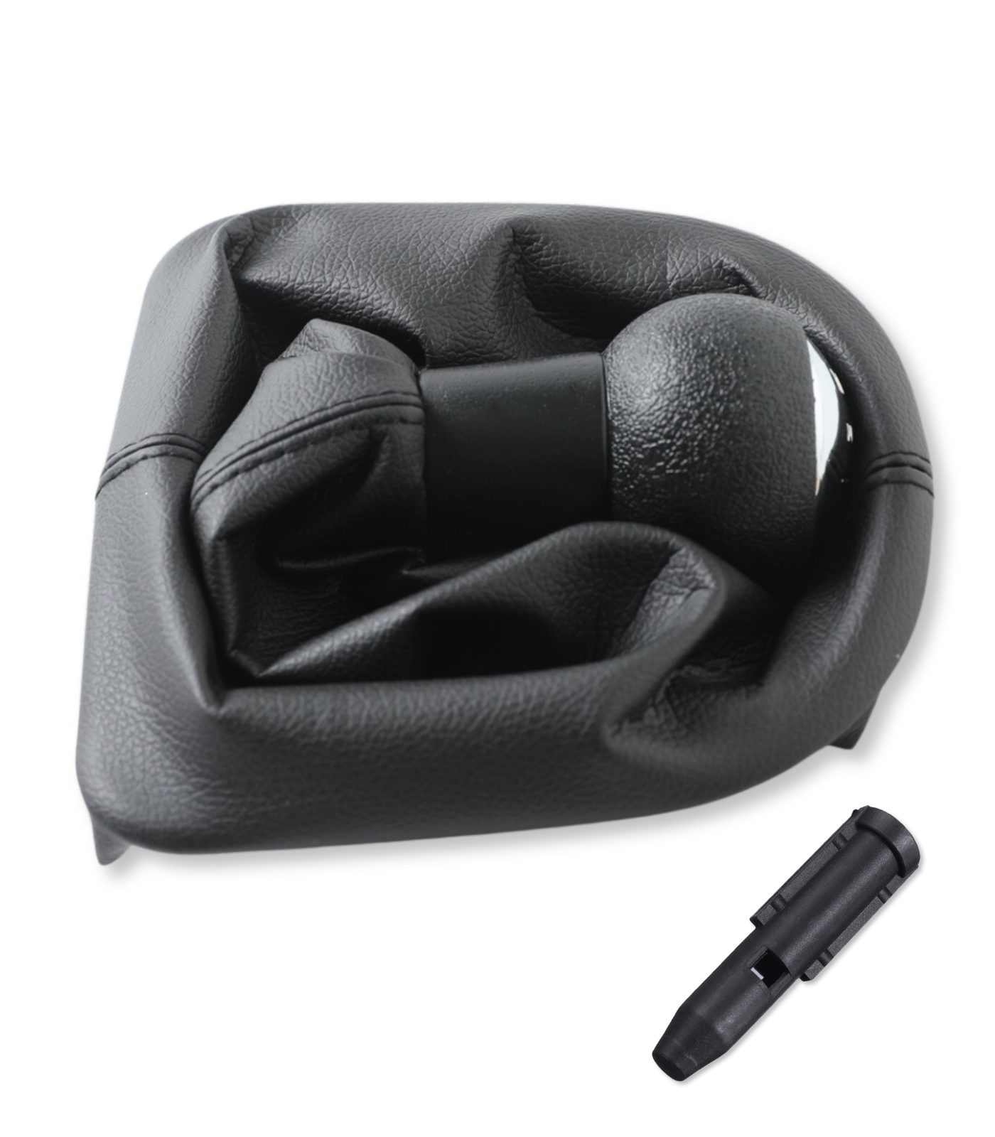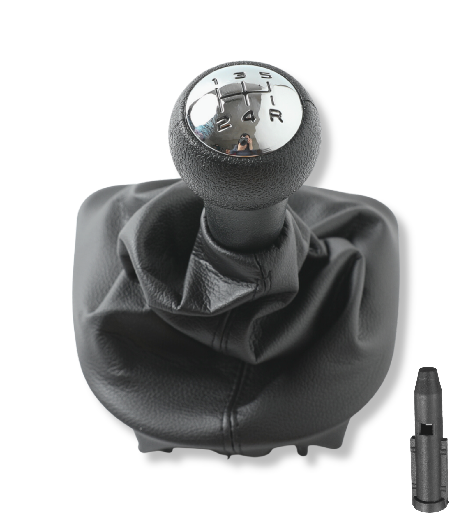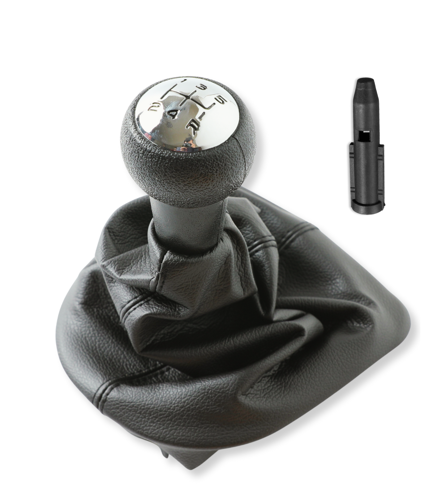 Kit composto da un pomello 5 marce, da una cuffia con ghiera di ritenzione con cuciture nere e telaio premontato e da un adattatore in plastica per leva cambio in sostituzione del vecchio ormai usurato