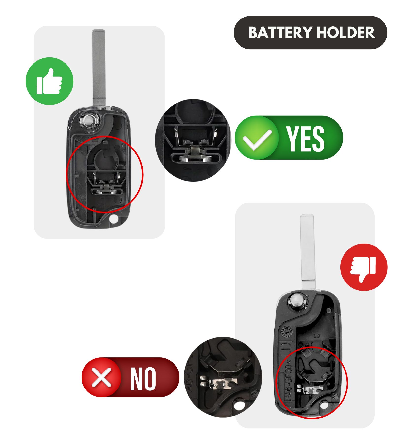 Importanza dei Dettagli È cruciale che i contatti in acciaio del tuo guscio corrispondano a quelli mostrati nella foto "yes". Se la tua chiave ha i contatti come nella foto "no", questo prodotto non è adatto per te.