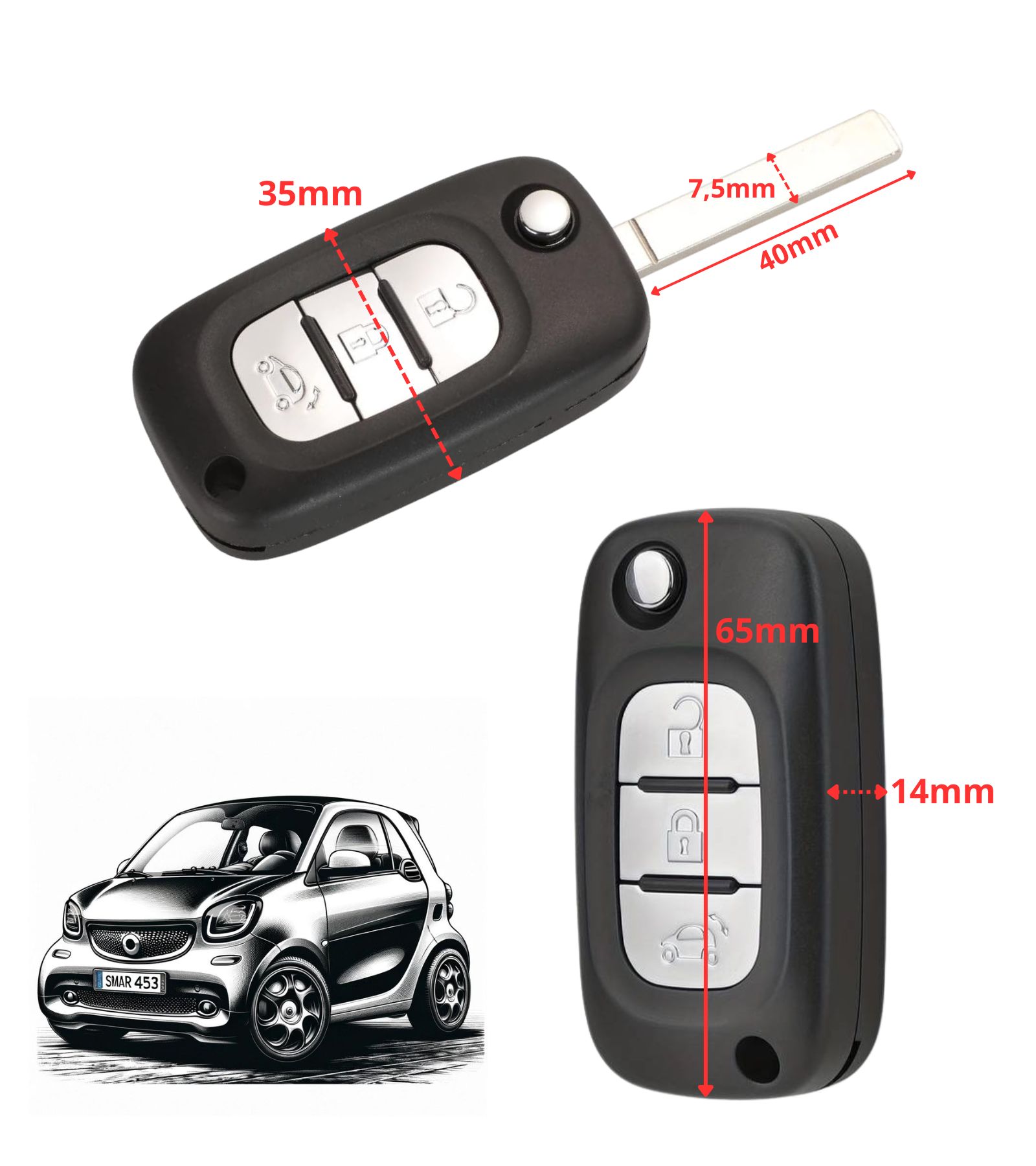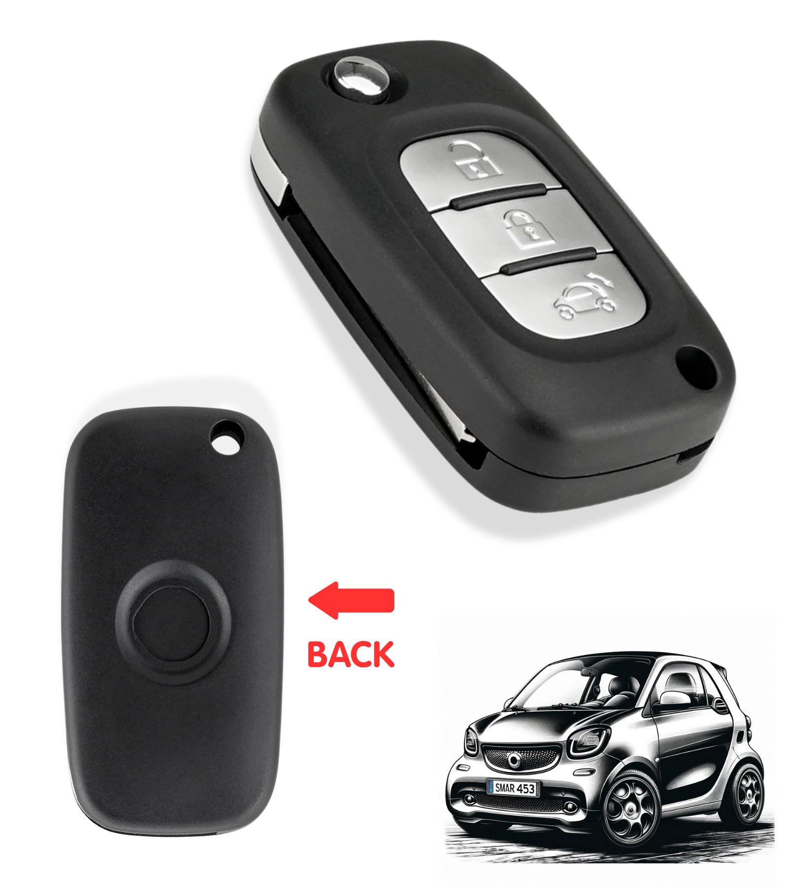 Compatibilità Verificata con Smart Forfour Fortwo 453 Questa chiave auto per telecomando 3 tasti, con lama, è specificamente progettata per la serie Smart Forfour Fortwo 453. Prima dell'acquisto, assicurati di verificare la compatibilità consultando la foto n. 2 della nostra galleria per evitare incompatibilità.