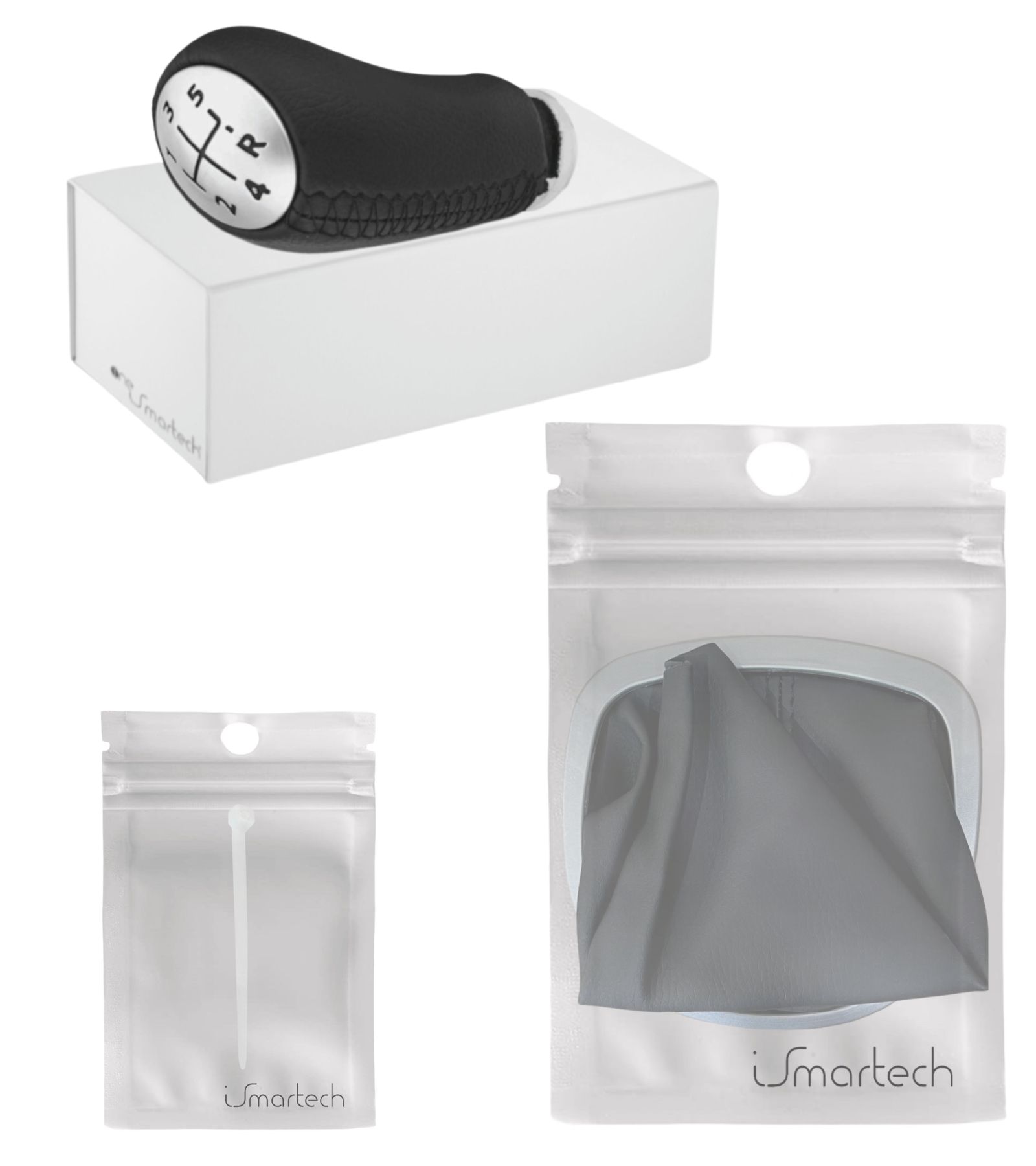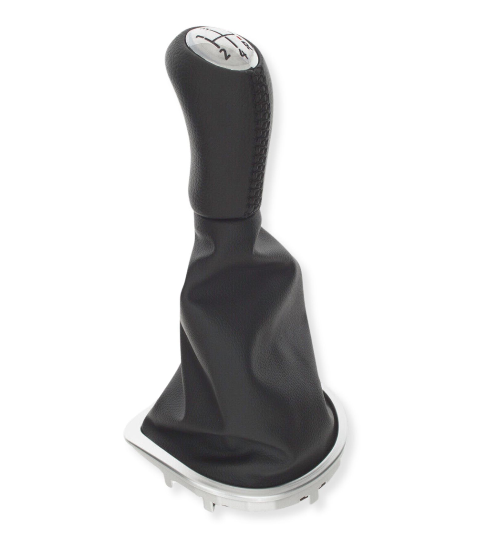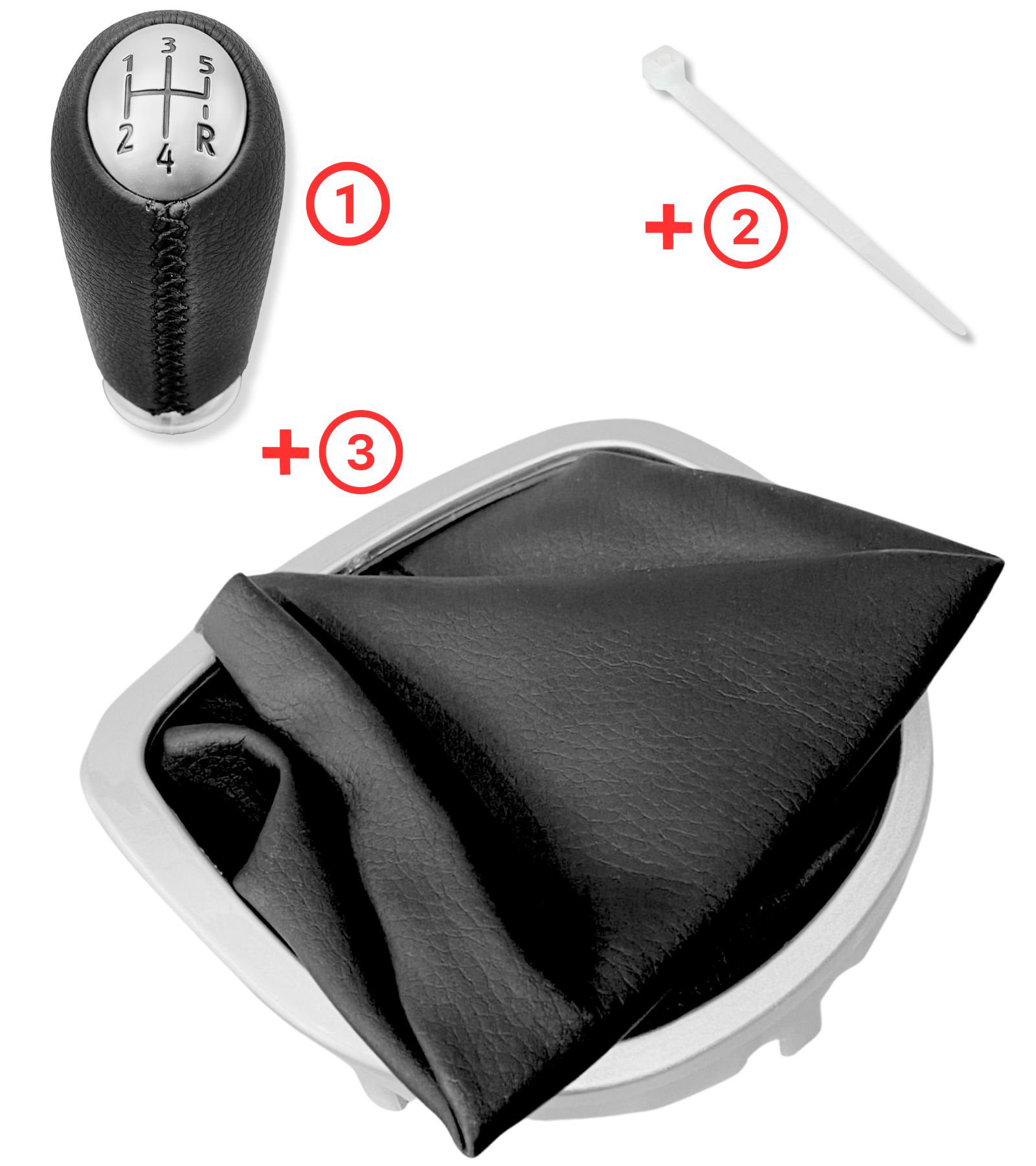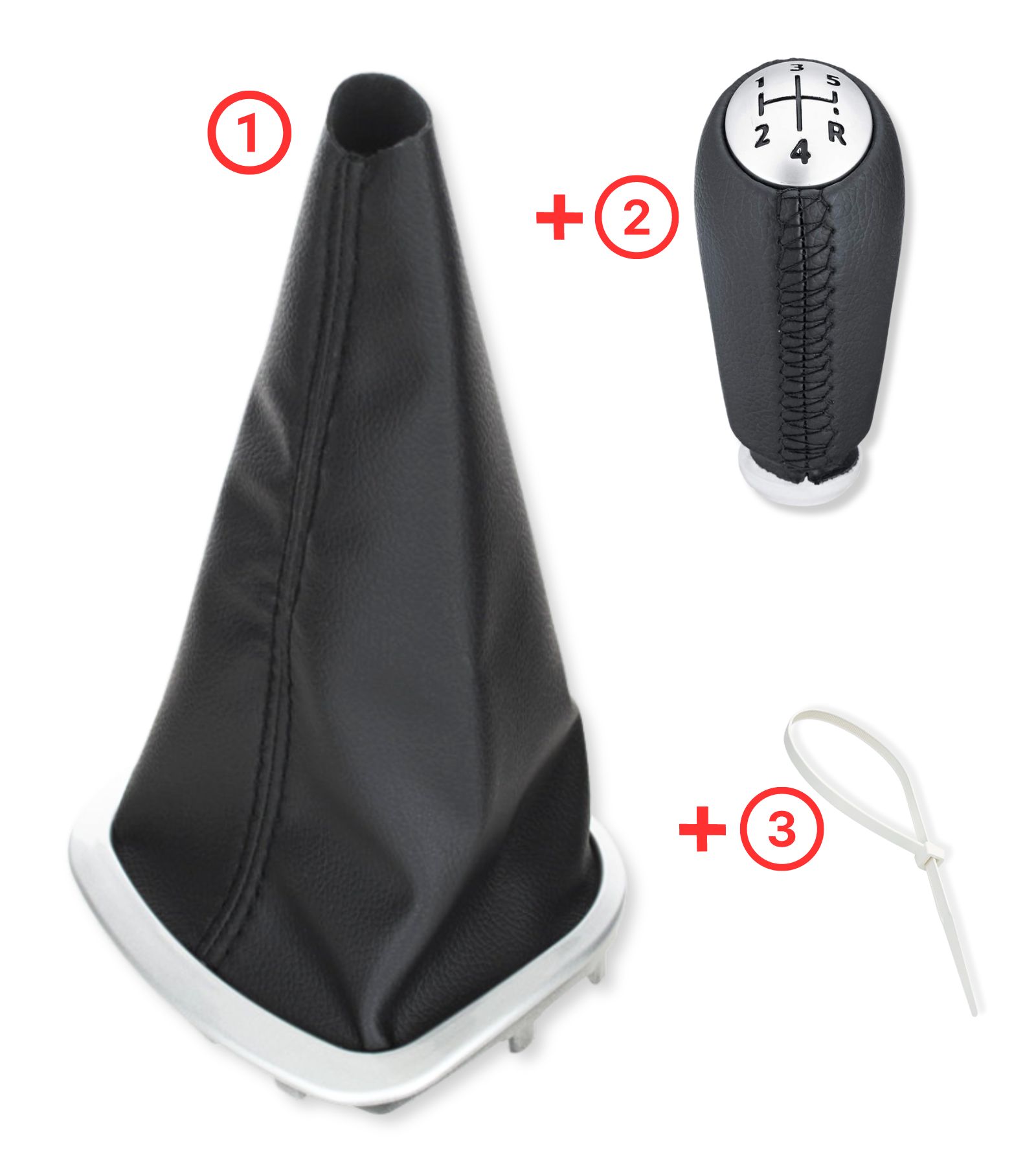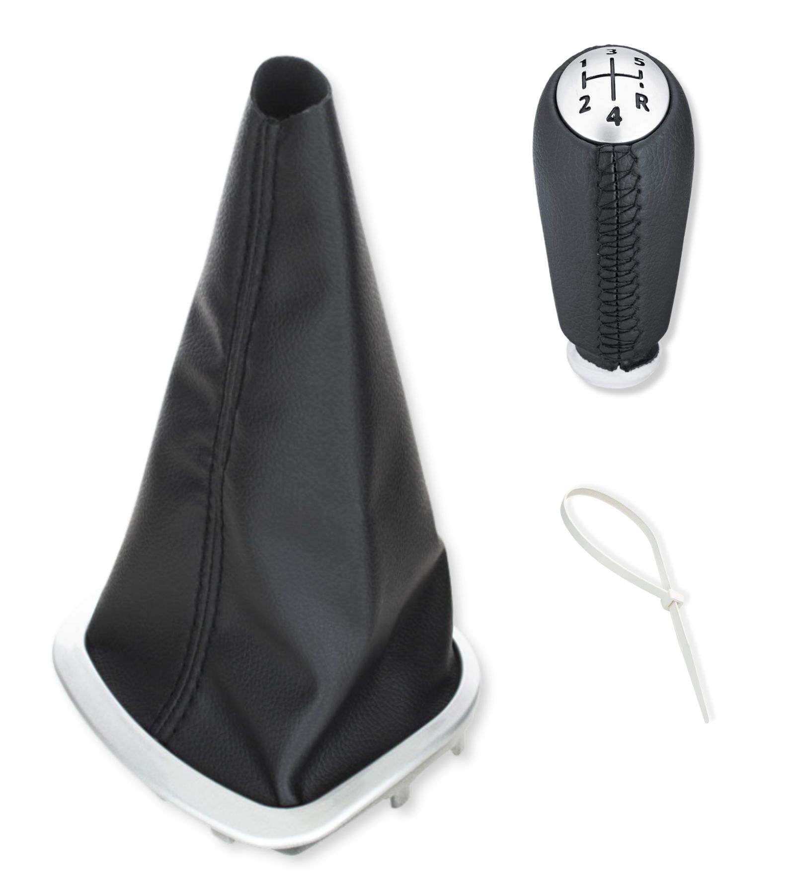 Kit composto da 3 articoli: una cuffia con cuciture nere per leva cambio, cornice esterna di design color argento e telaio interno; un pomello per leva cambio 5 marce e retromarcia, trasmissione manuale in similpelle con cuciture nere; una fascetta per il montaggio del pomello. Articolo completo in sostituzione della vecchia cuffia ormai usurata.