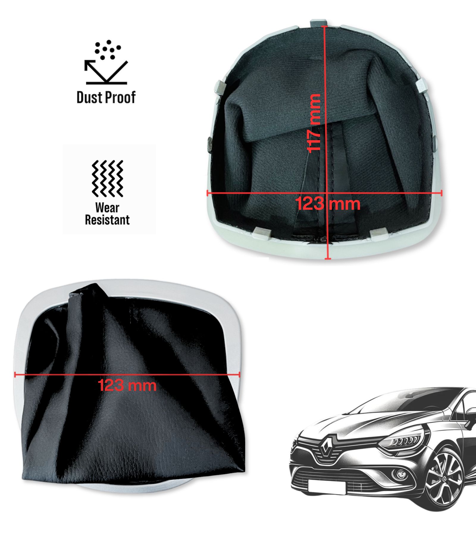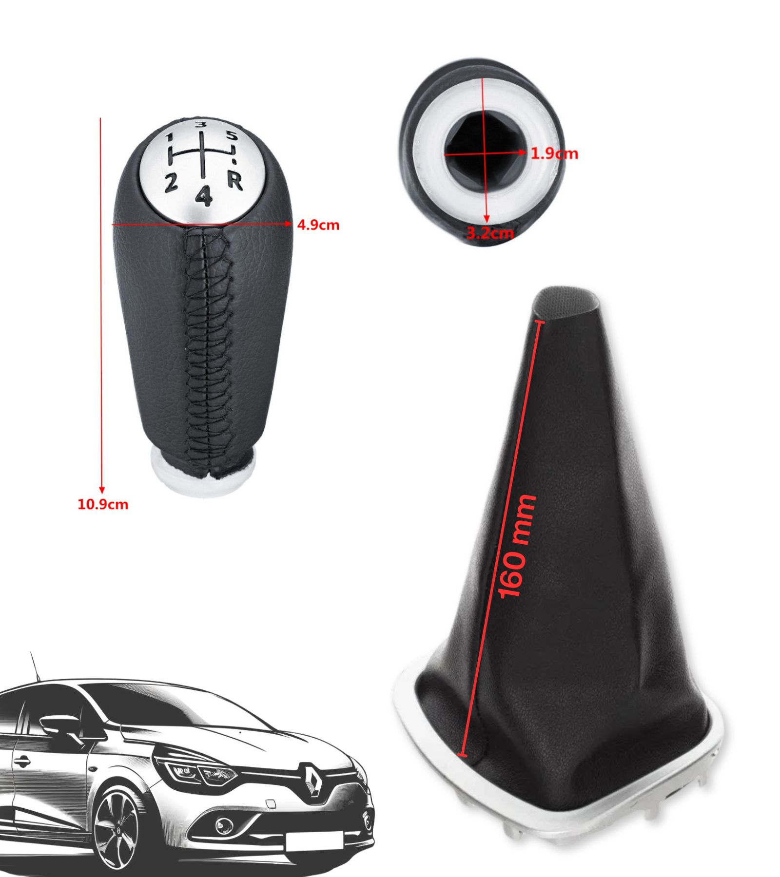 Kit composto da Pomello 5 marce, Cuffia con cornice e fascetta in nylon. Kit compatibile con Renault Clio III, Kango II, Twingo II, Espace IV.