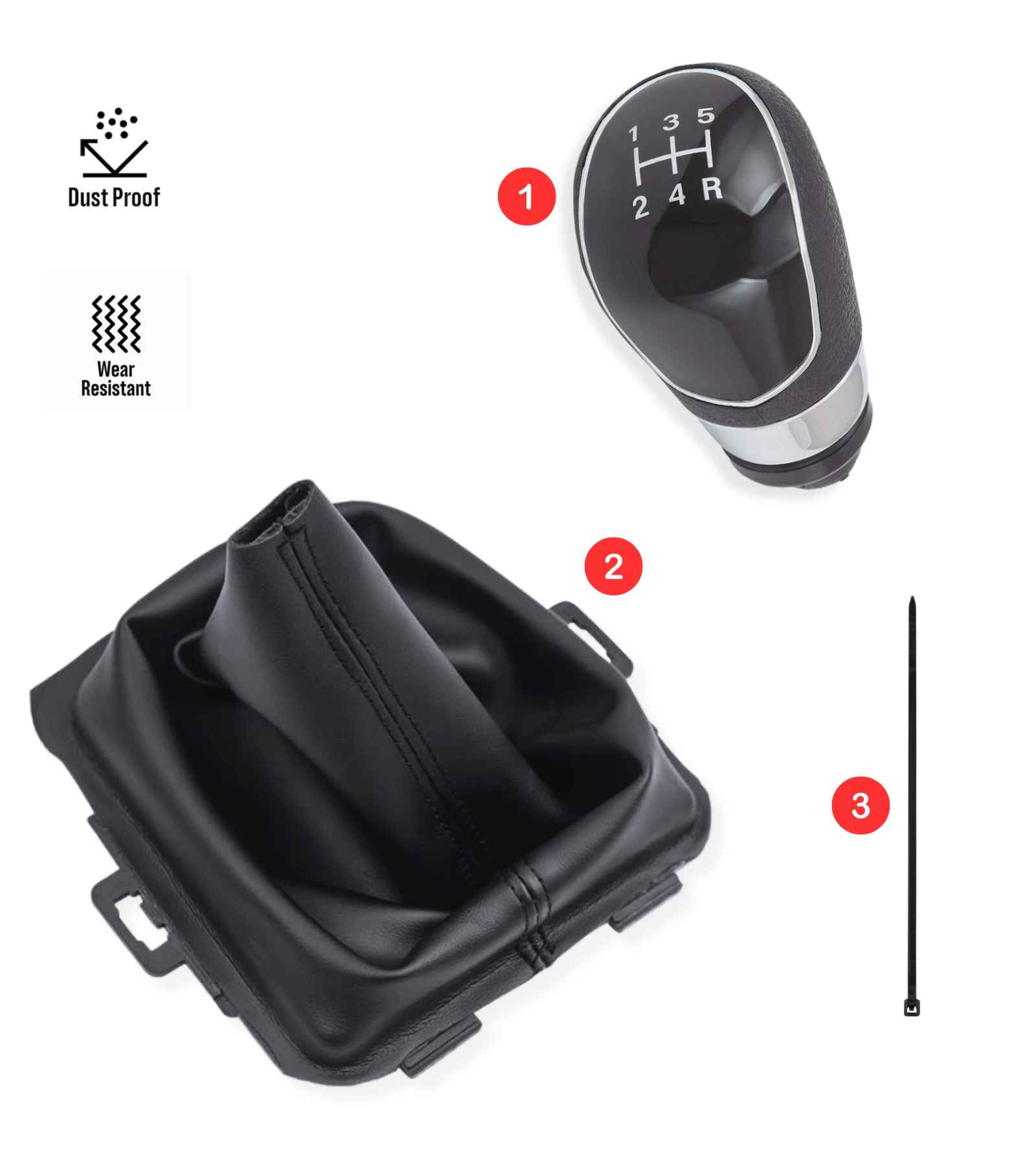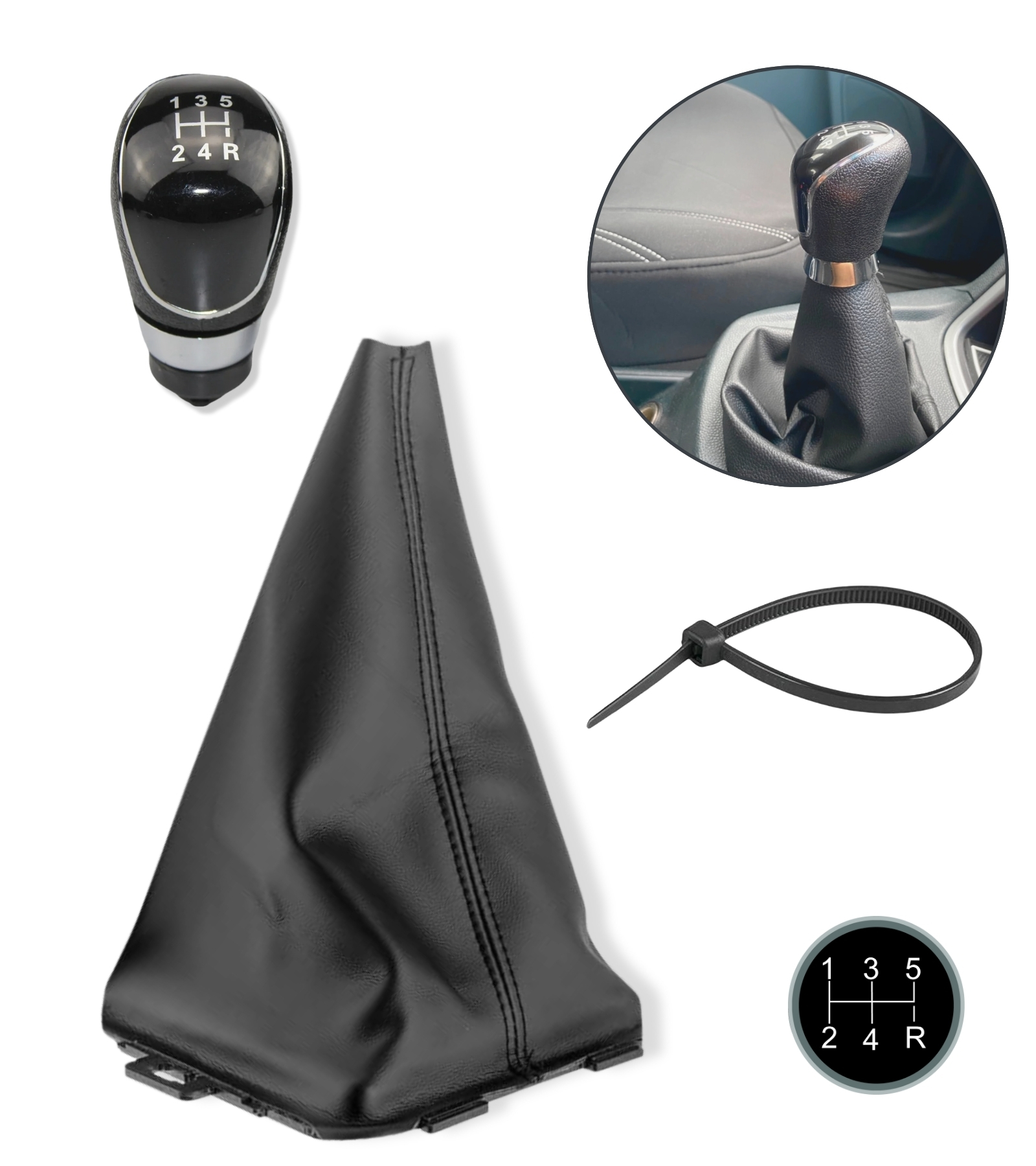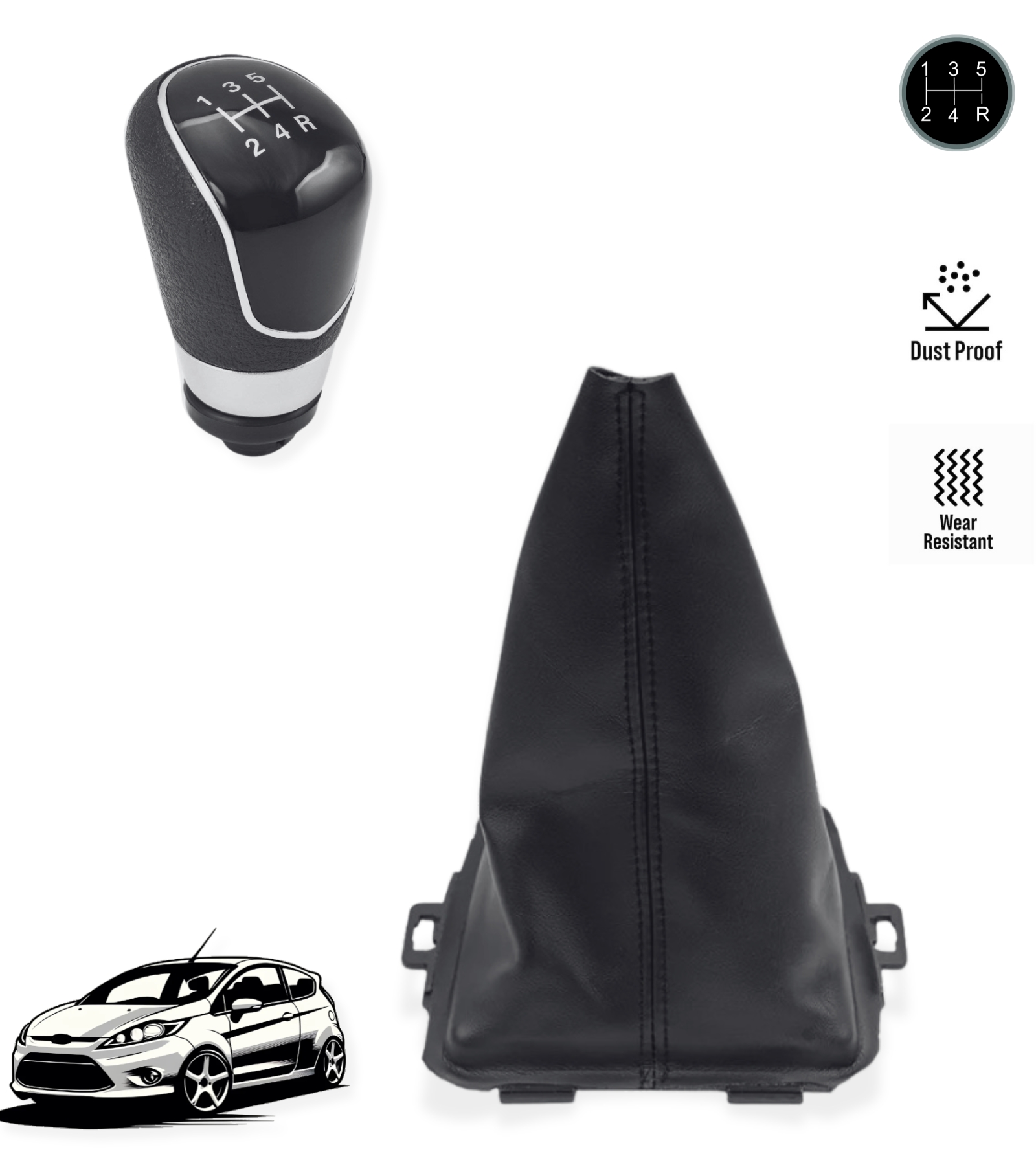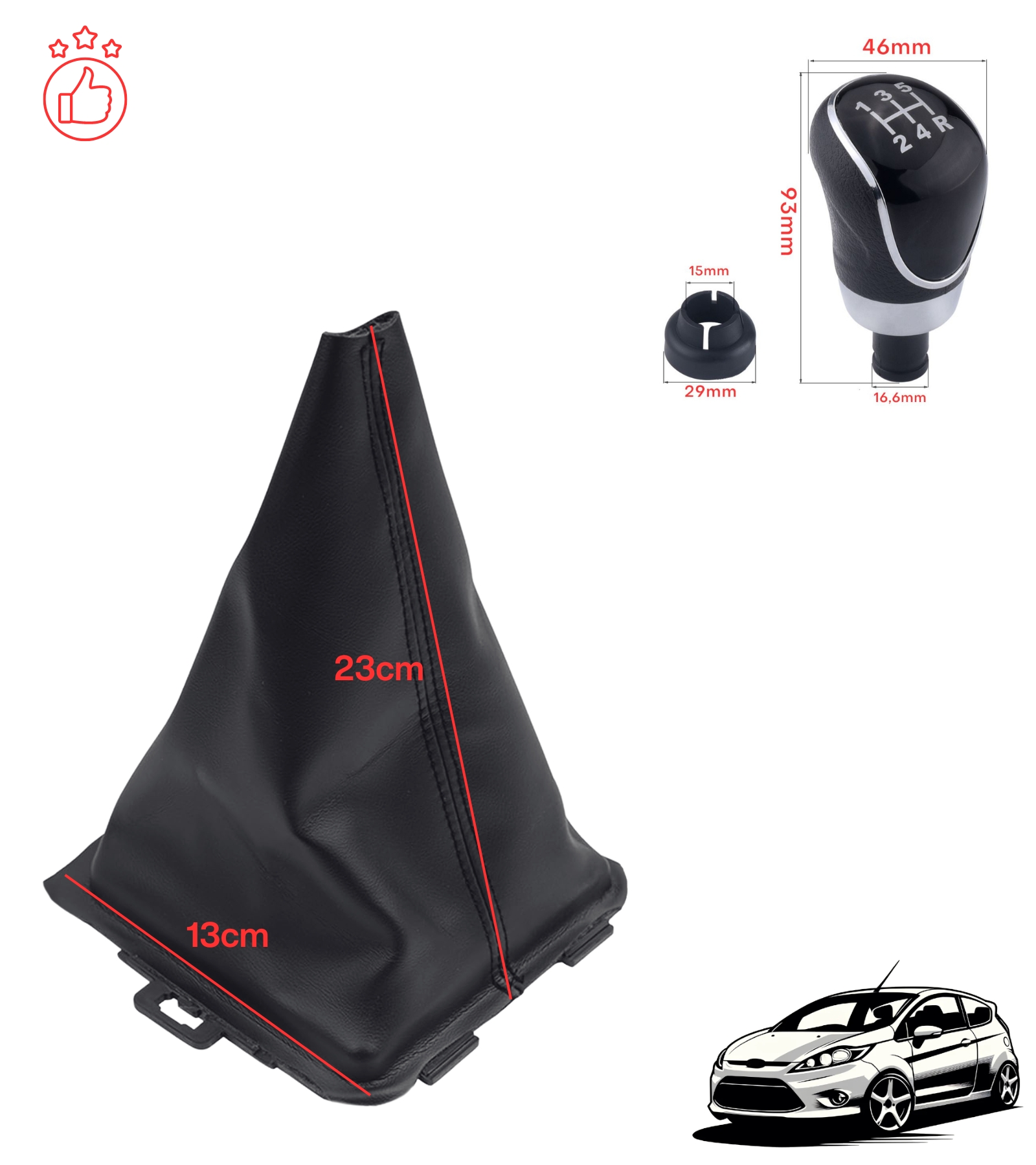 Questo kit di pomello a 5 marce e cuffia per leva cambio è compatibile con Ford Fiesta MK5 2008 e MK6 dal 2008 al 2012. Include pomello, cuffia in similpelle nera e fascetta in nylon per un'installazione completa e senza problemi. I codici OEM sono: 8A6R-7H409-MA, 8A6R7H409MA, 1556845),