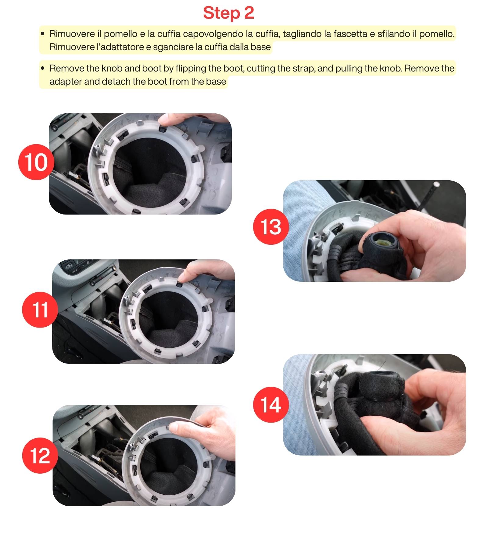 1) Montare la nuova cuffia: la ghiera interna di colore bianco ed il telaio esterno nero attorno alla base del cambio, assicurandosi di agganciare nel modo corretto le clip di fissaggio.