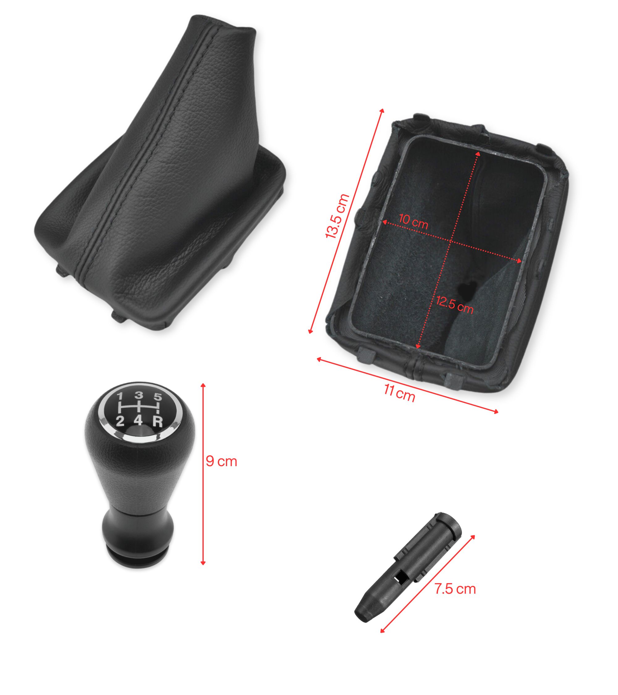 Il contenuto della confezione è: kit completo di pomello 5 marce, cuffia, telaio e adattatore in plastica per leva cambio compatibile con Peugeot 206, Peugeot 206 Plus, Peugeot 406.