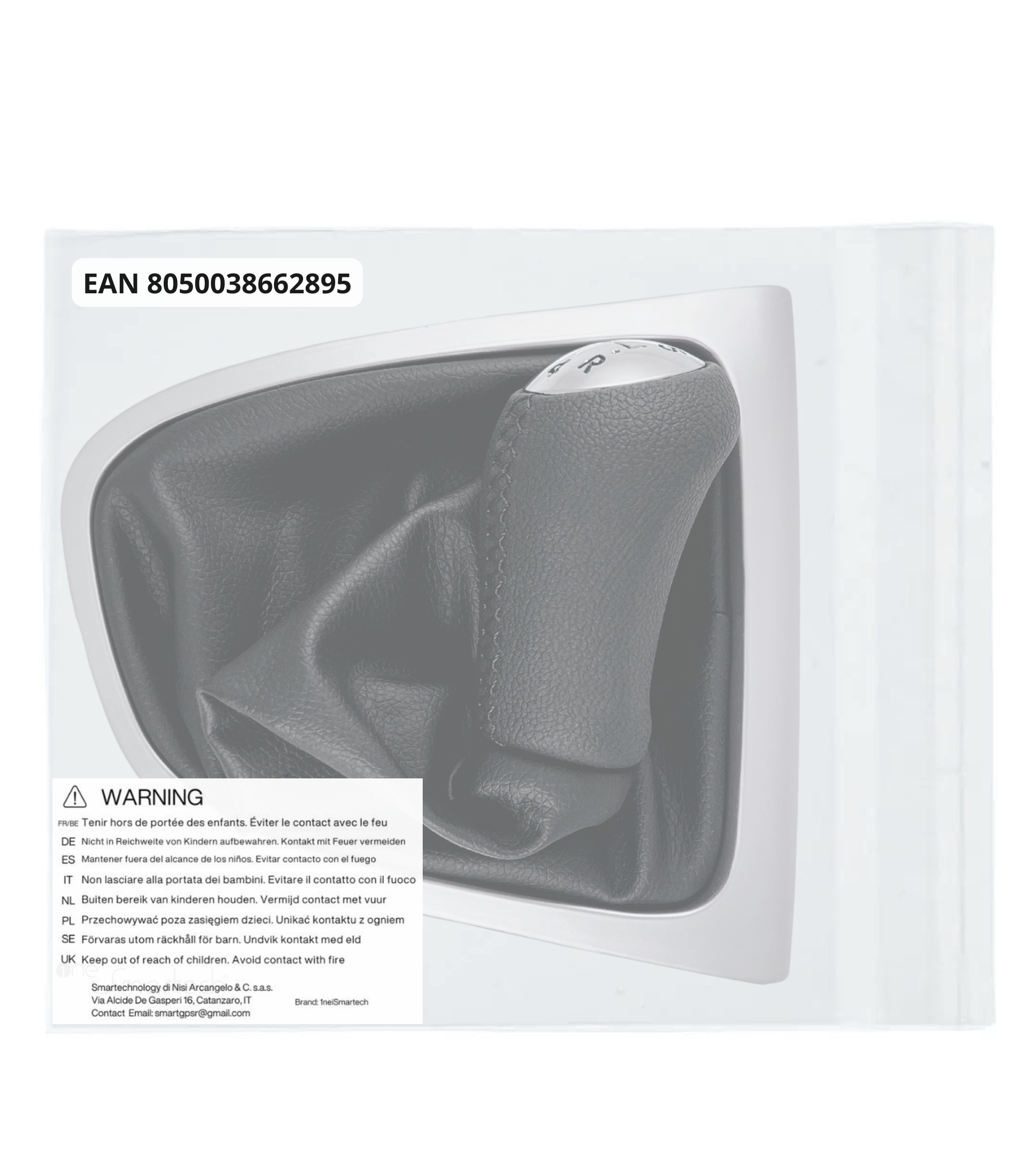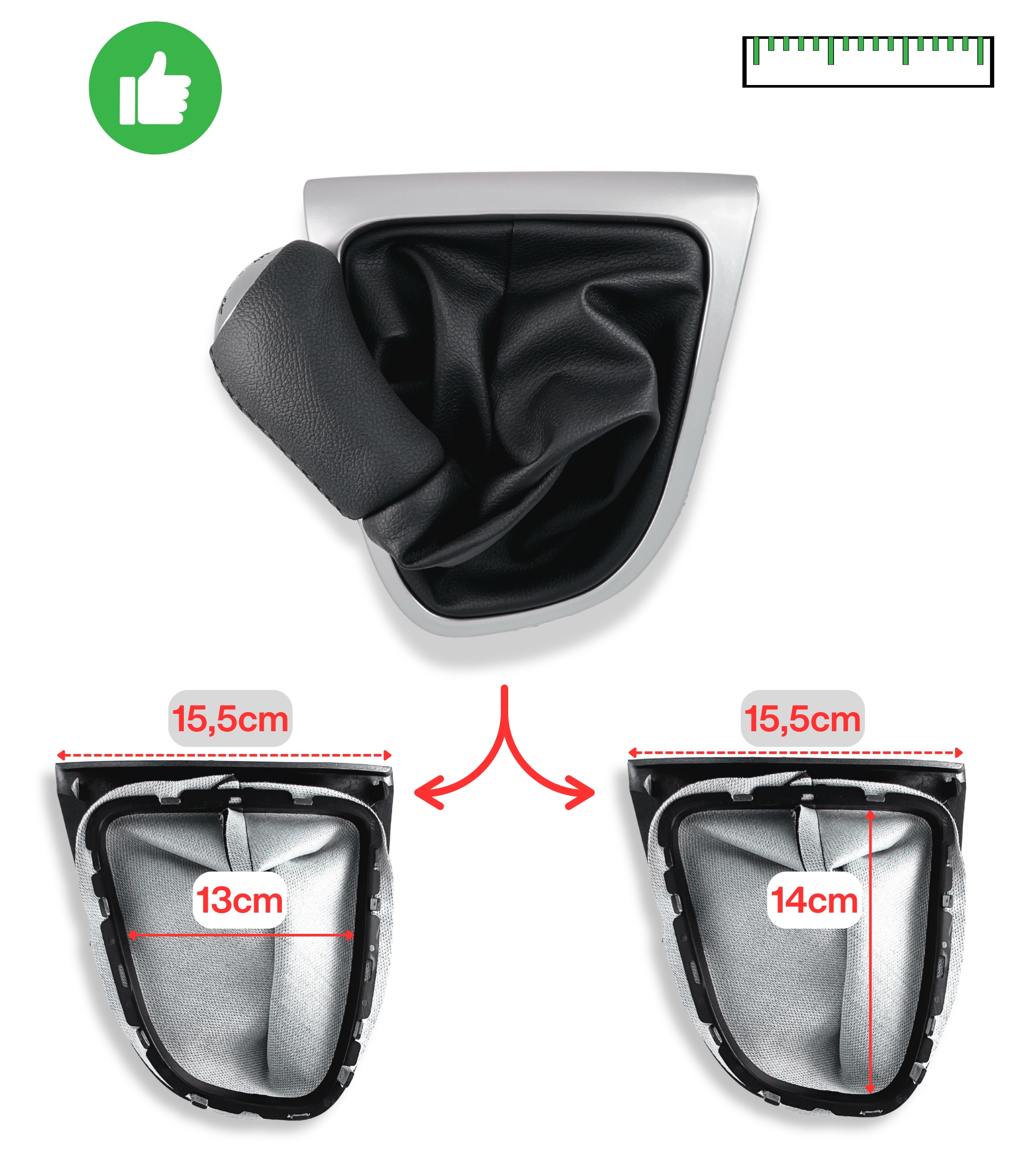 Il contenuto della confezione è: kit completo di pomello 5 marce con rivestimento in similpelle (colore nero), cuffia in similpelle (colore nero) e telaio (colore argento) per leva cambio compatibile con Renault Clio IV dal 2012 al 2020.