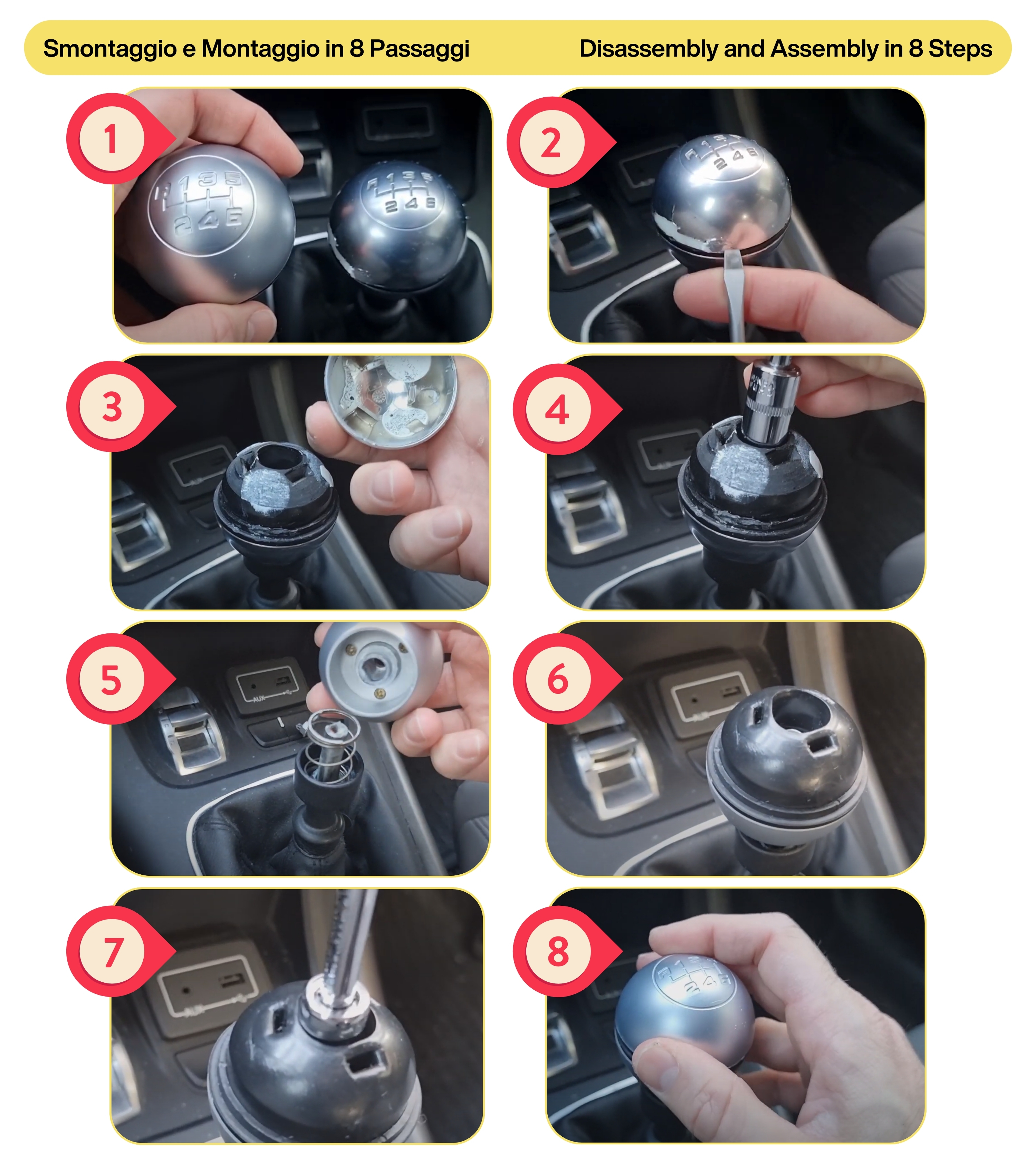 Il pomello arriva già assemblato, semplificando l’installazione. Basta rimuovere il vecchio pomello e inserirlo sulla leva del cambio seguendo le istruzioni fornite.