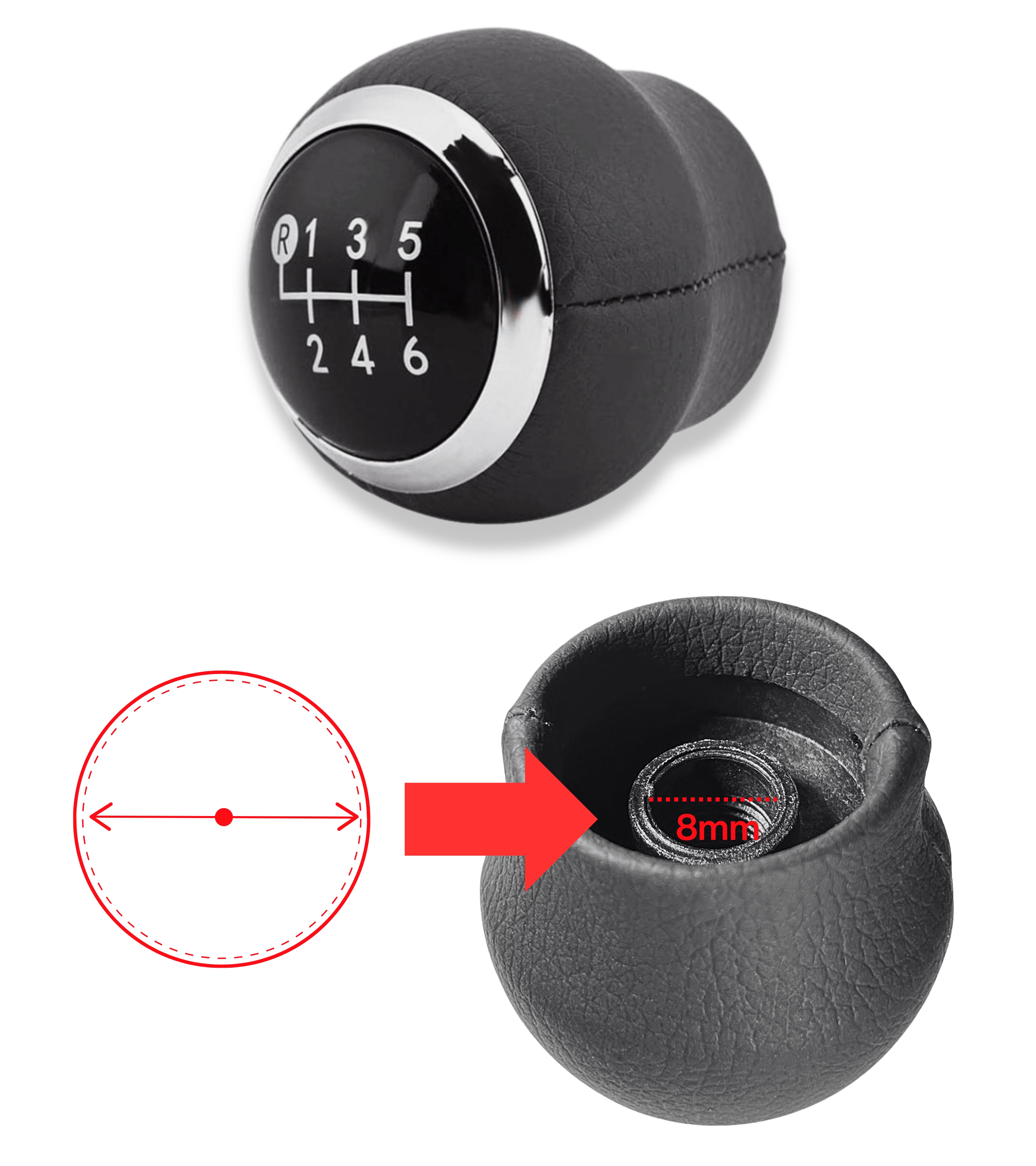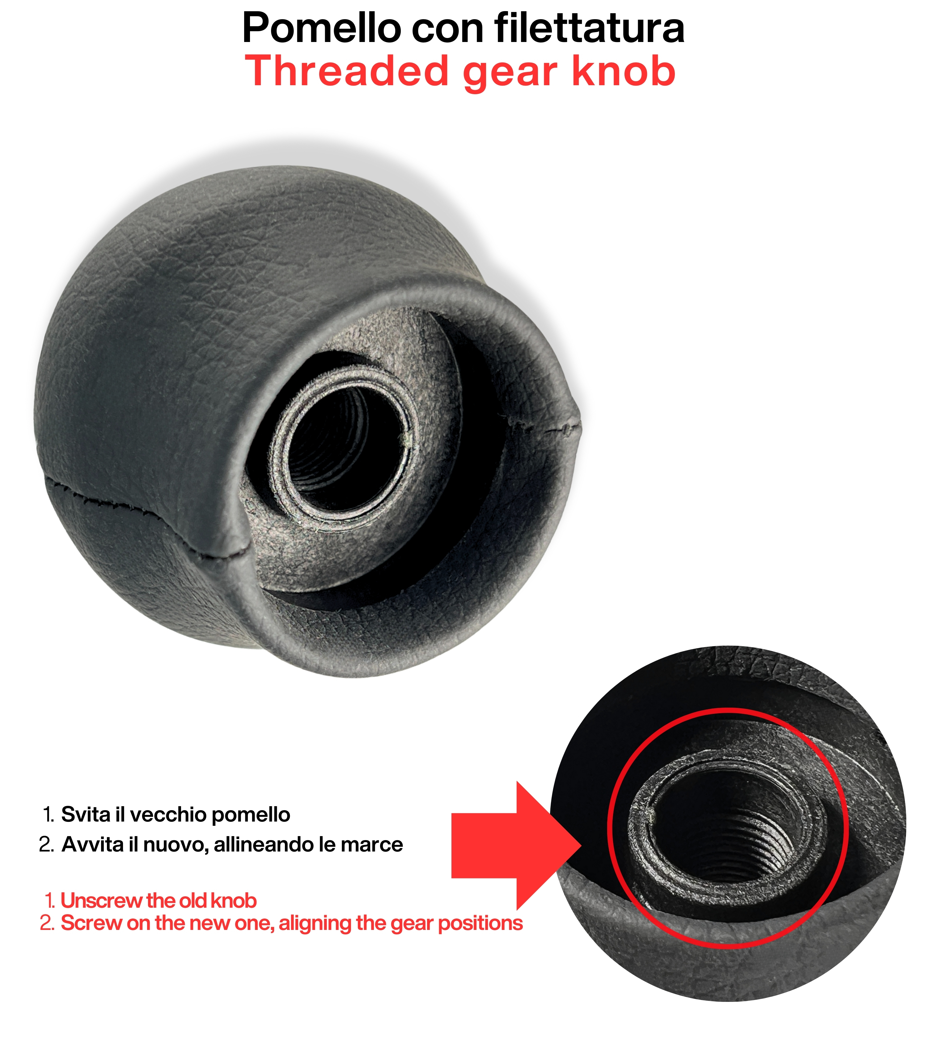 Il pomello è dotato di filettatura per una sostituzione rapida. Basta svitare il vecchio pomello e avvitare quello nuovo fino a che i numeri delle marce siano orientati correttamente. Osservare le immagini nella galleria per assicurarsi che le dimensioni e la forma siano compatibili con la leva del cambio.