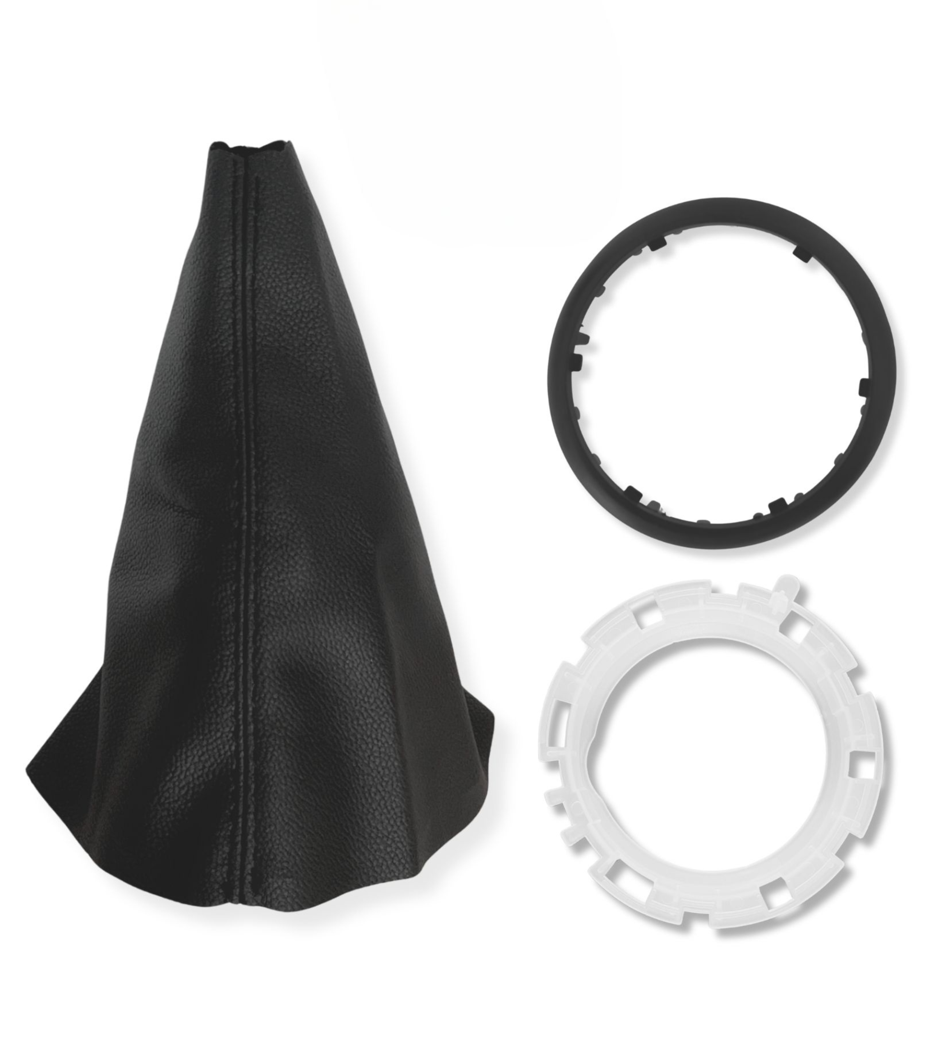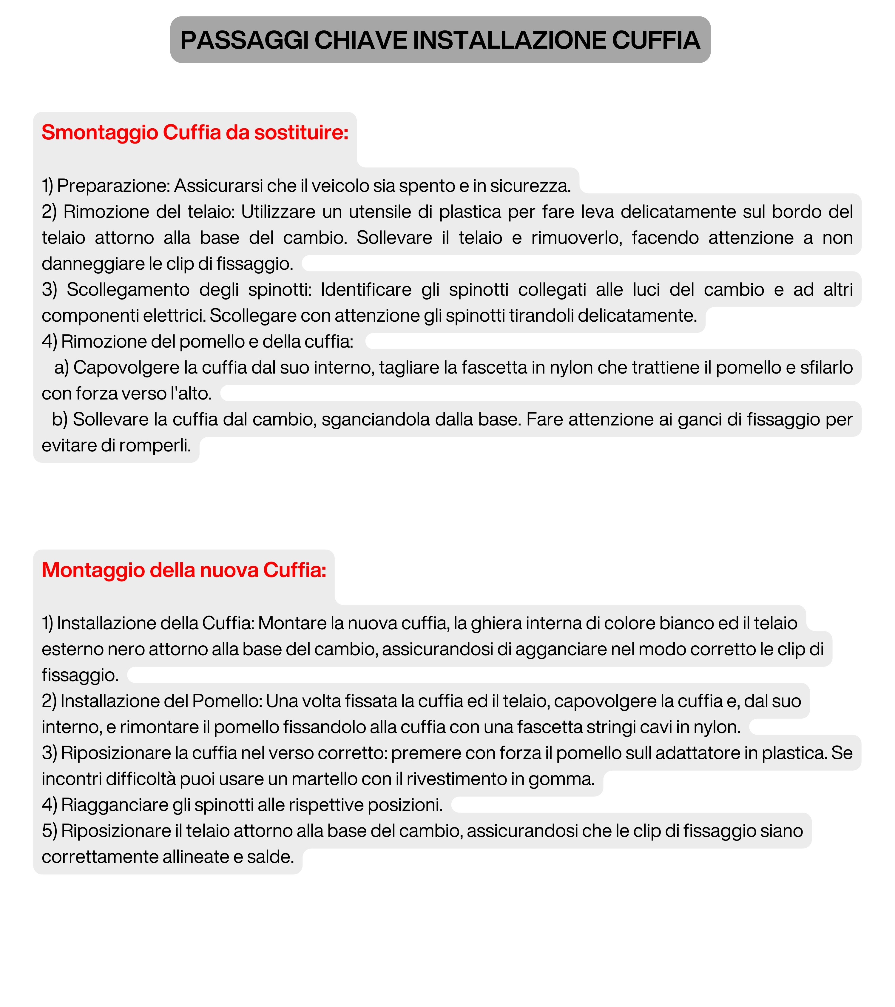 1) Installazione della Cuffia: Montare la nuova cuffia, la ghiera interna di colore bianco ed il telaio esterno nero attorno alla base del cambio, assicurandosi di agganciare nel modo corretto le clip di fissaggio.