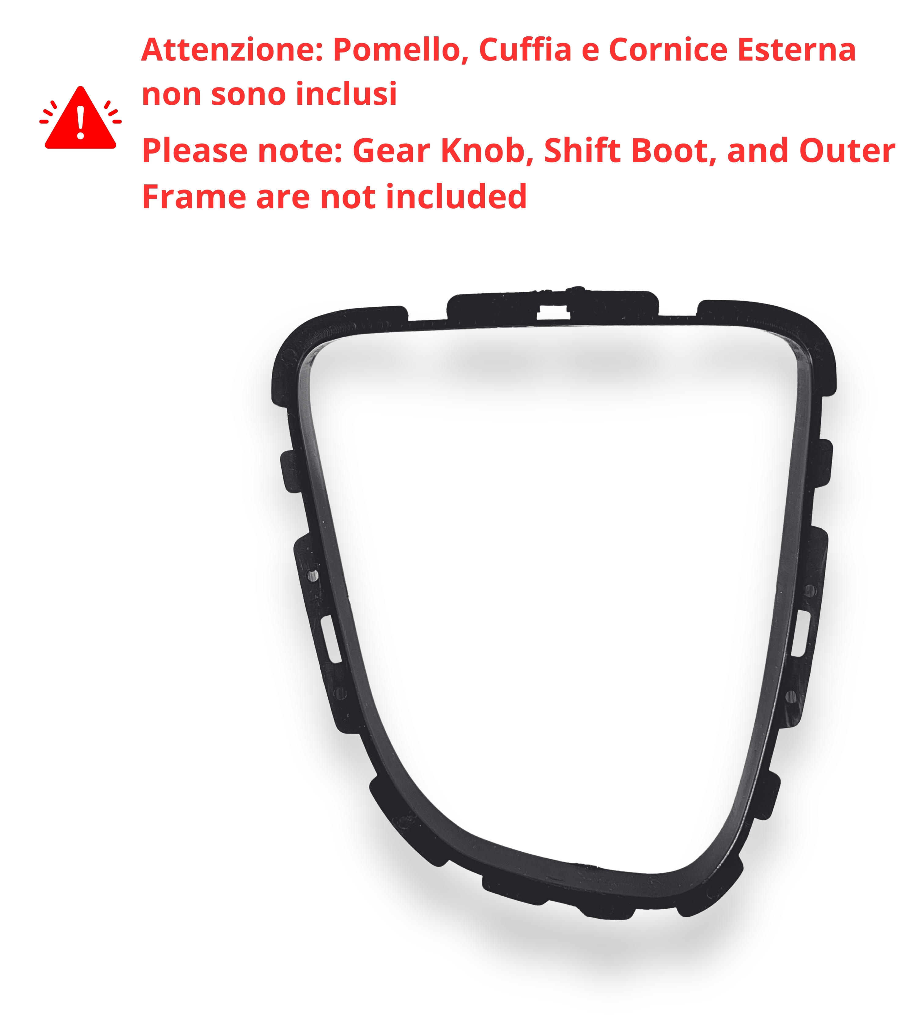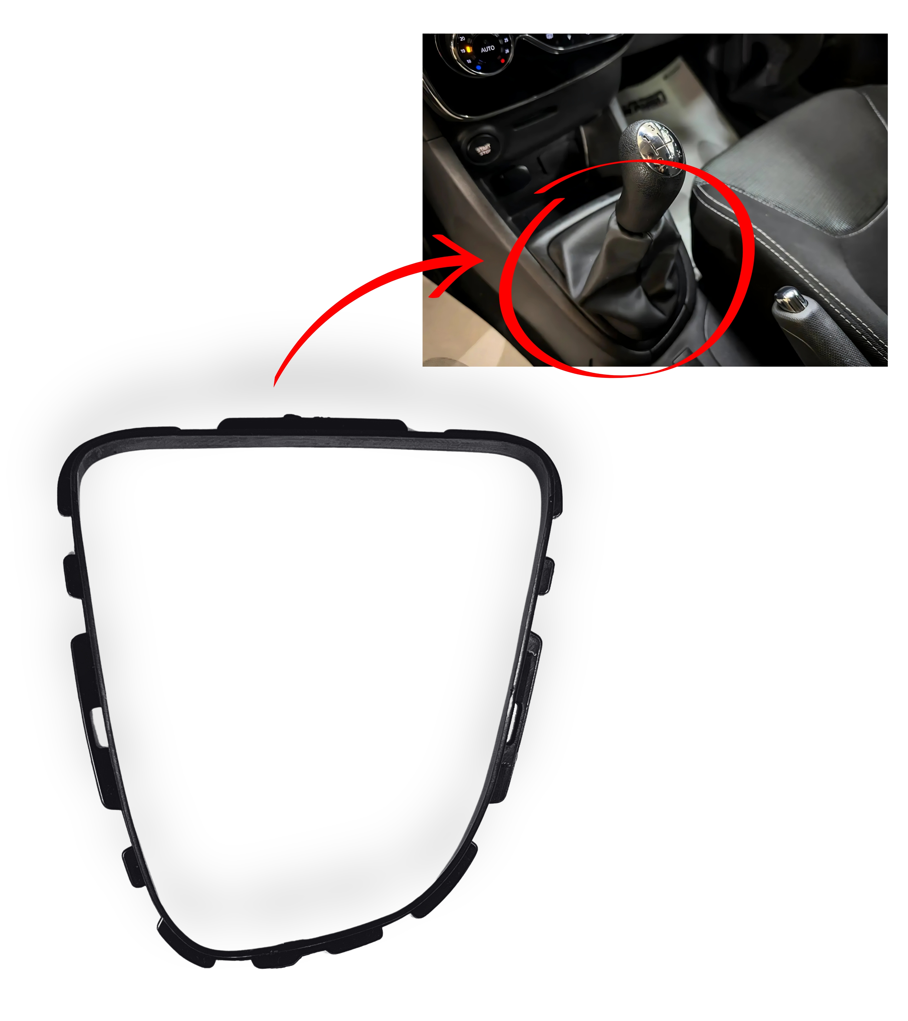 Questo articolo è composto da una ghiera di ritenzione o cornice interna per cuffia leva cambio compatibile con Renault Clio IV (2012-2020). Prima di procedere con l'acquisto, verifica il modello e l'anno della tua auto. Attenzione: cuffia, cornice esterna e pomello non sono inclusi.