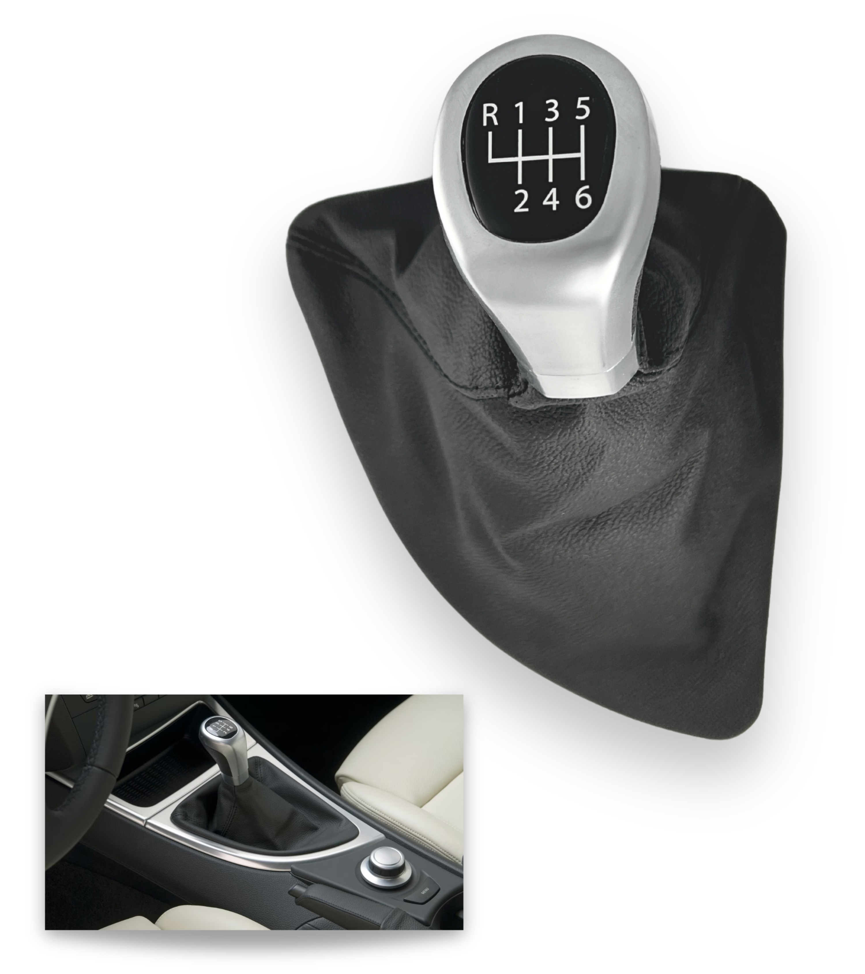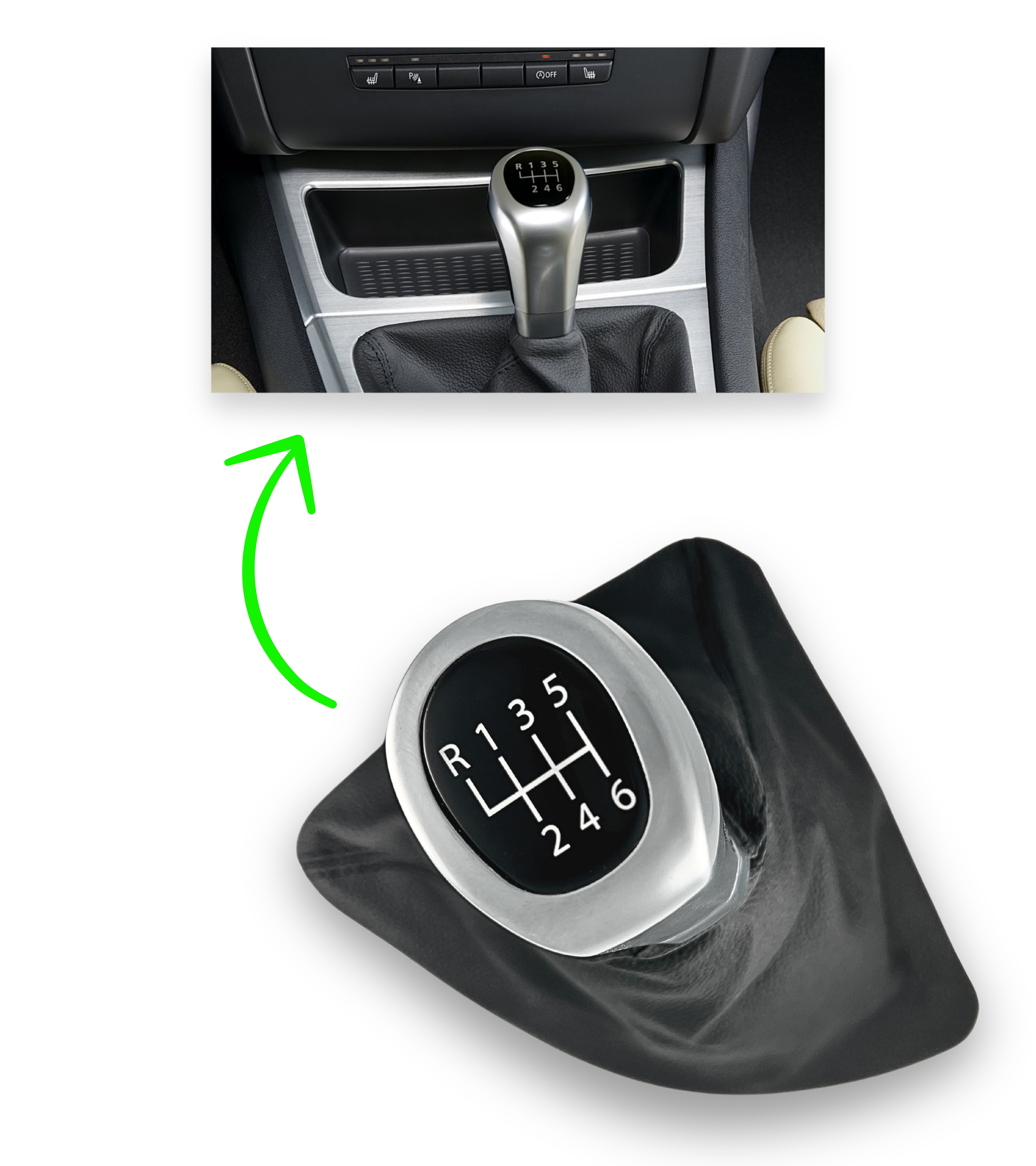 Kit pomello 6 marce per Leva Cambio e Cuffia completa di telaio interno, compatibile con BMW Serie 1, compatibile con E81, E82, E87, E88. Prima di procedere con l'acquisto, verifica il modello della tua auto. Articolo compatibile con codice OEM: 25118036624 25118037304 25117595326.