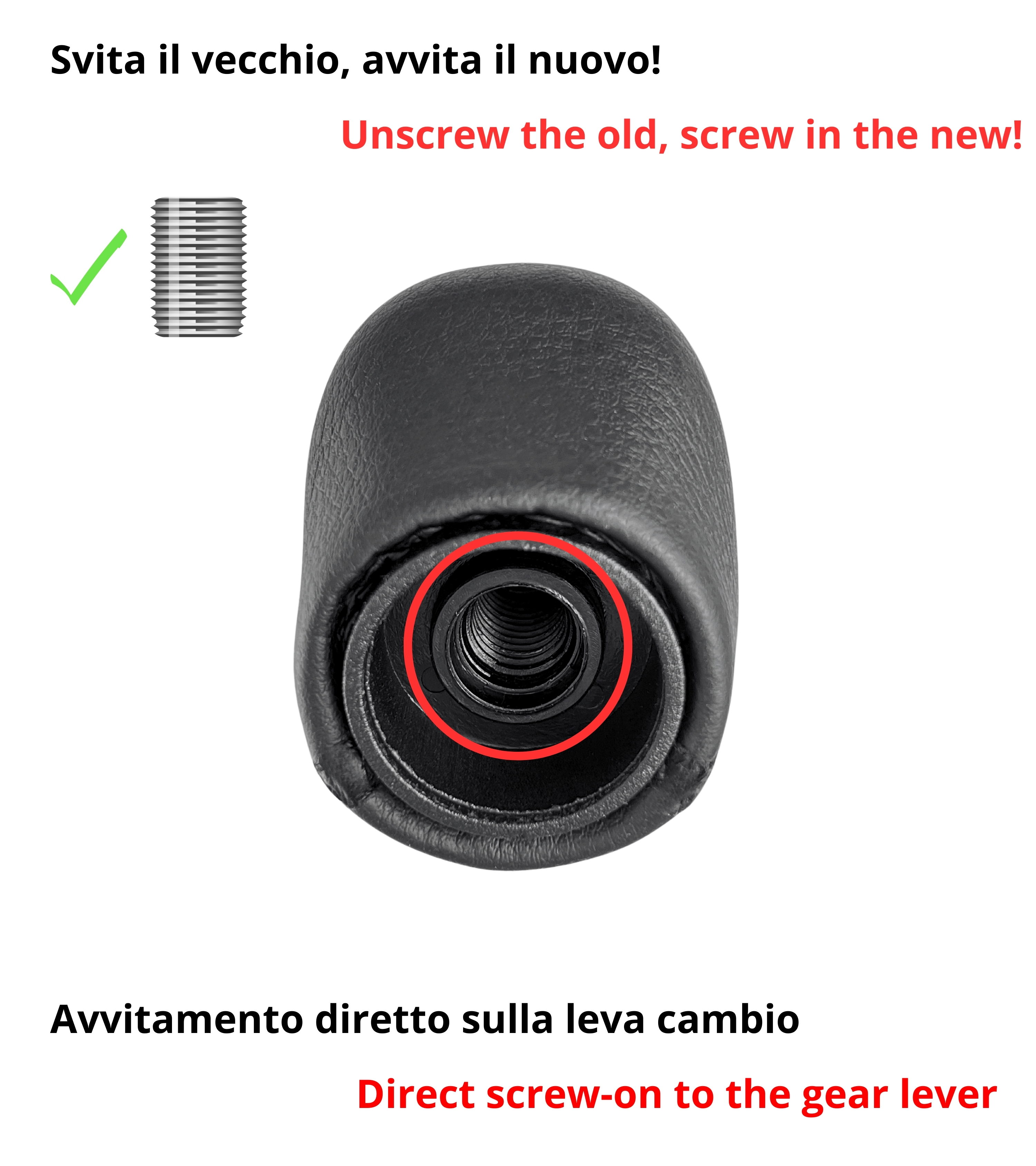 Il pomello si avvita direttamente sulla leva del cambio, rendendo l’installazione semplice e immediata, senza bisogno di adattatori o modifiche.