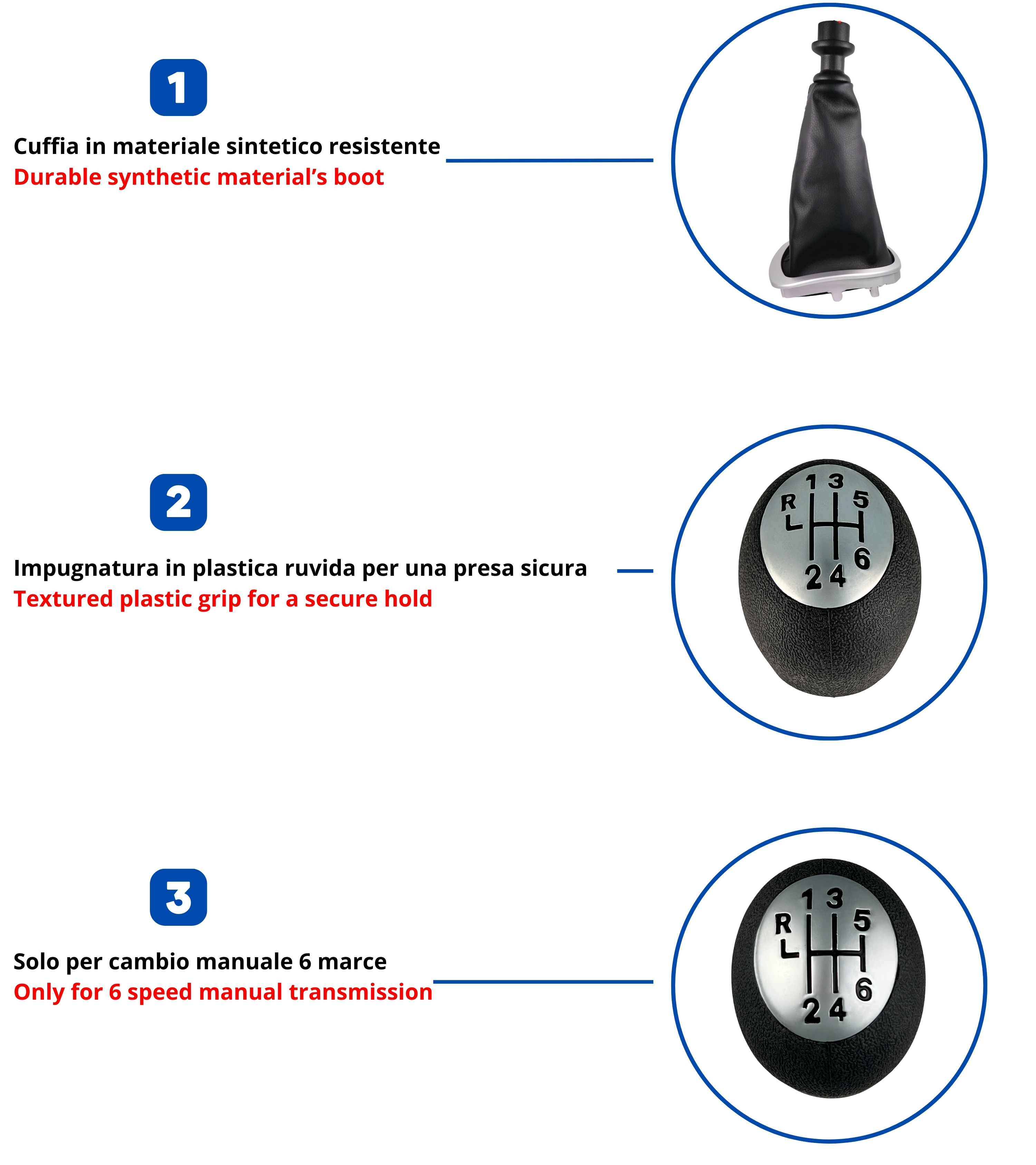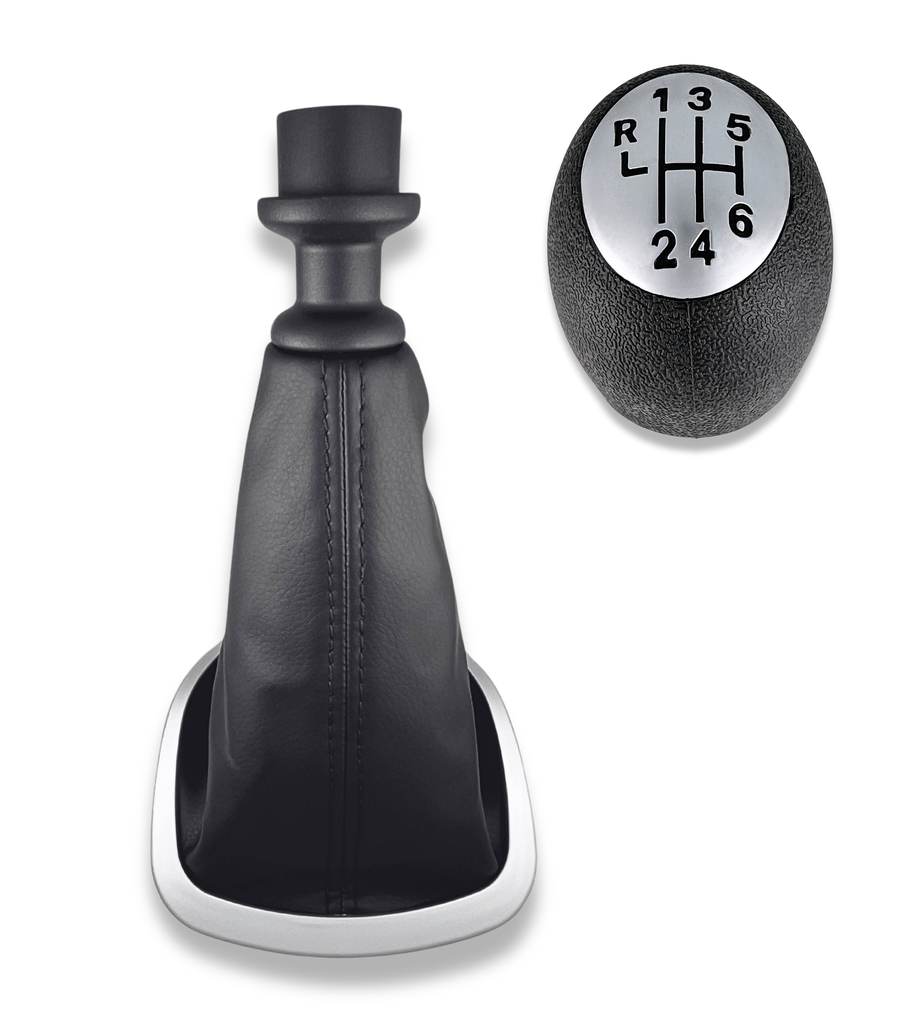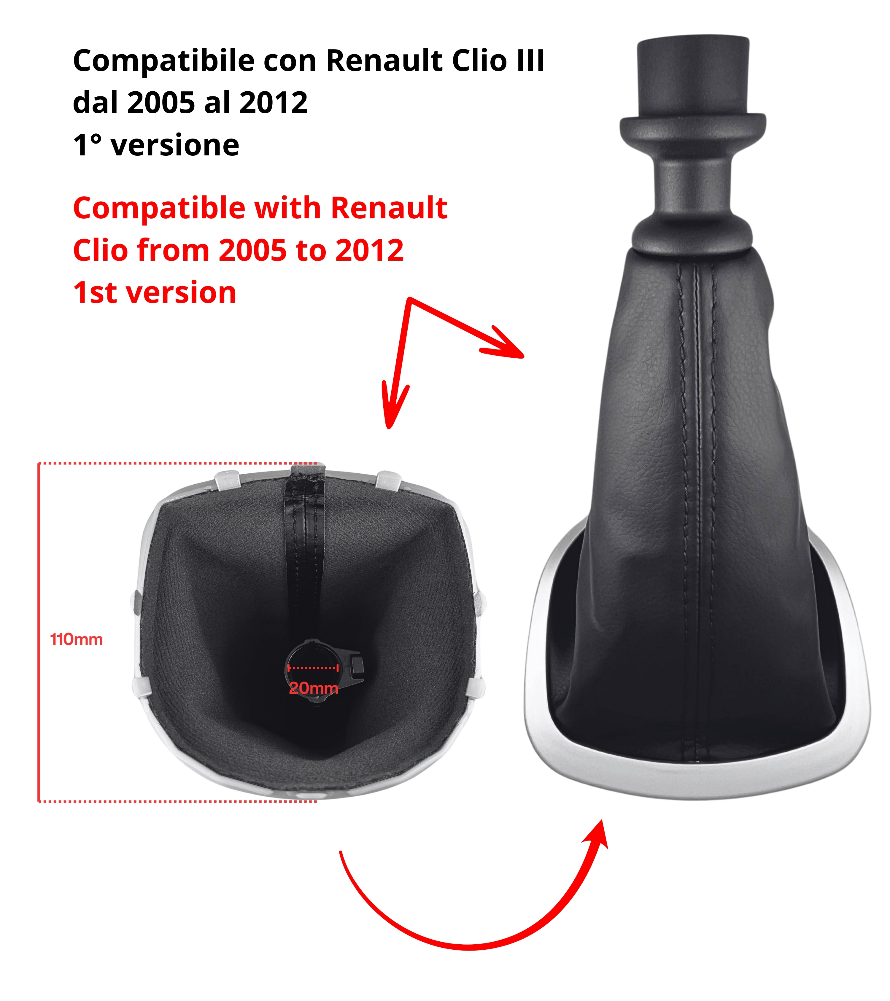 Kit composto da pomello leva cambio manuale 6 marce, cuffia in materiale sintetico nero, cornice argento satinato e telaio-ghiera, compatibile con Renault Clio III Prima Versione 2005-2012.