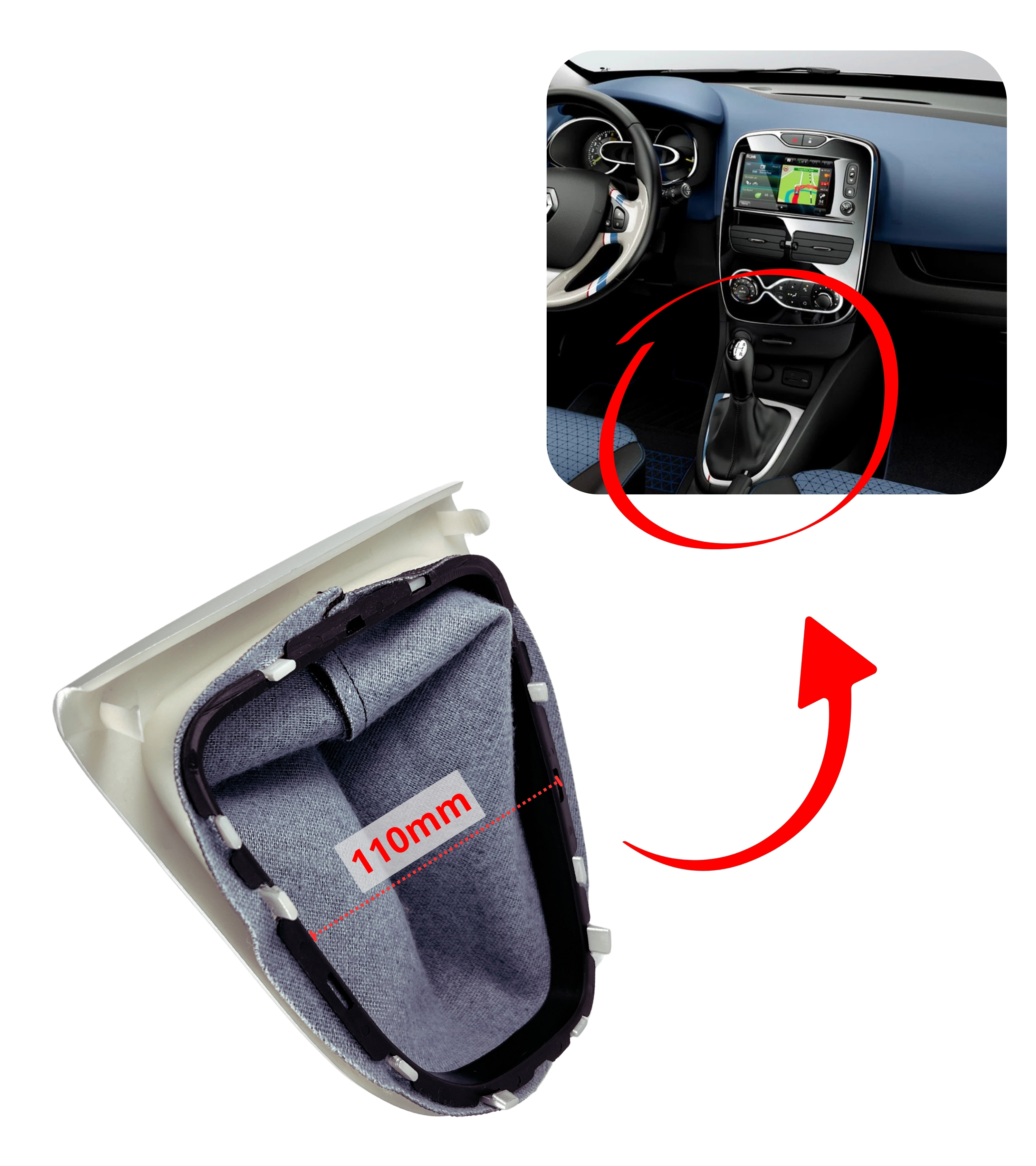 Kit composto da cuffia leva cambio nera, cornice argento/grigio e ghiera di ritenzione, compatibile con Renault Clio IV (2012-2020). Il kit arriva già preassemblato, pronto per il montaggio senza bisogno di adattamenti o modifiche.