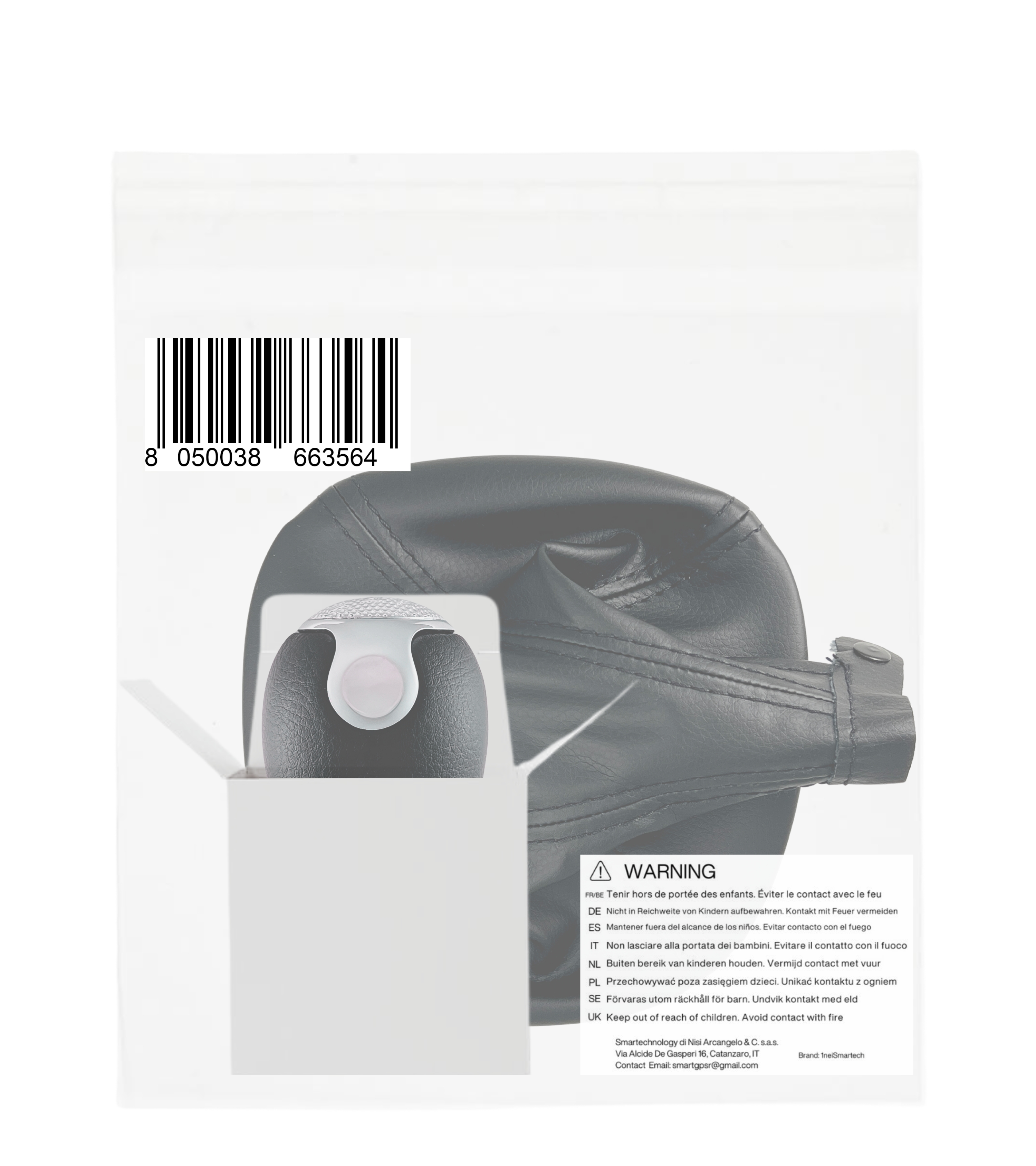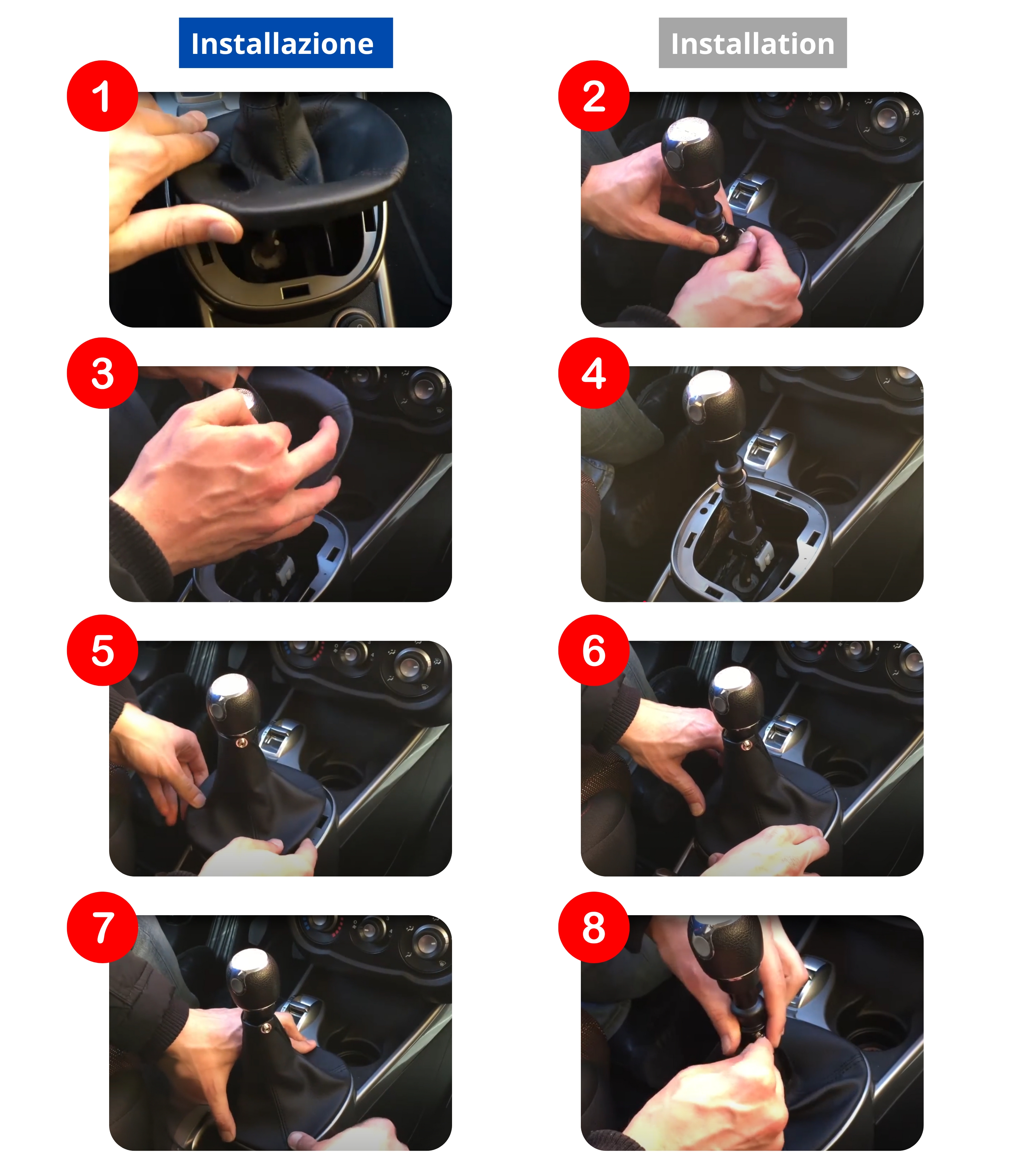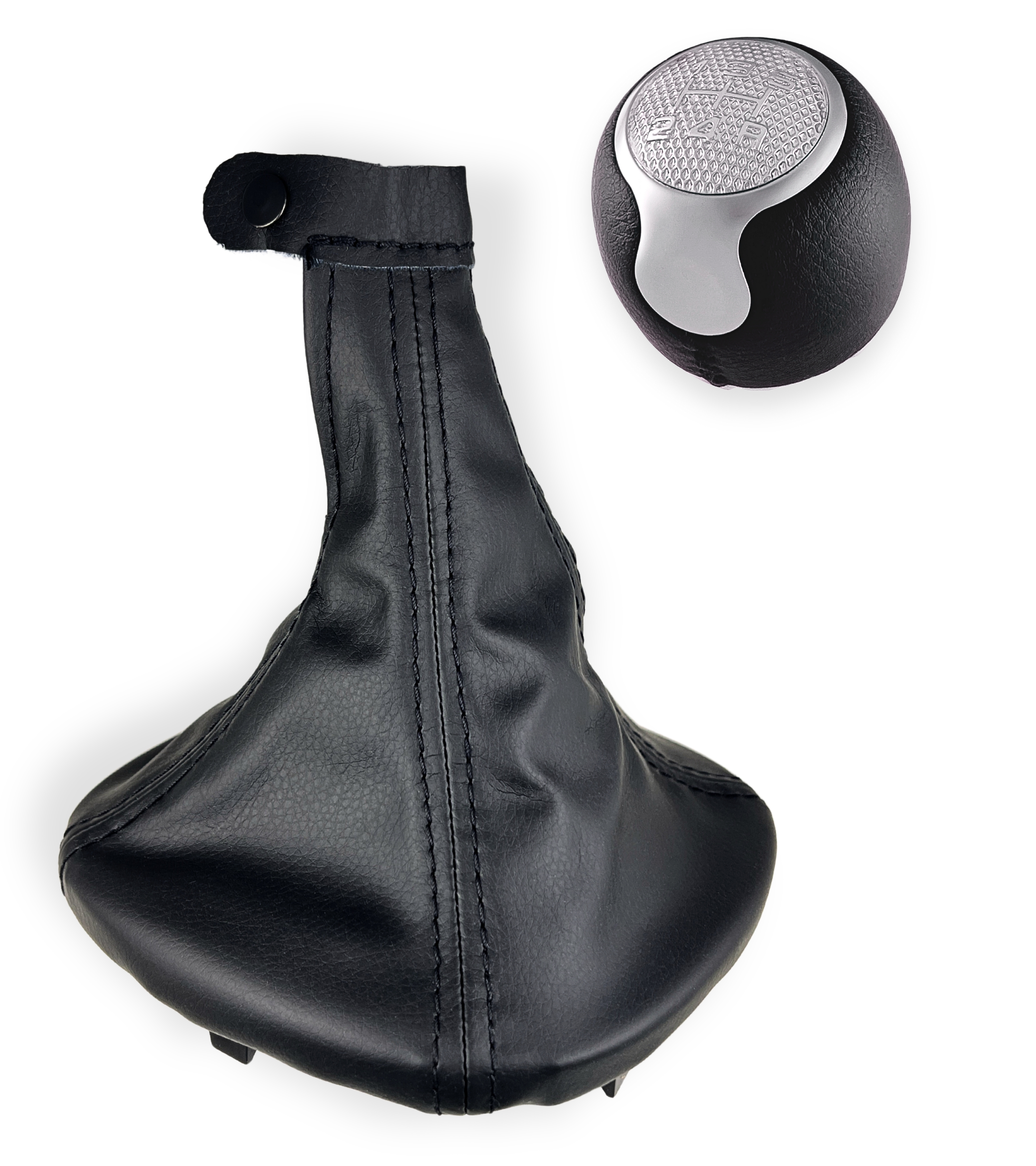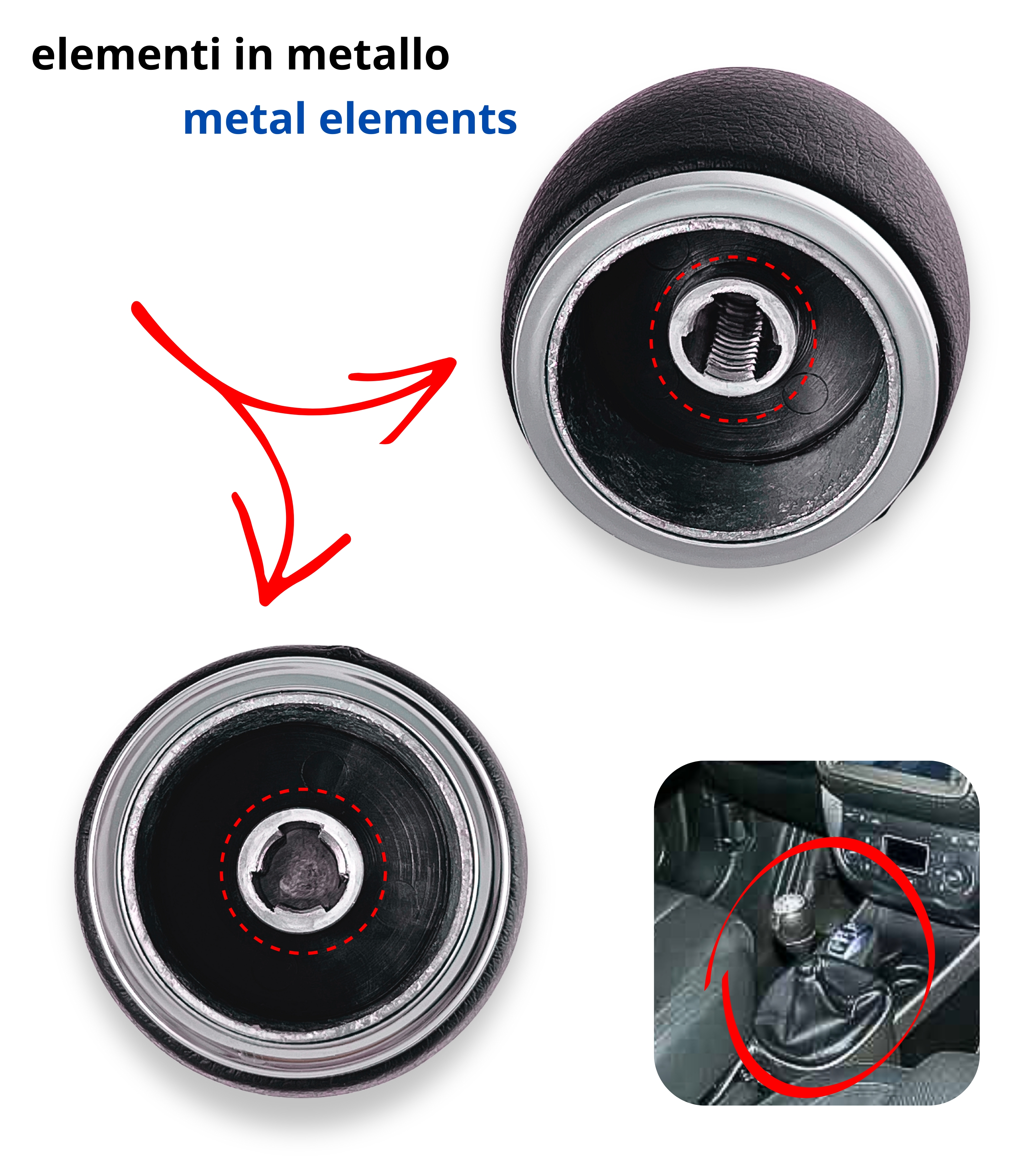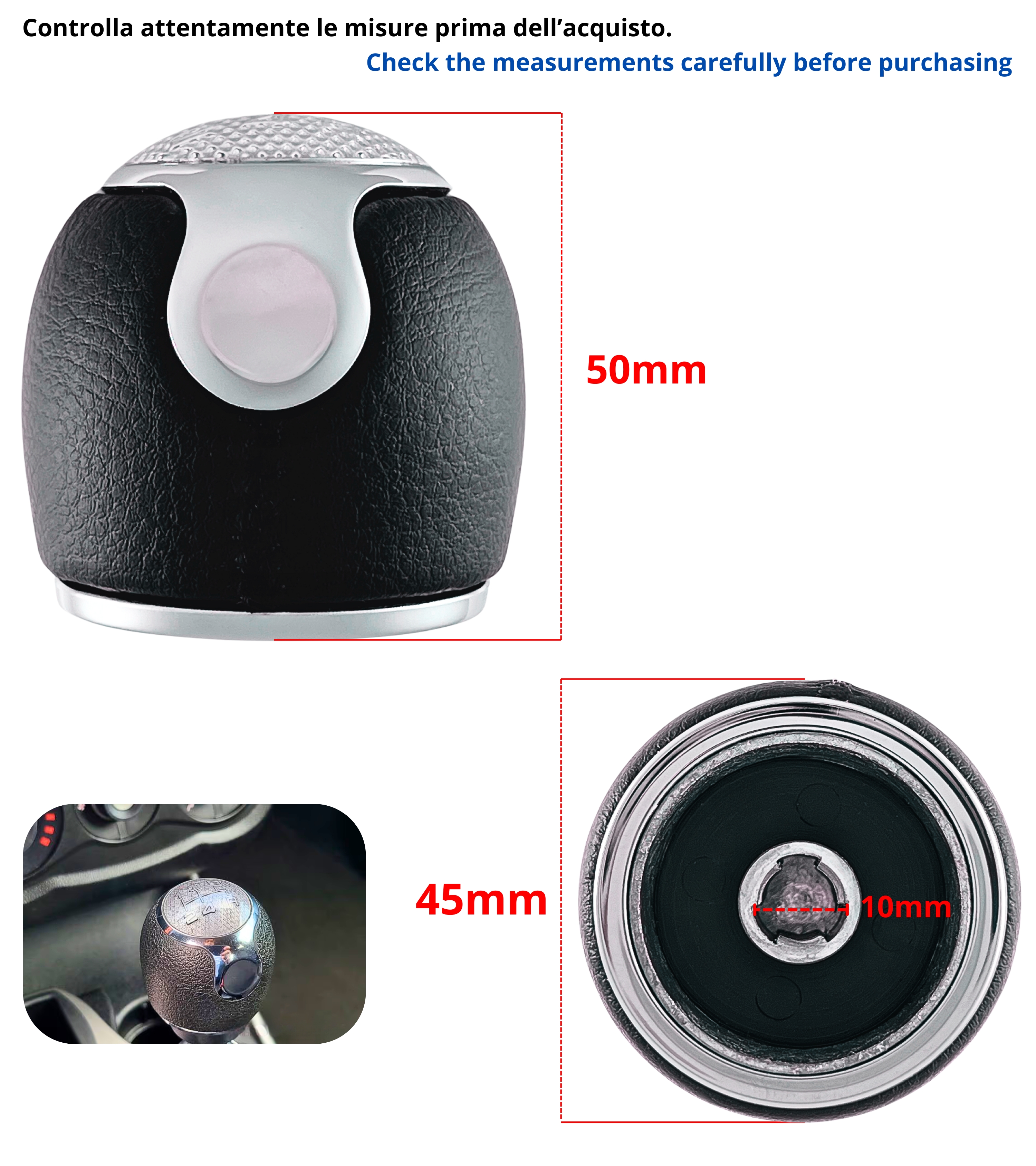 Impugnatura nera in materiale sintetico con lente superiore color argento satinato. I numeri delle marce sono incisi in colore argento per una perfetta leggibilità. Foro di innesto in metallo per una connessione stabile e duratura alla leva cambio. Retromarcia in basso a destra.