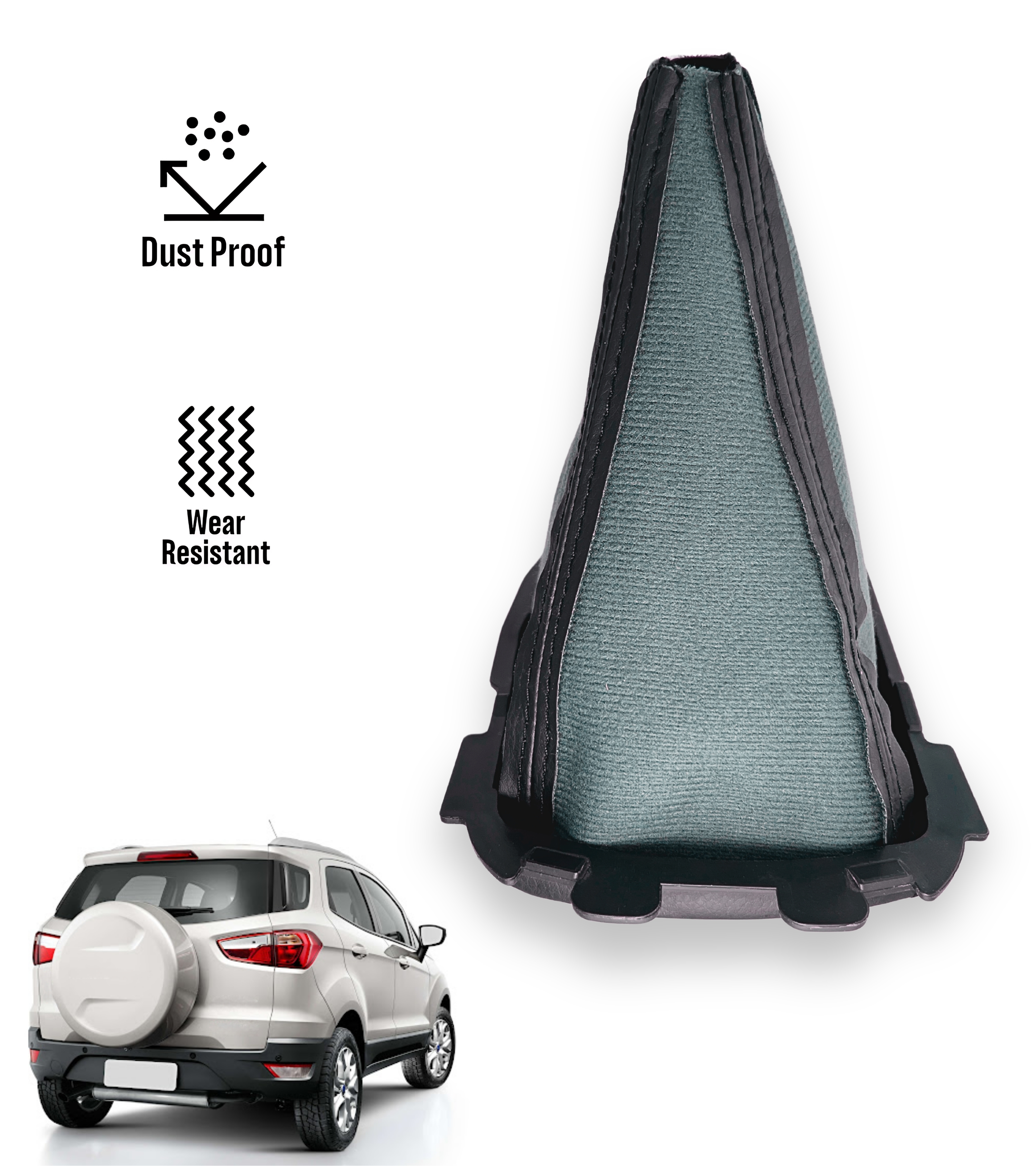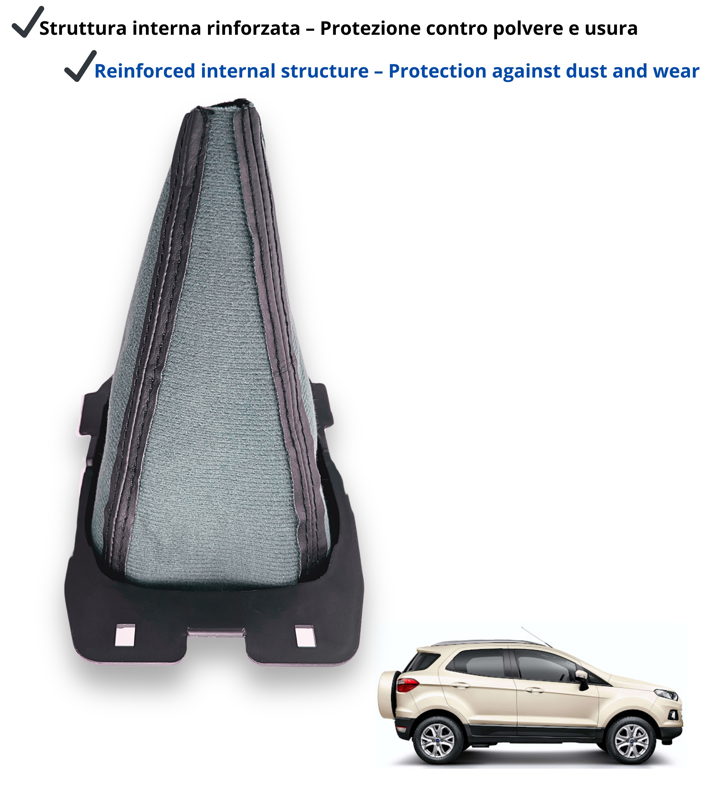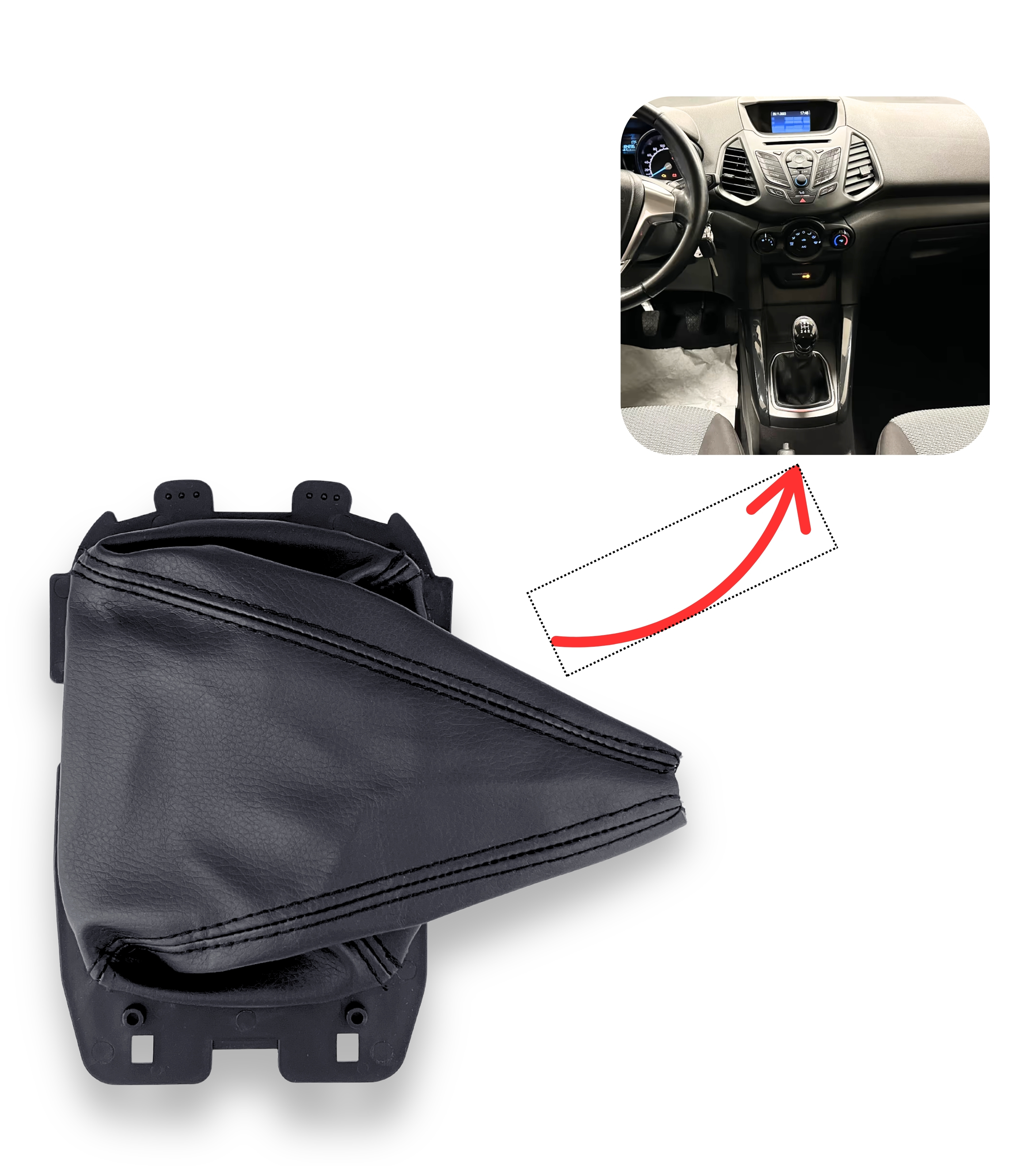 Cuffia per leva cambio compatibile con Ford EcoSport seconda generazione (B515) prodotta dal 2014 al 2018, versione pre-restyling con cambio manuale a 5 o 6 marce, in base alla motorizzazione. Una soluzione perfetta per sostituire la cuffia usurata o danneggiata, riportando eleganza e funzionalità all’interno della tua auto.