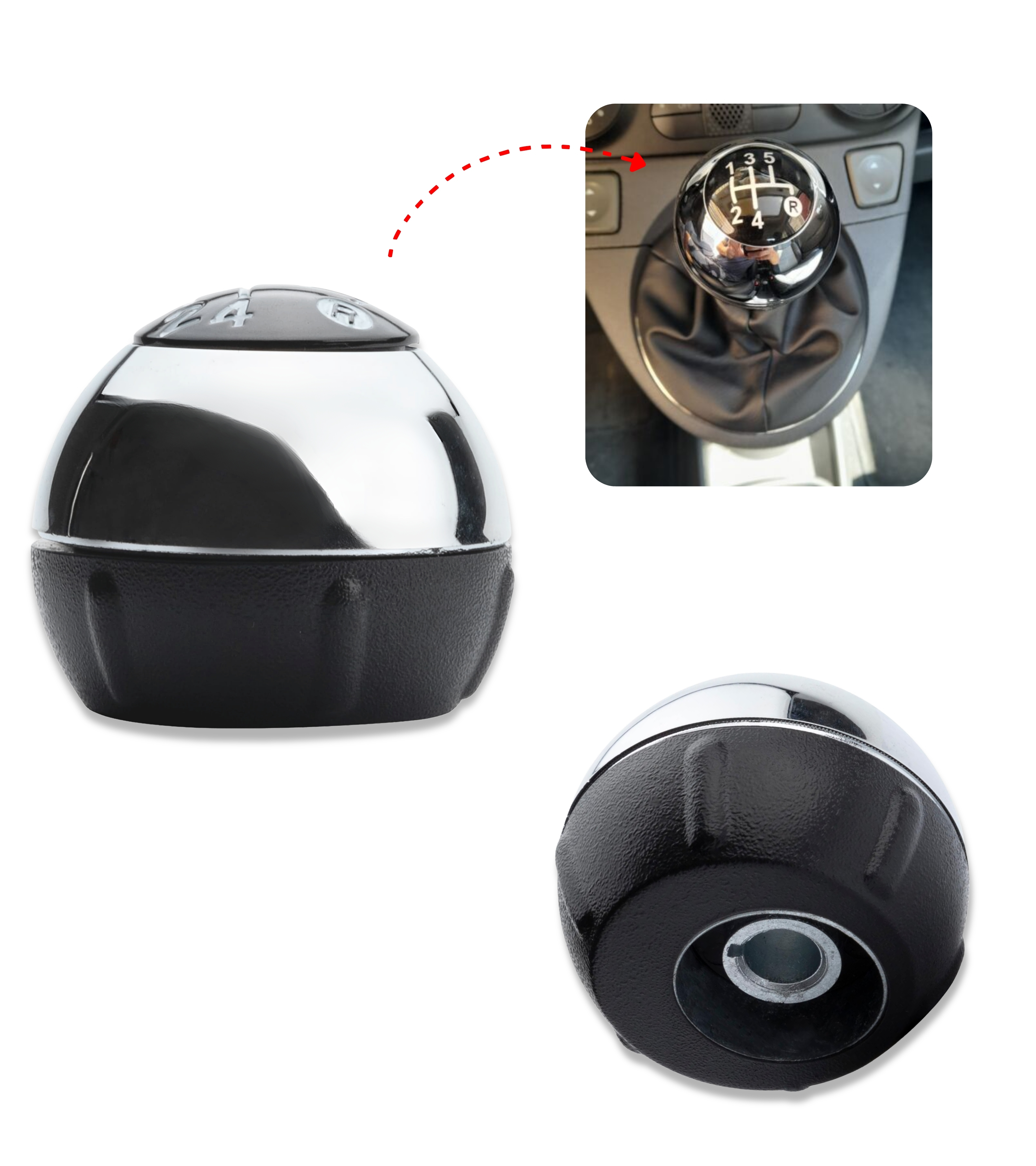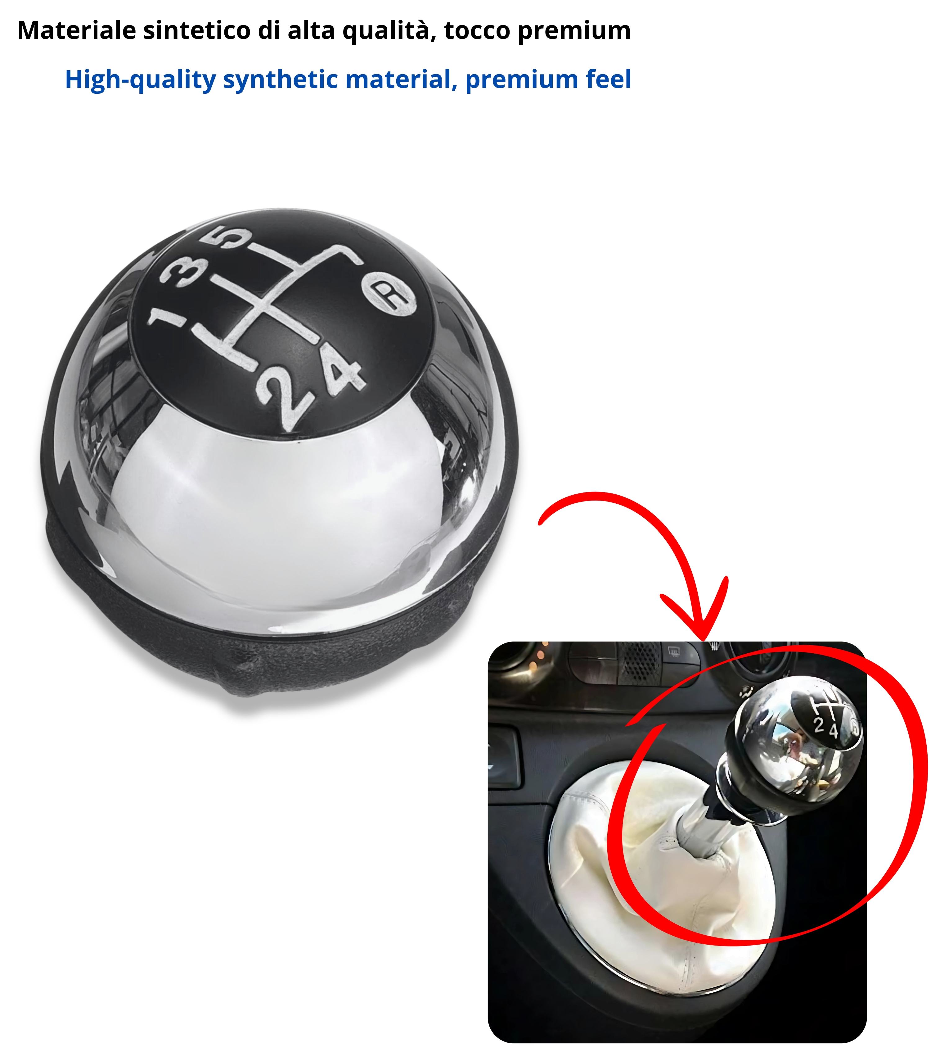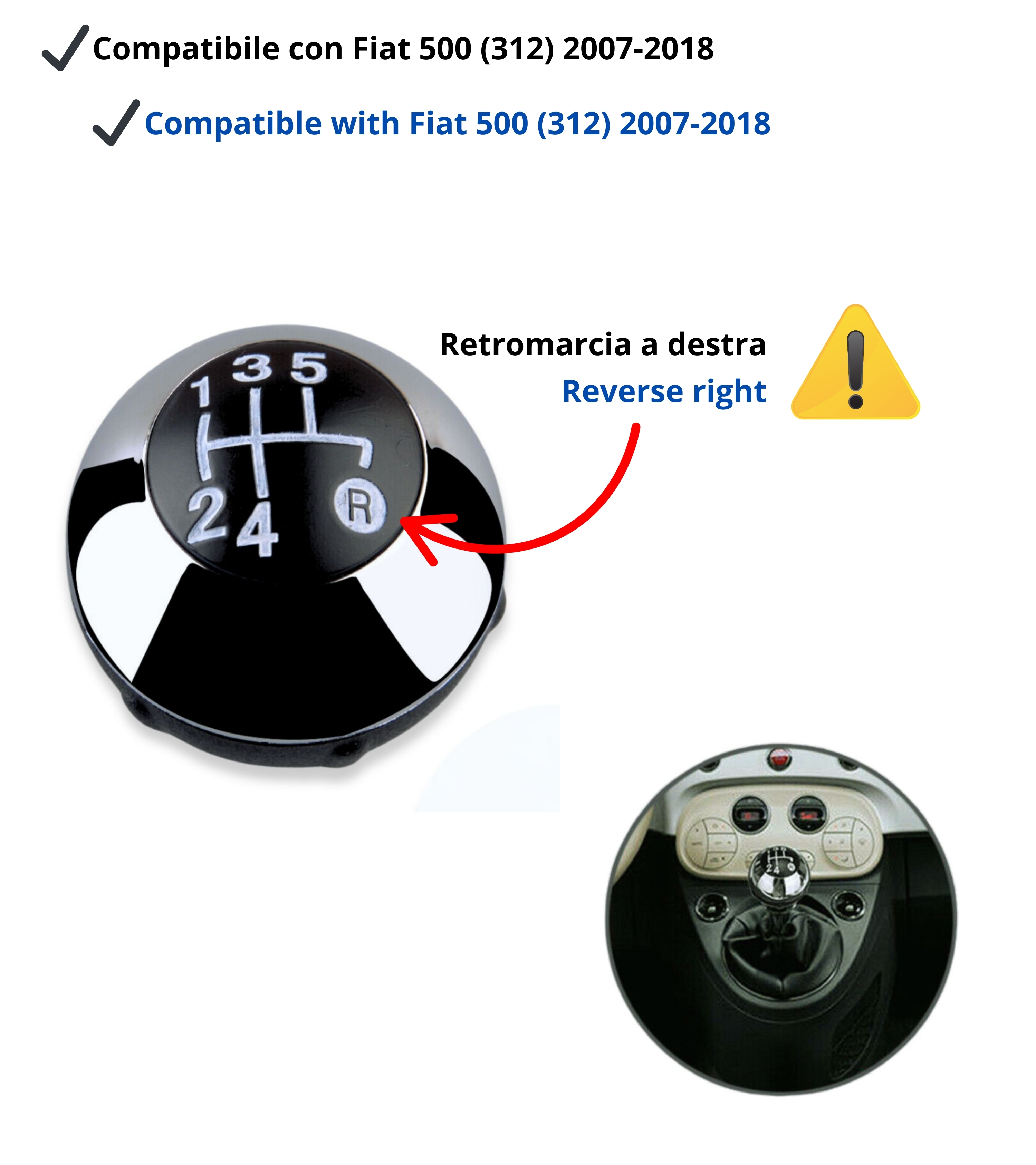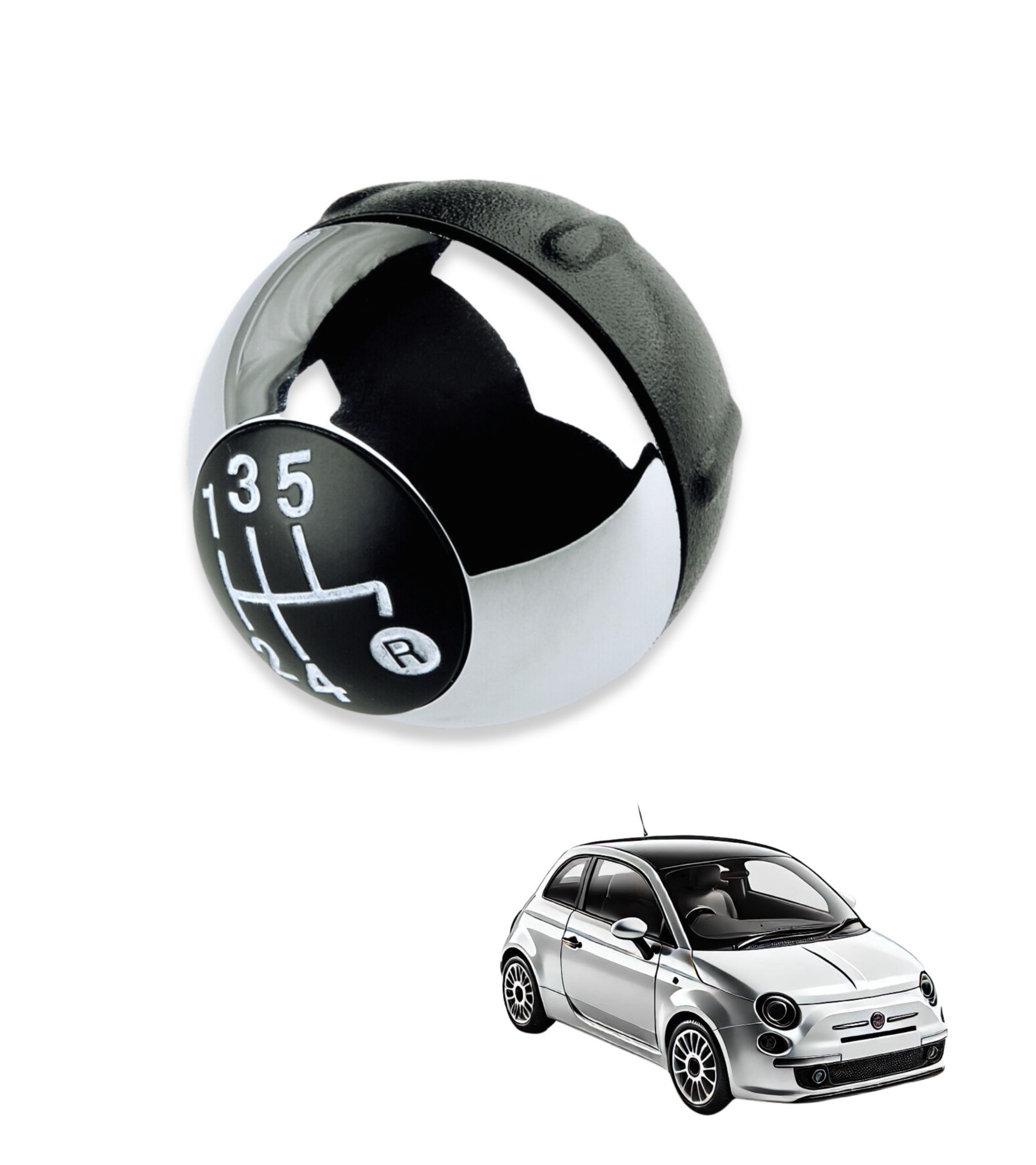 Pomello leva cambio a 5 marce compatibile con Fiat 500 (312) e compatibile con Fiat 500C, prodotti dal 2007 al 2018. Il ricambio ideale per sostituire il pomello usurato mantenendo estetica e funzionalità originali.