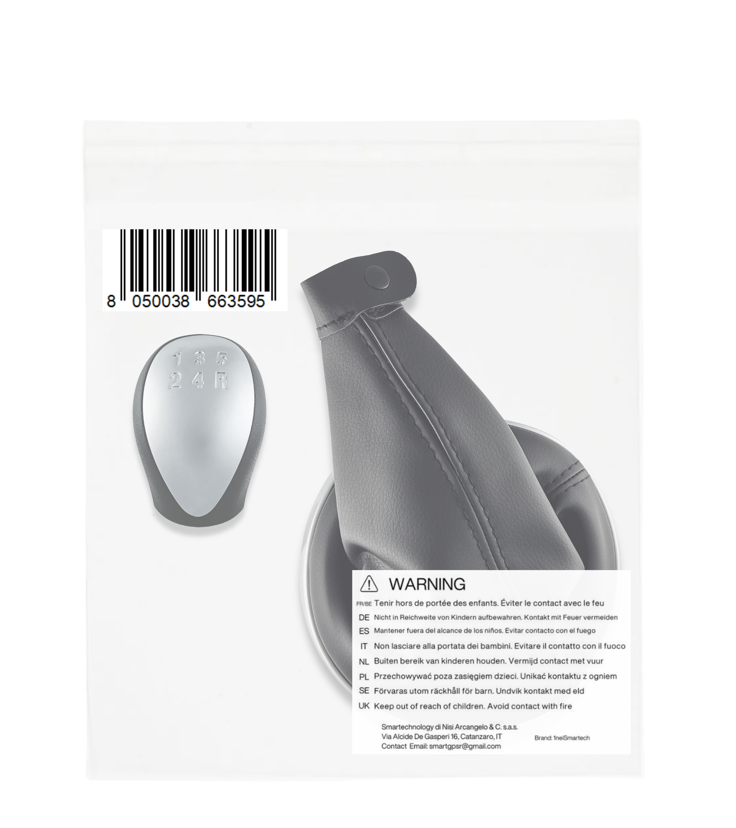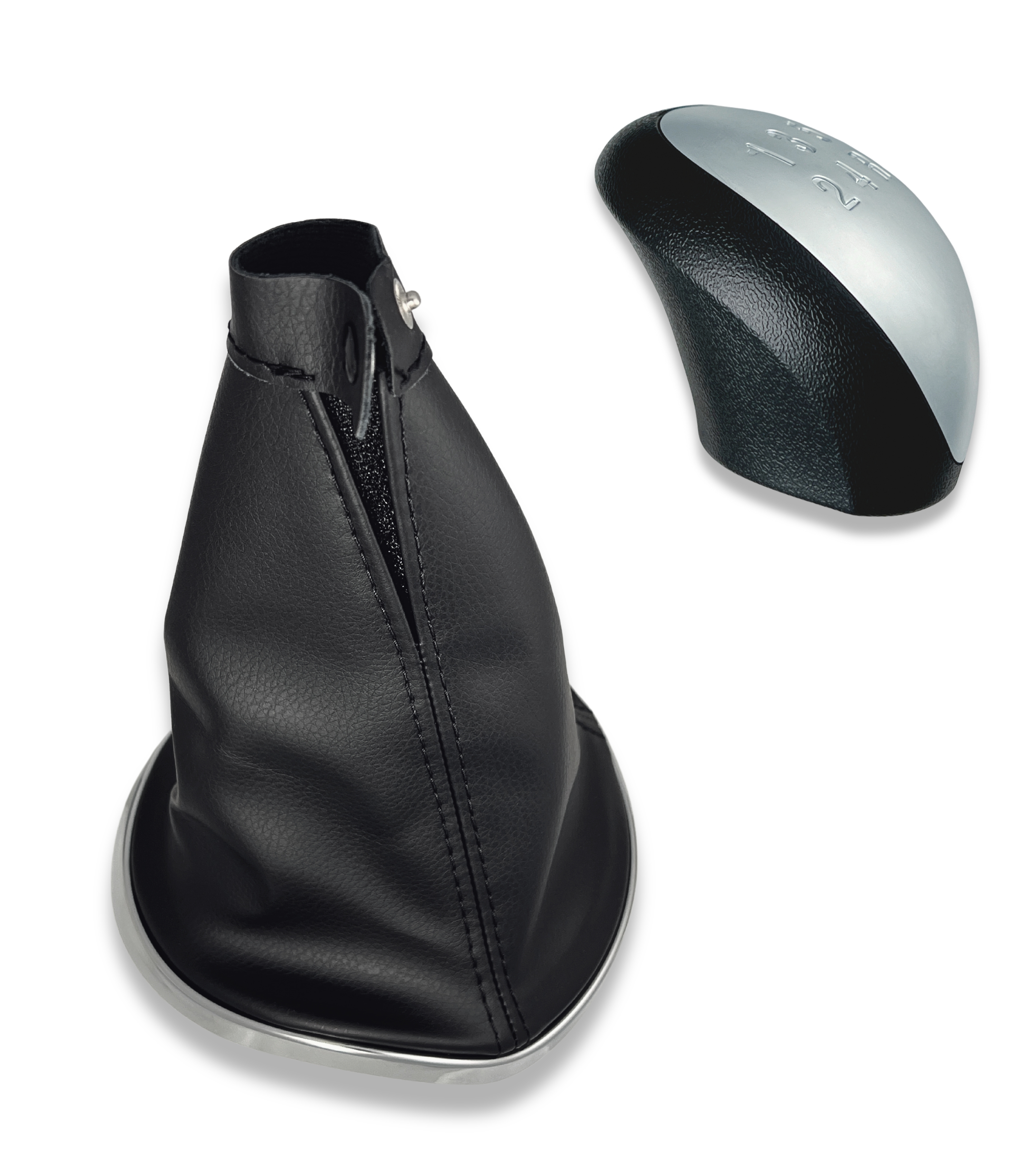 Pomello dal design compatto ed ergonomico, con impugnatura in materiale sintetico leggermente ruvido per un'ottima presa. La placca superiore è di colore argento satinato con numeri delle marce incisi in tinta, per un look elegante e ben leggibile. Progettato per un’integrazione naturale con la plancia dell’auto.