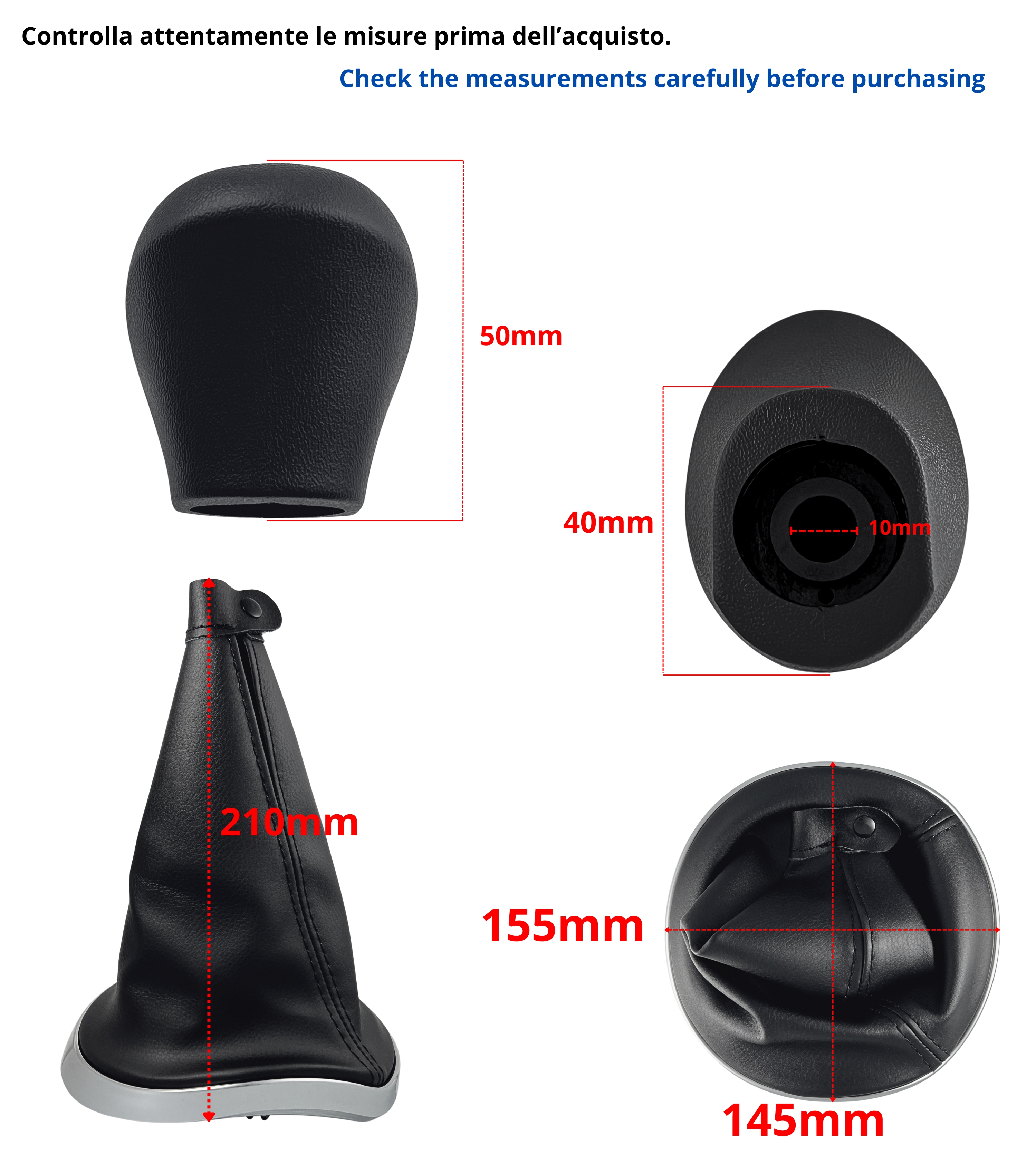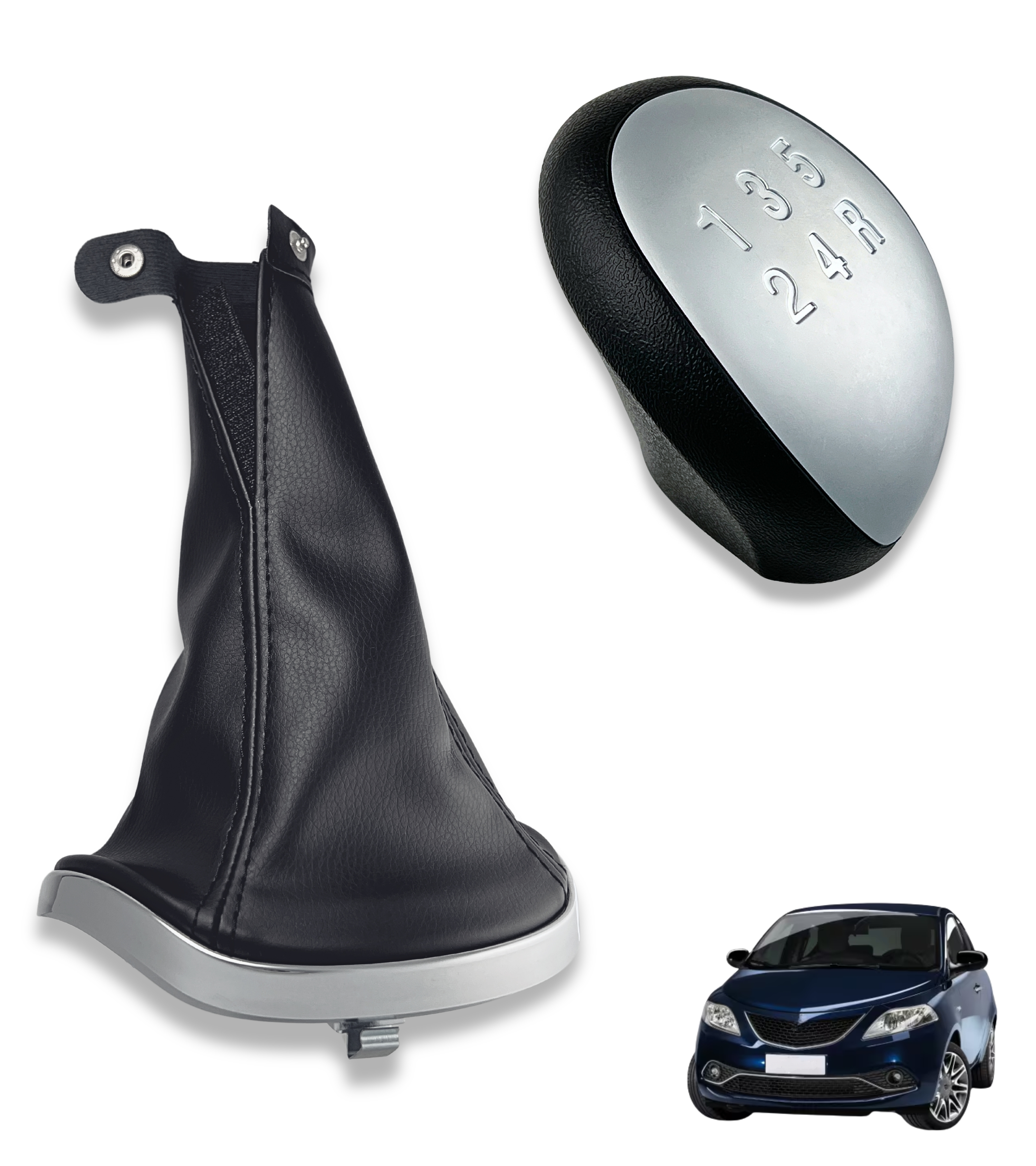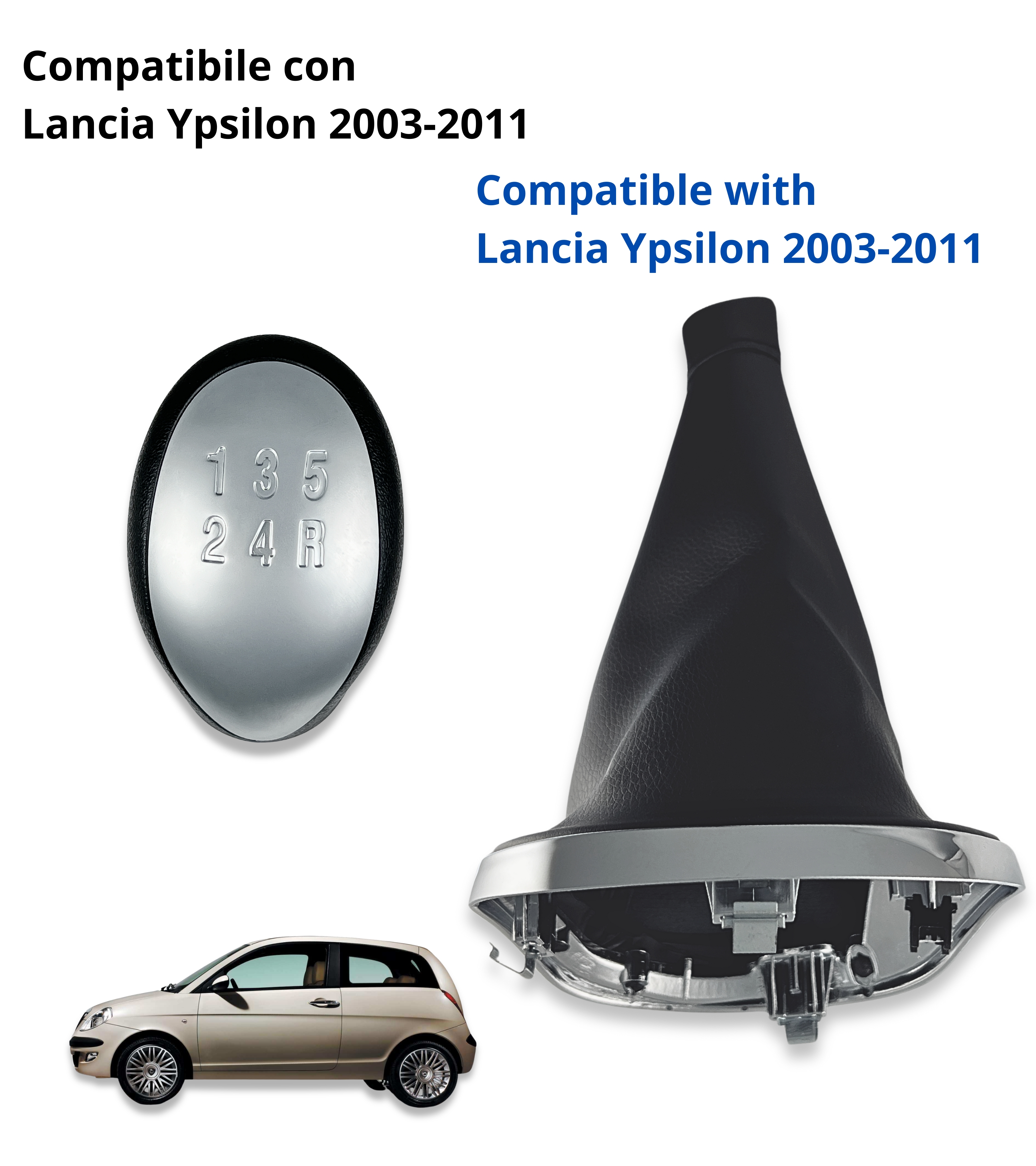 Kit completo composto da pomello 5 marce e cuffia nera con cornice e telaio interno integrati, compatibile con Lancia Ypsilon (843) prodotte dal 2003 al 2011. Una soluzione pratica per sostituire un vecchio pomello e una cuffia usurata, migliorando l’estetica e la funzionalità dell’abitacolo.