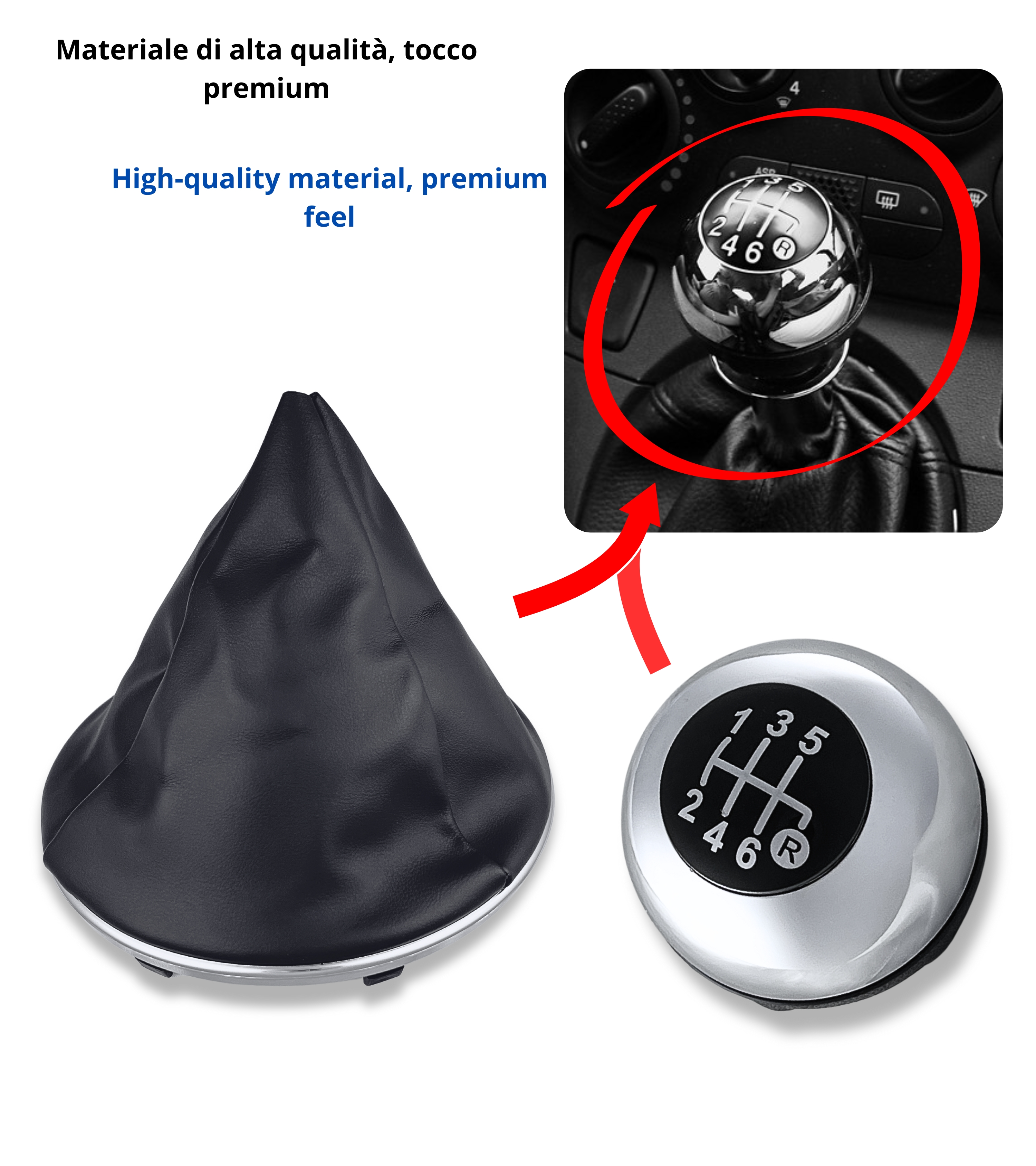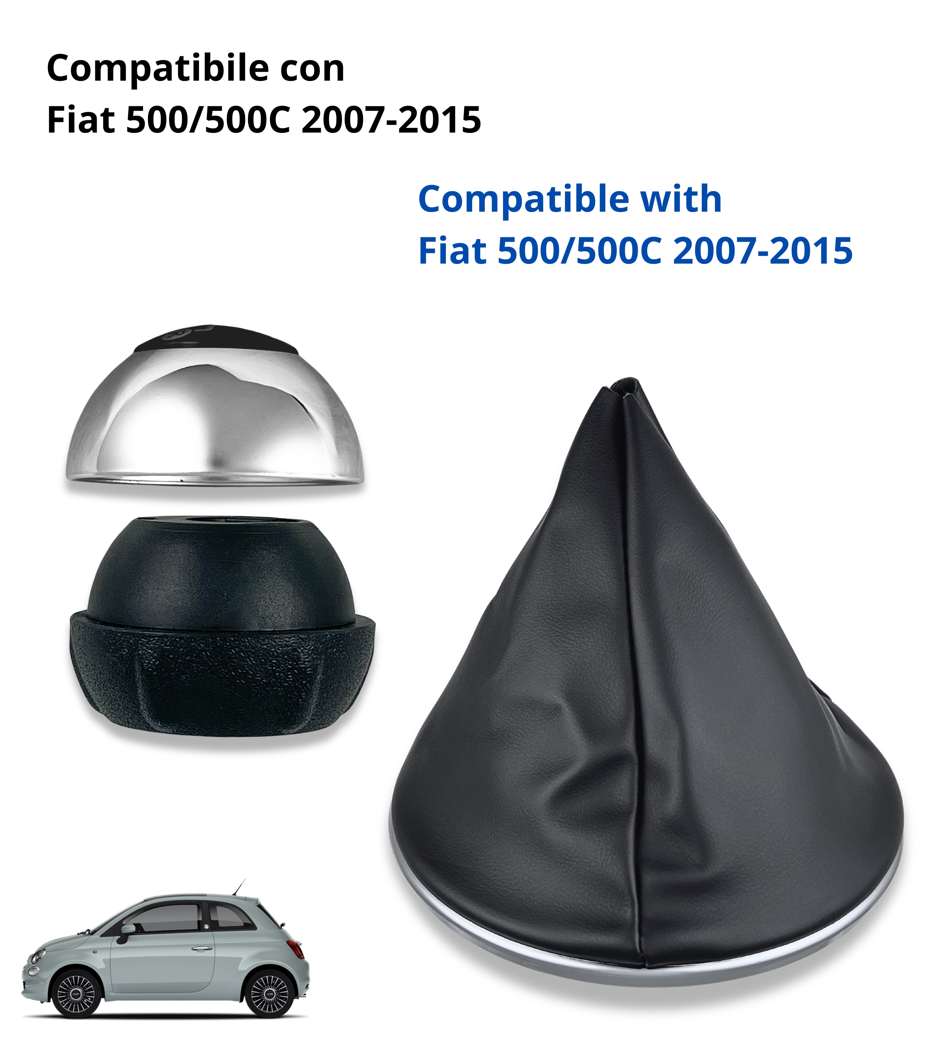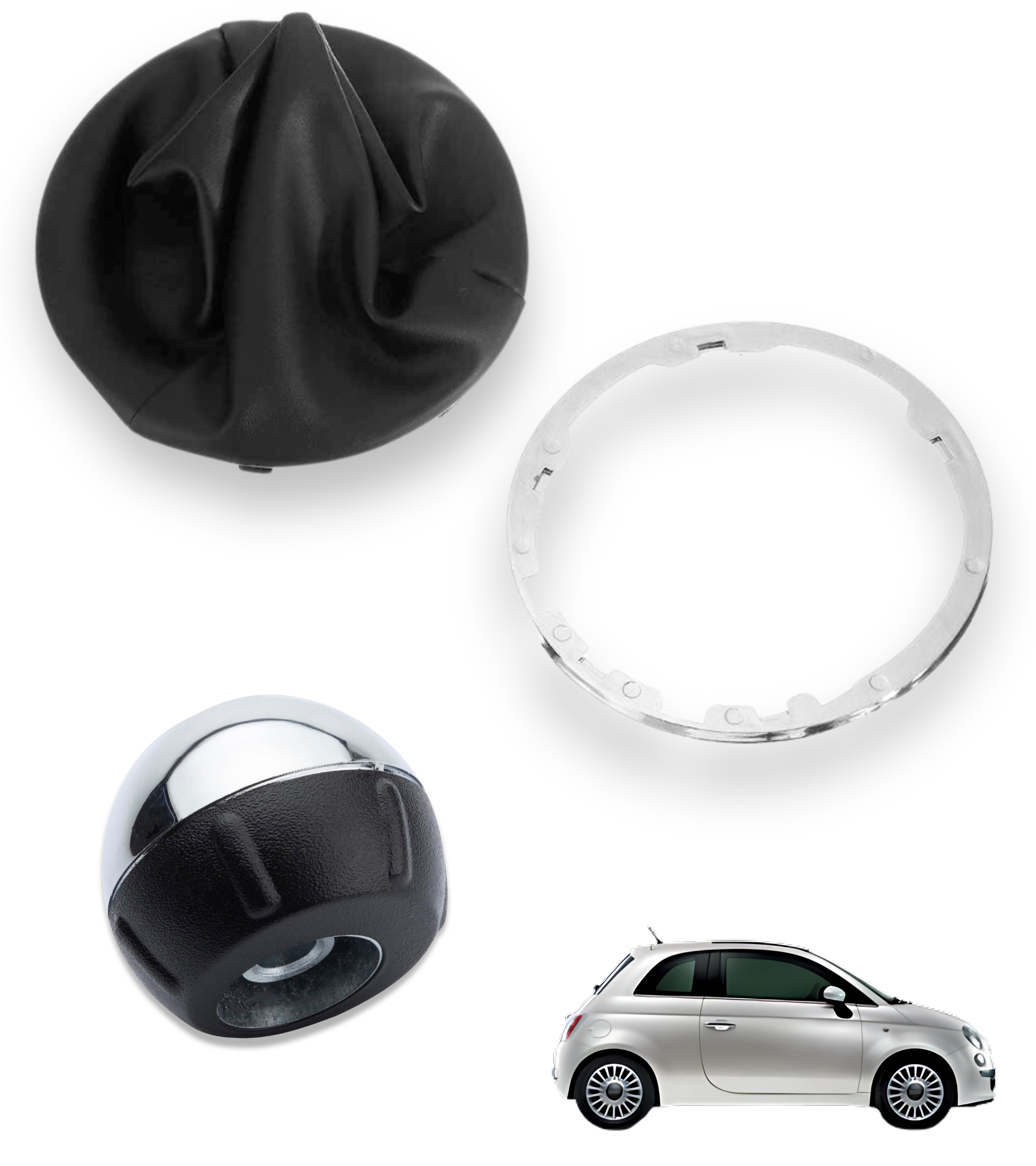 Kit completo composto da pomello leva cambio 6 marce e cuffia con cornice esterna e ghiera di ritenzione interna, compatibile con Fiat 500 (312) e compatibile con Fiat 500C dal 2007 in poi. Una soluzione elegante e funzionale per rinnovare la leva del cambio, ripristinandone l’estetica e la praticità originale.
