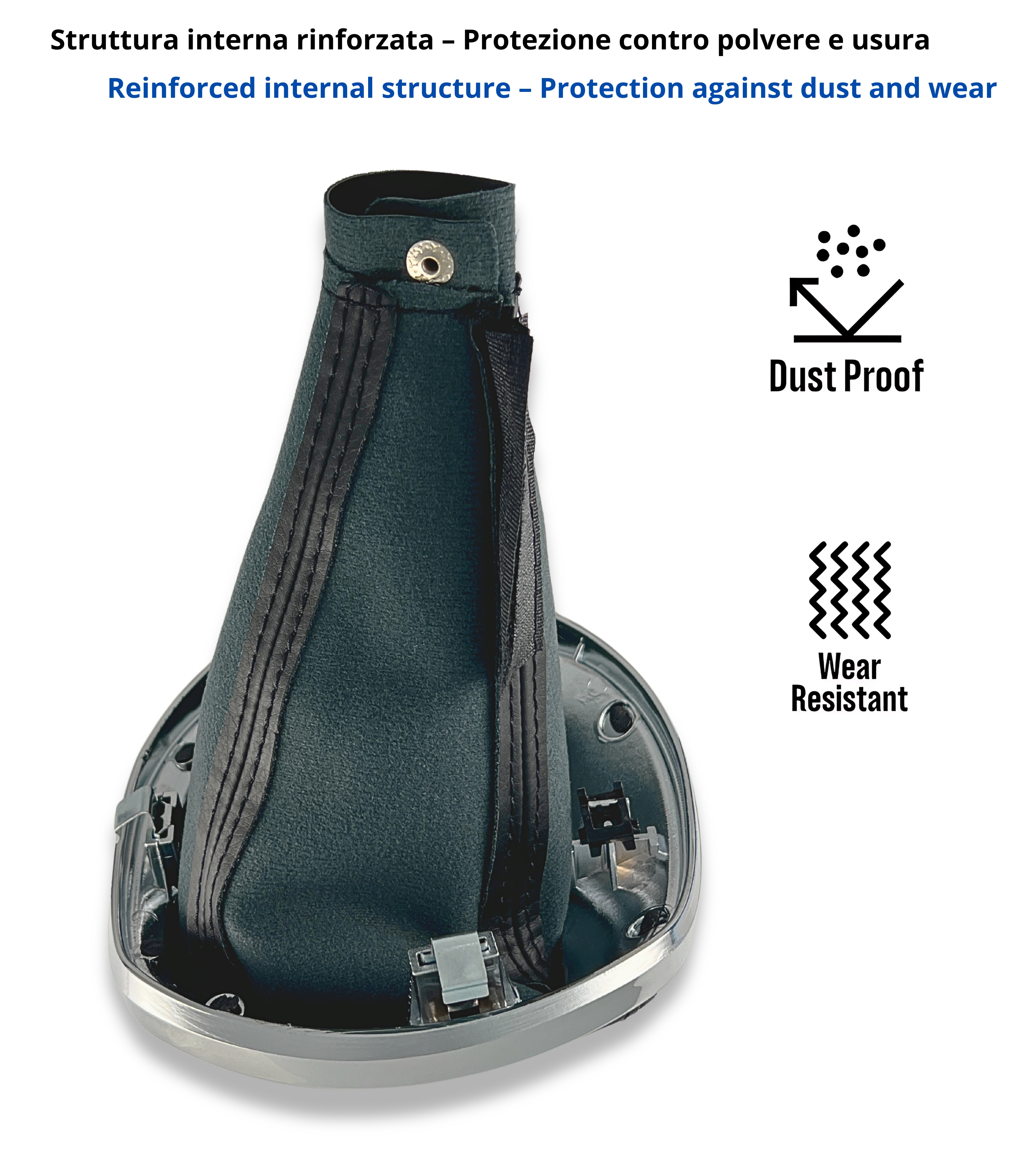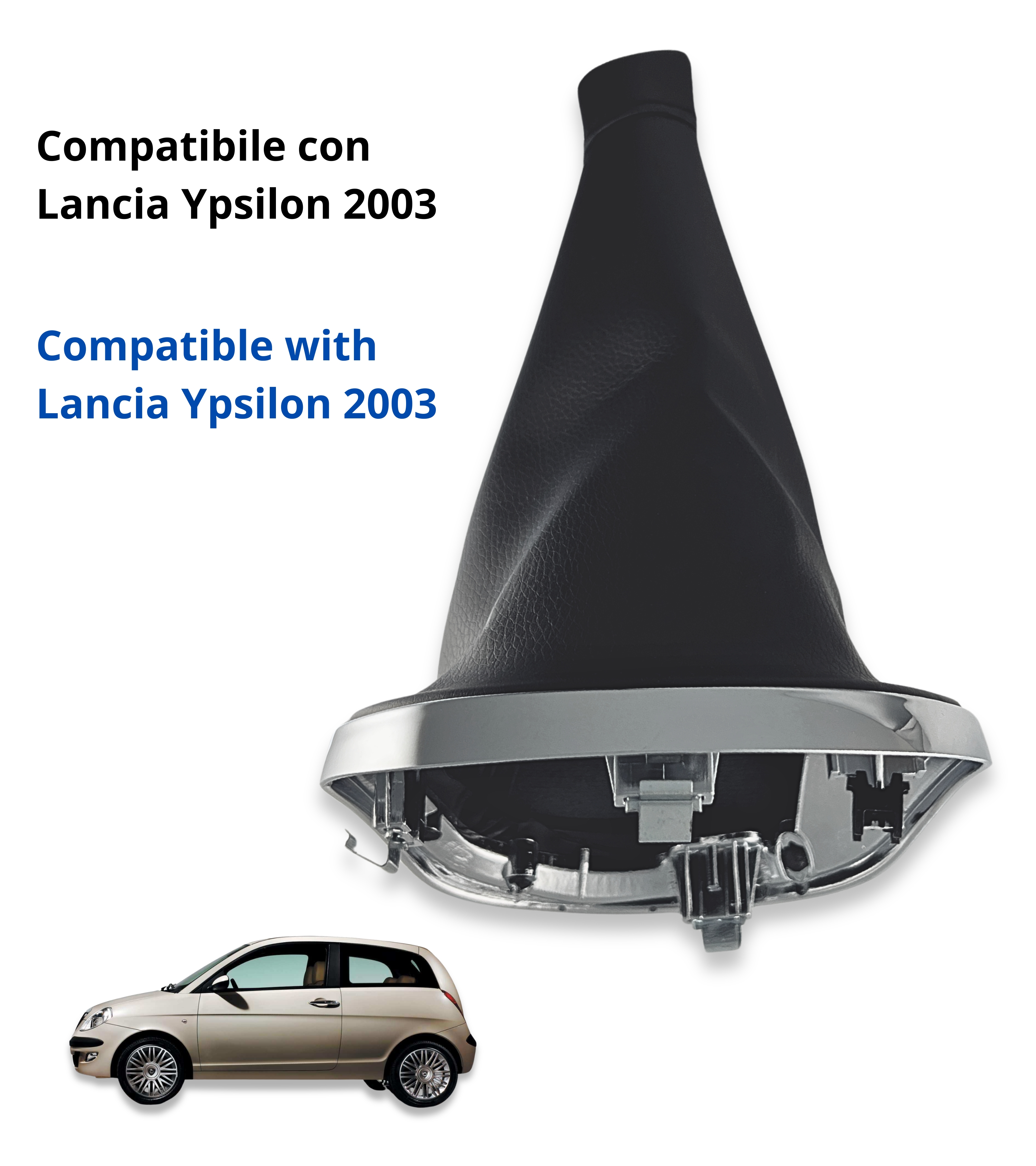 Kit completo per leva cambio compatibile con Lancia Ypsilon (843) prodotti dal 2003 al 2011. Include cuffia di colore nero con cuciture nere, cornice esterna cromata lucida e ghiera di ritenzione integrata (telaio interno). Ideale per sostituire una cuffia danneggiata o usurata e rinnovare l’estetica dell’abitacolo con uno stile moderno e rifinito.