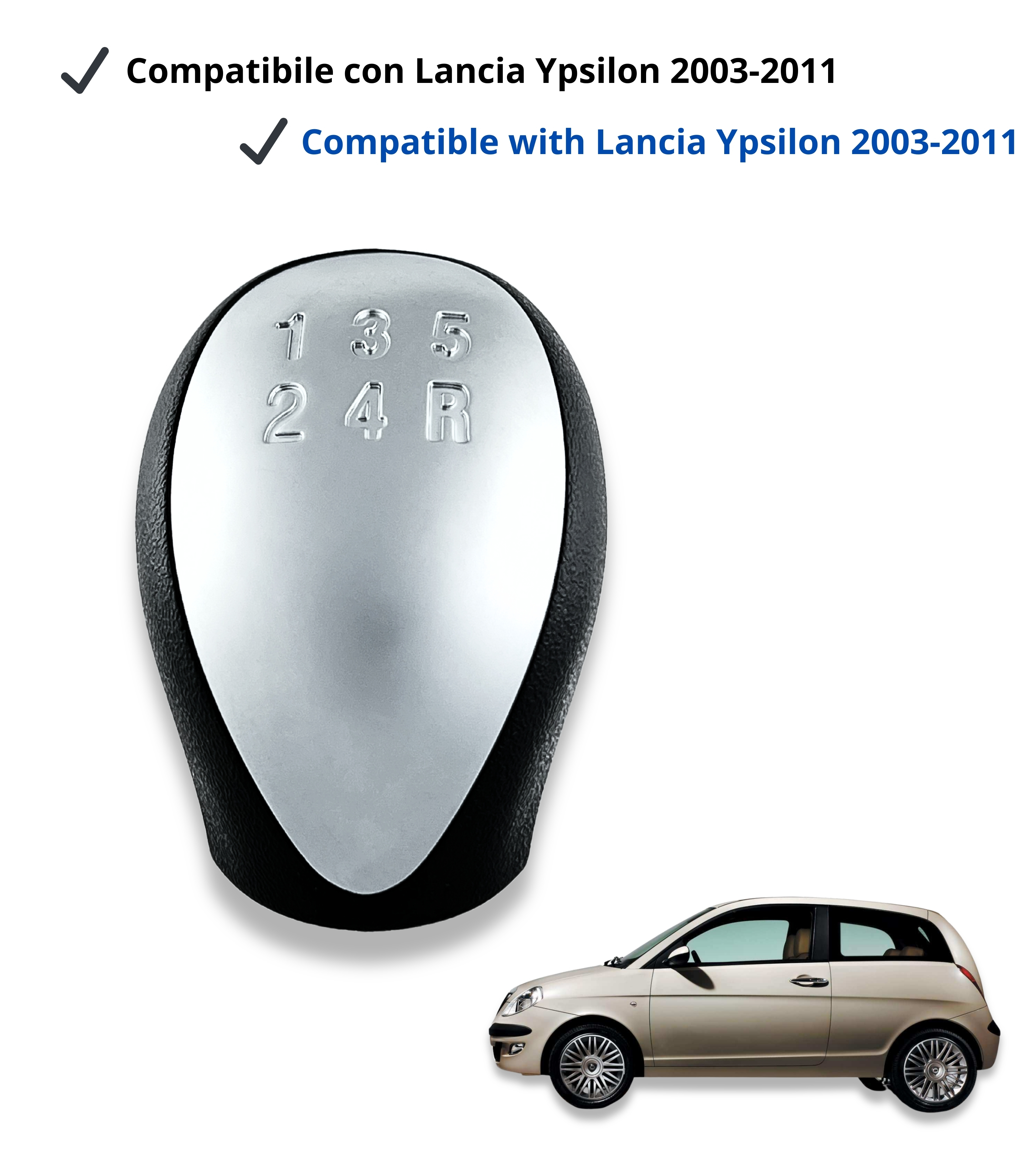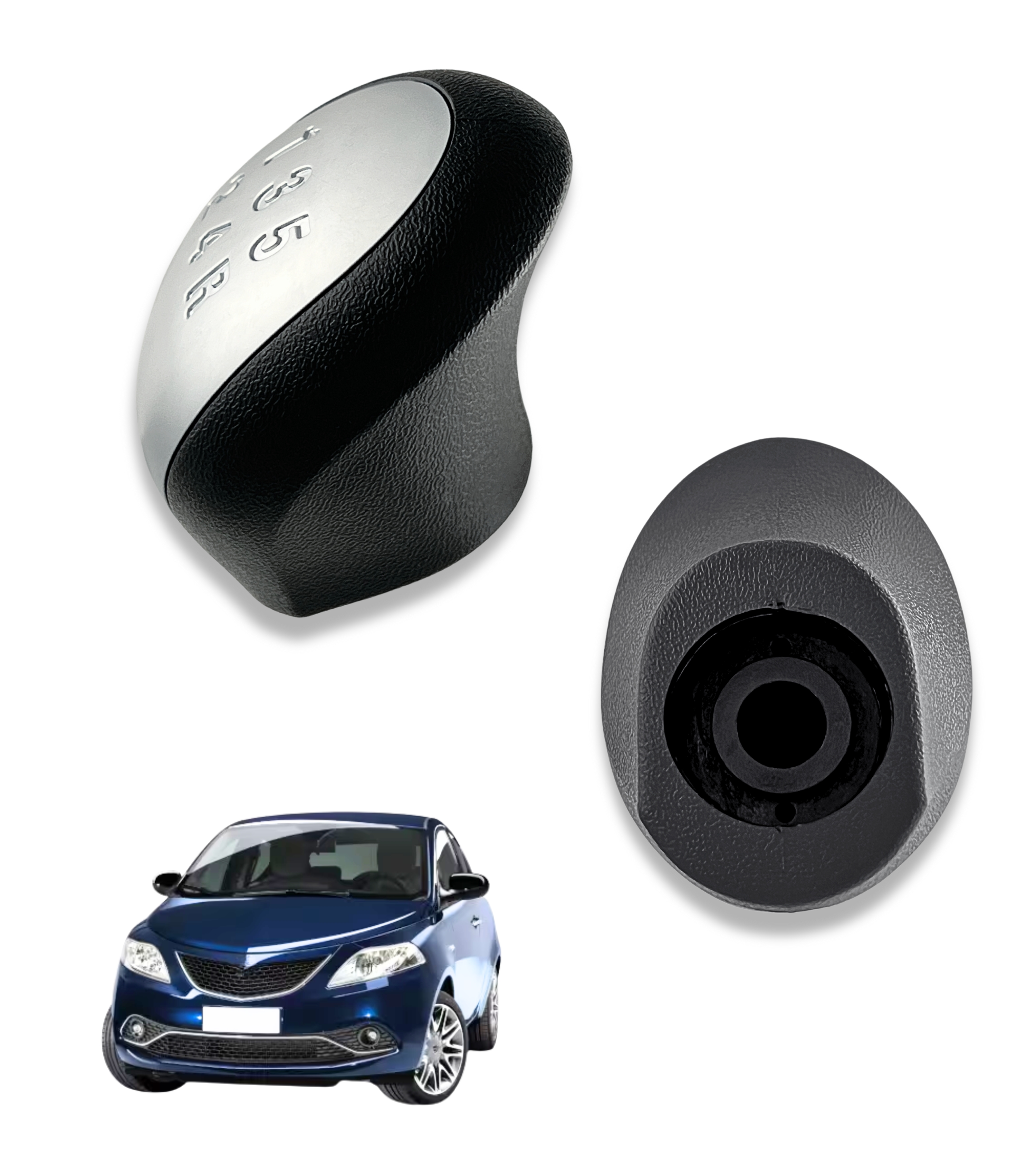 Pomello per leva cambio manuale 5 marce compatibile con Lancia Ypsilon (843) prodotta dal 2003 al 2011. Design compatto, sobrio e integrato con la plancia del veicolo.