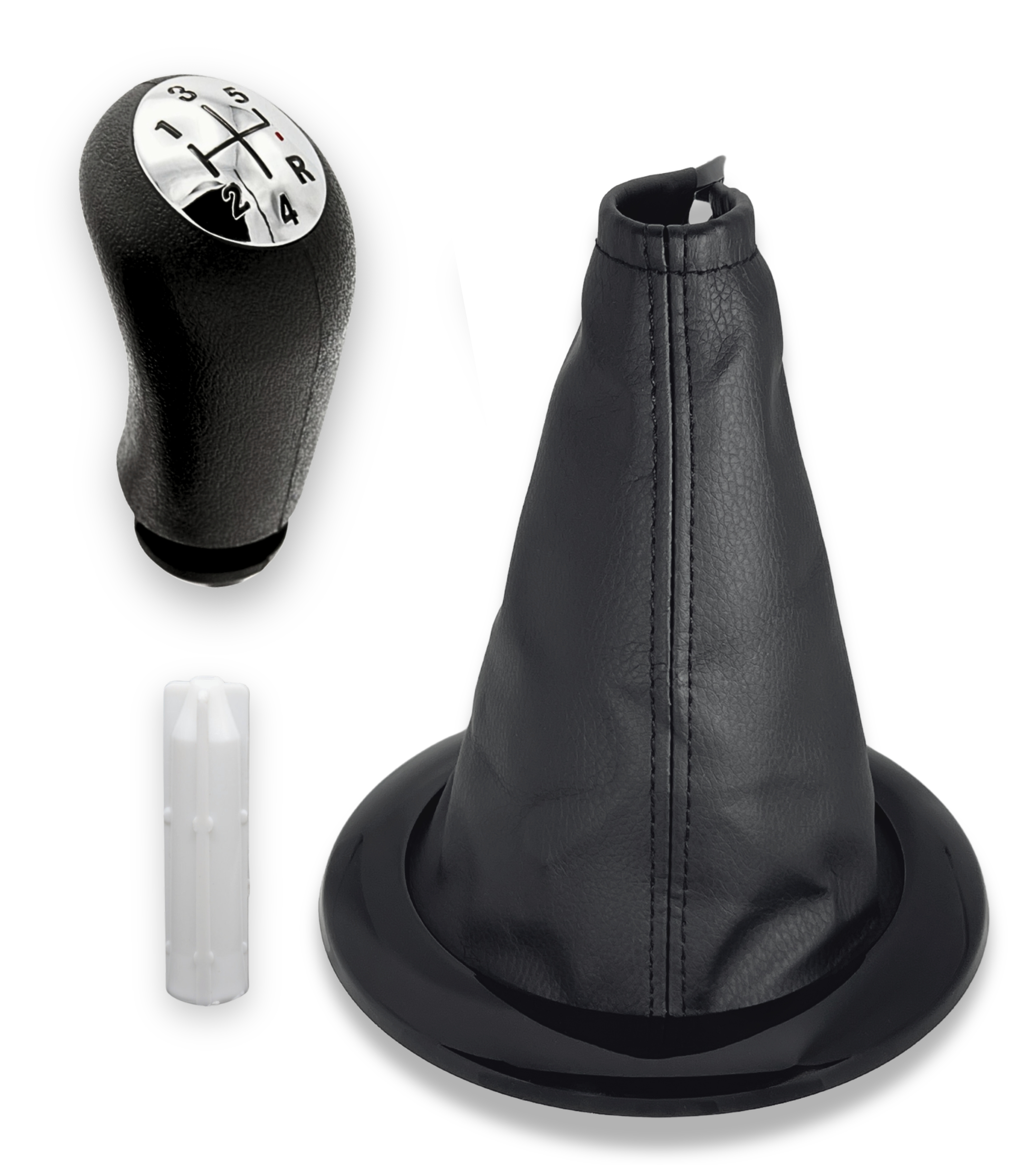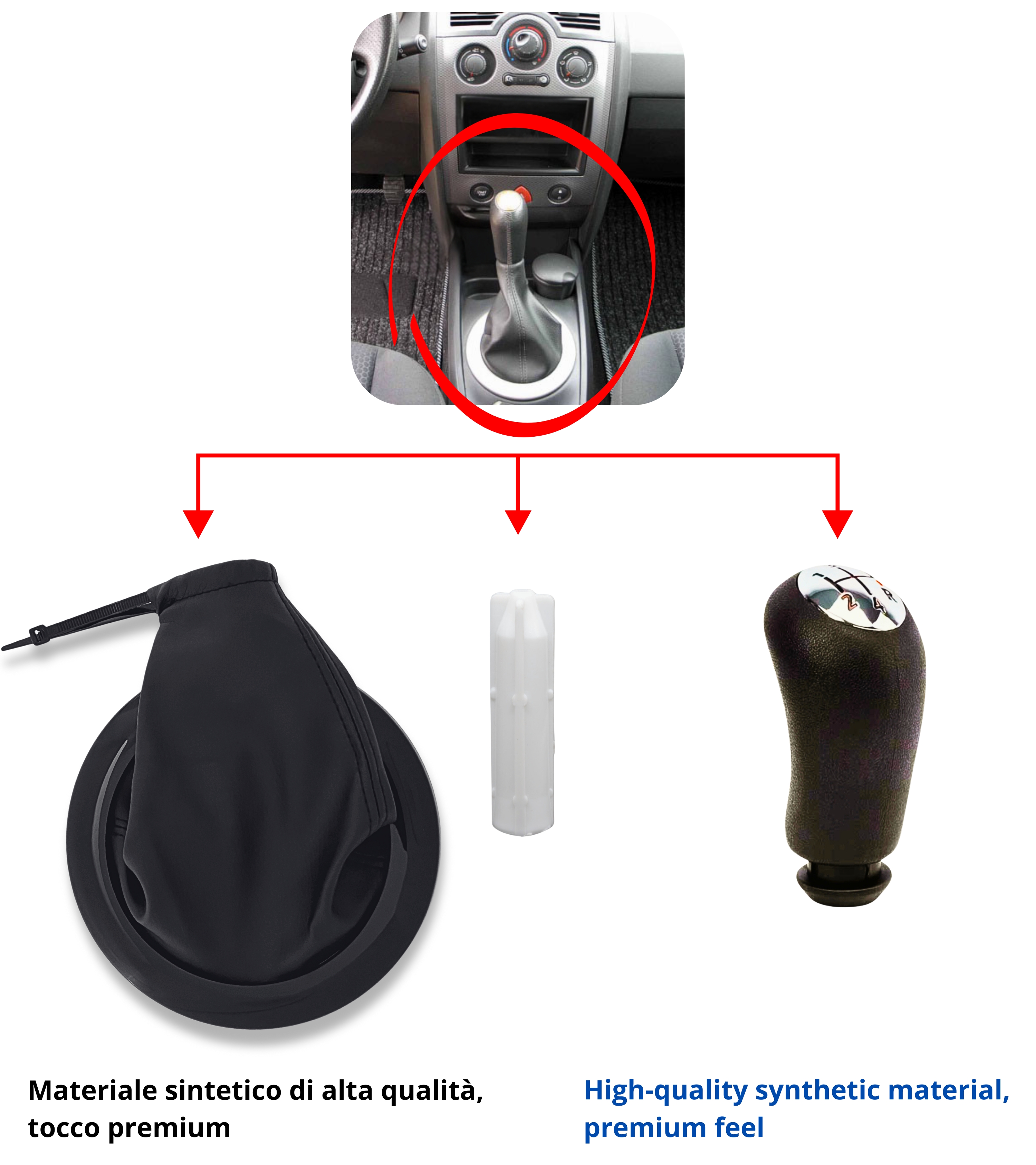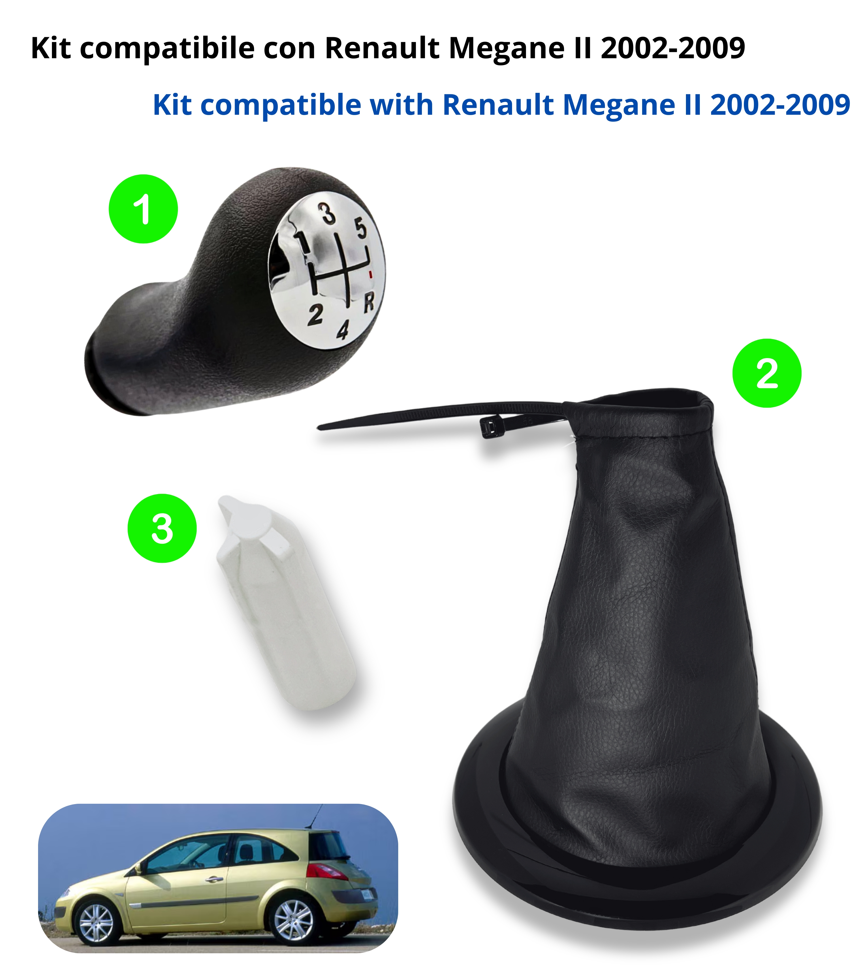 Kit completo compatibile con Renault Megane II (2002–2009) composto da pomello 5 marce, adattatore in plastica, cuffia nera con ghiera di ritenzione e cornice esterna nera cromata. Il set è progettato per sostituire un kit originale usurato e offre un’installazione completa, stabile e senza modifiche.