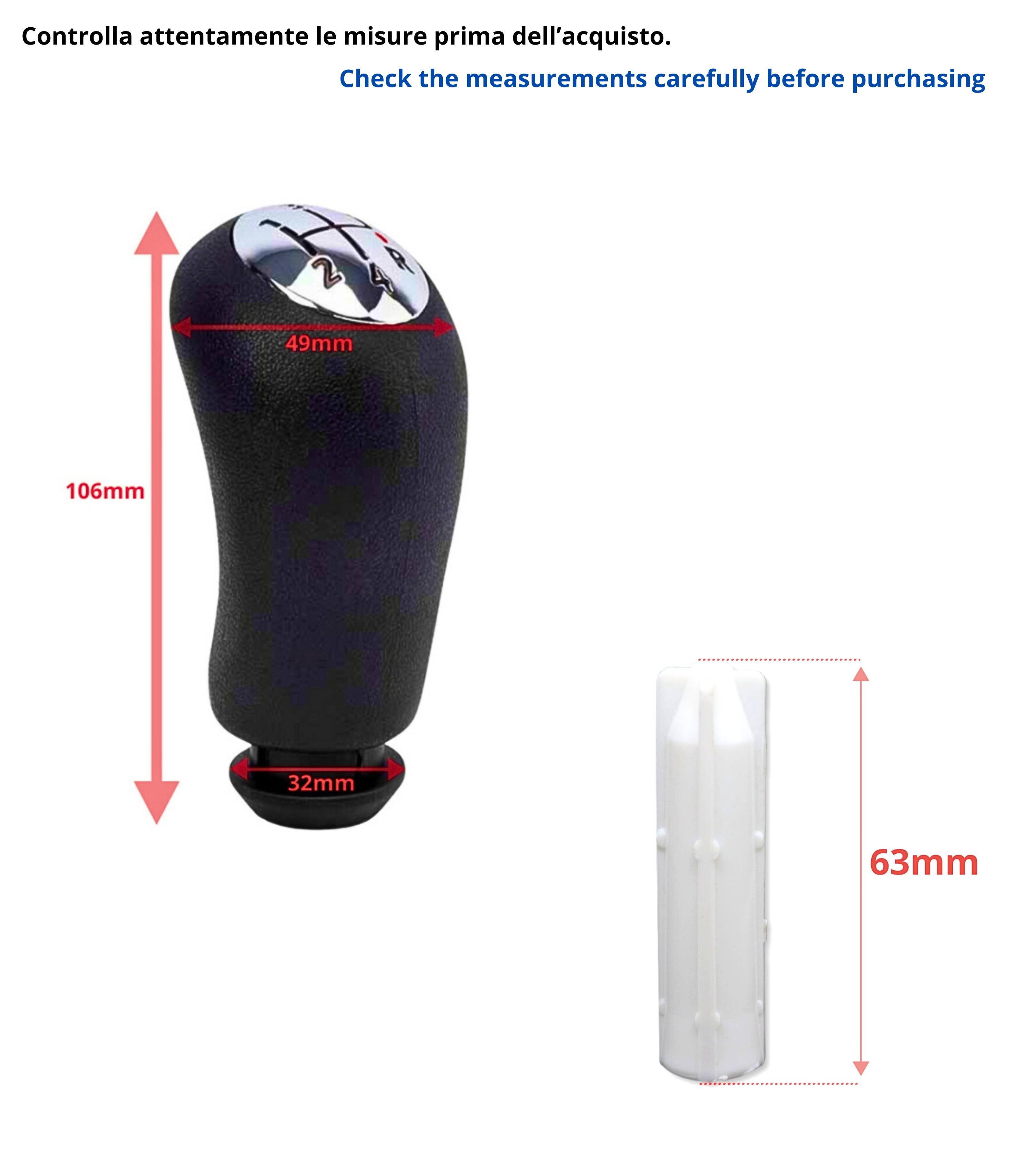 Il pomello è realizzato in plastica ABS resistente, con finitura nera e placca superiore color argento lucido. I numeri delle marce sono incisi in nero per una leggibilità chiara e immediata. Il design ergonomico garantisce una presa salda e una guida confortevole. La retromarcia si trova in basso a destra.