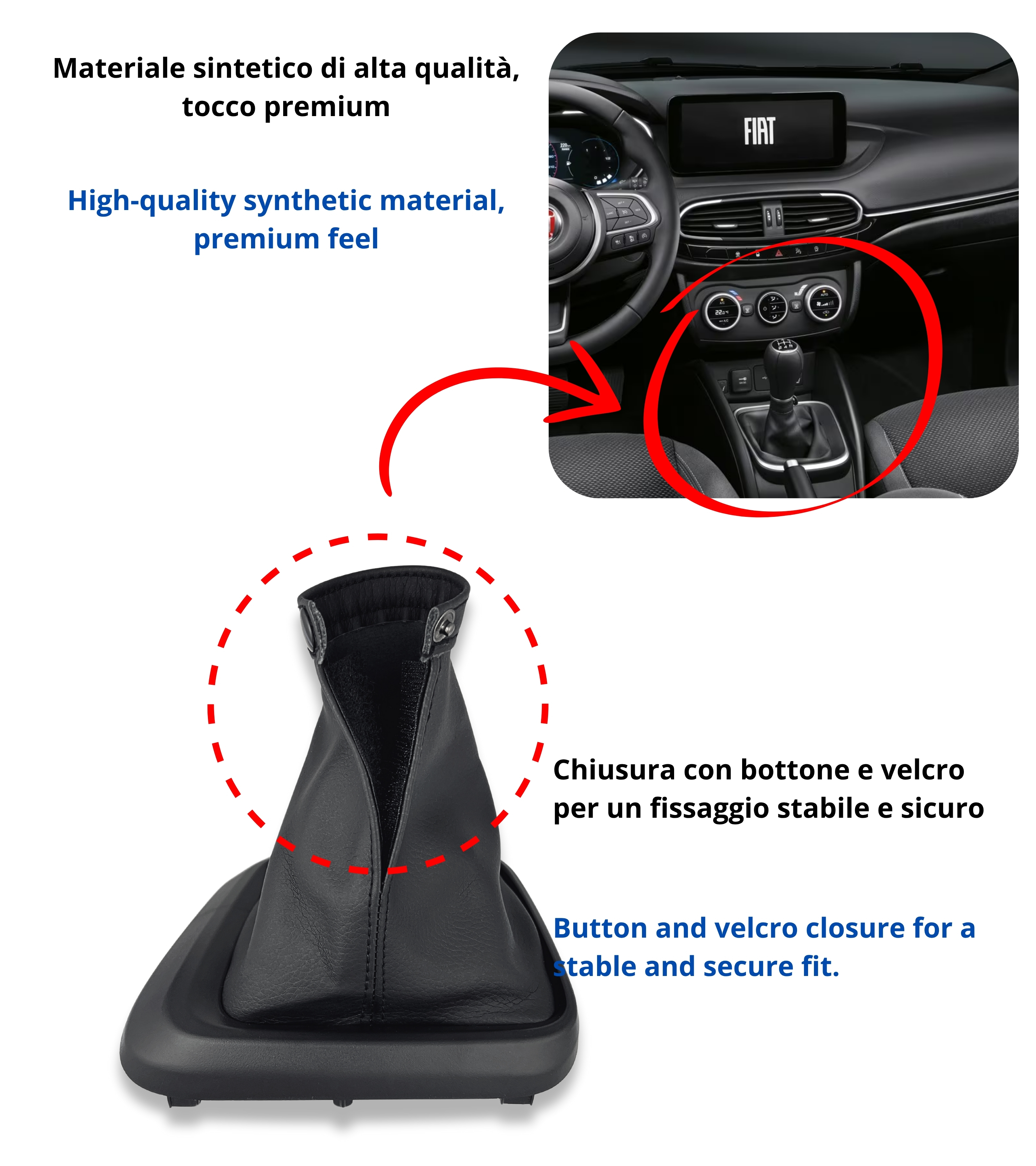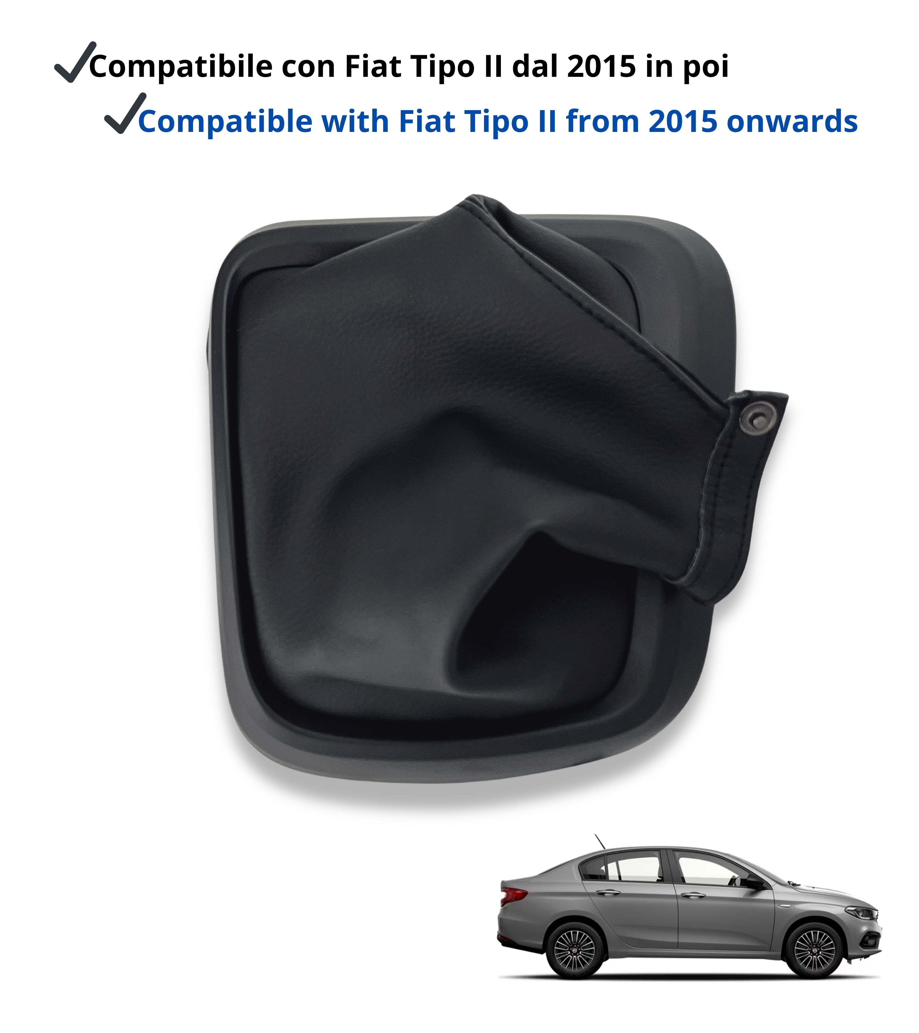 Kit composto da cuffia leva cambio nera, cornice esterna nera e ghiera di ritenzione, compatibile con Fiat Tipo II 356 berlina 4 porte (2015+), Fiat Tipo II 357 5 porte (2016+) e Fiat Tipo II 358 Station Wagon (2016+). Compatibile con codici OEM 735641775, 735786601, 735624491, 735631235.