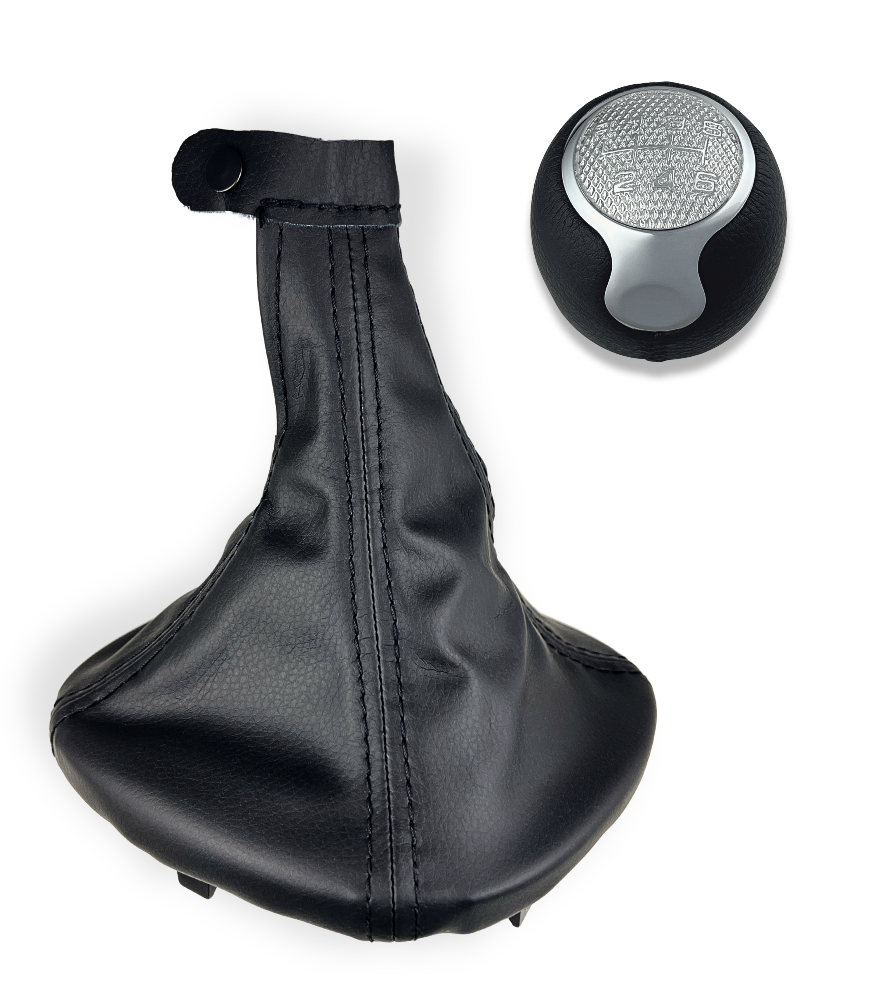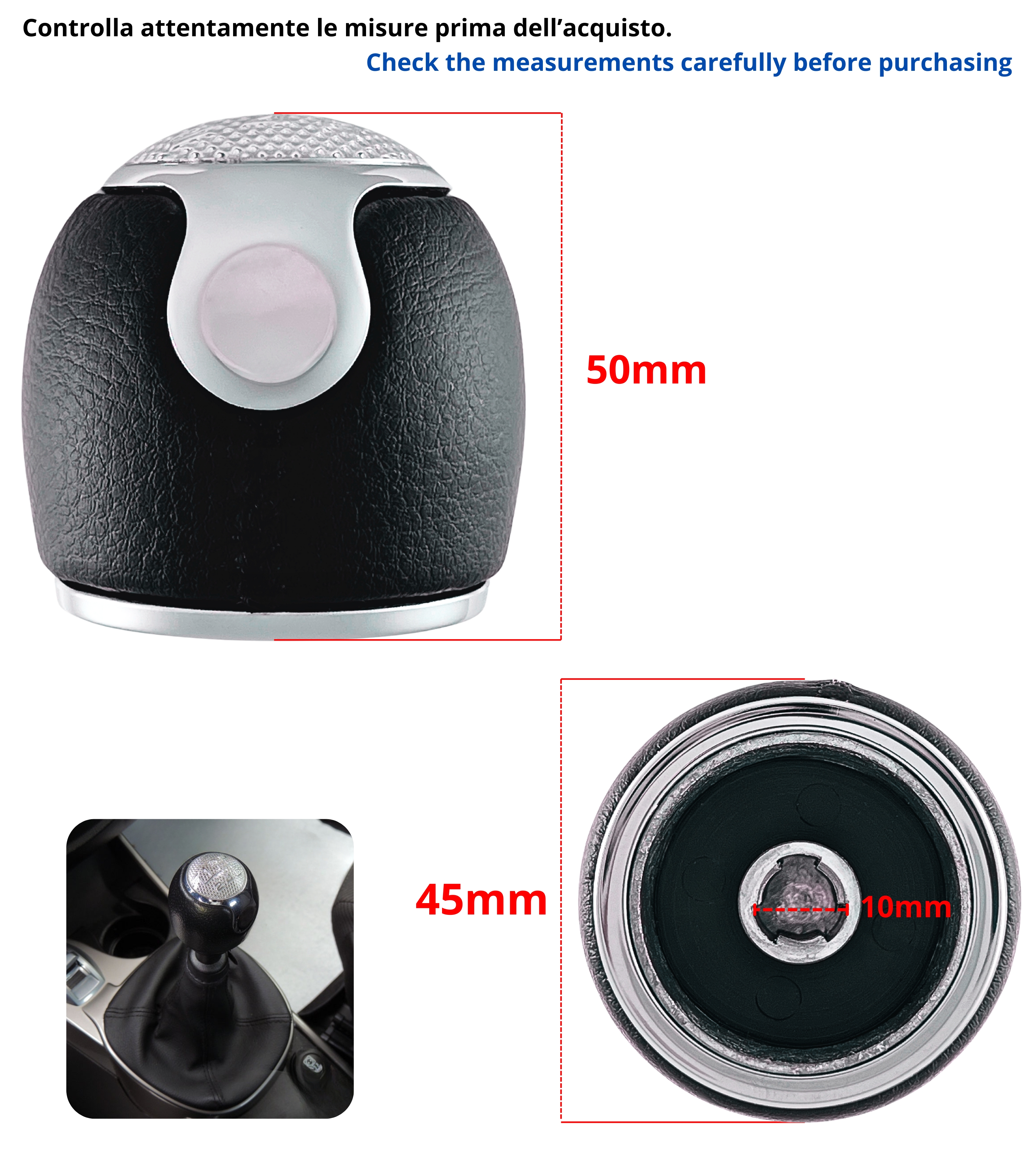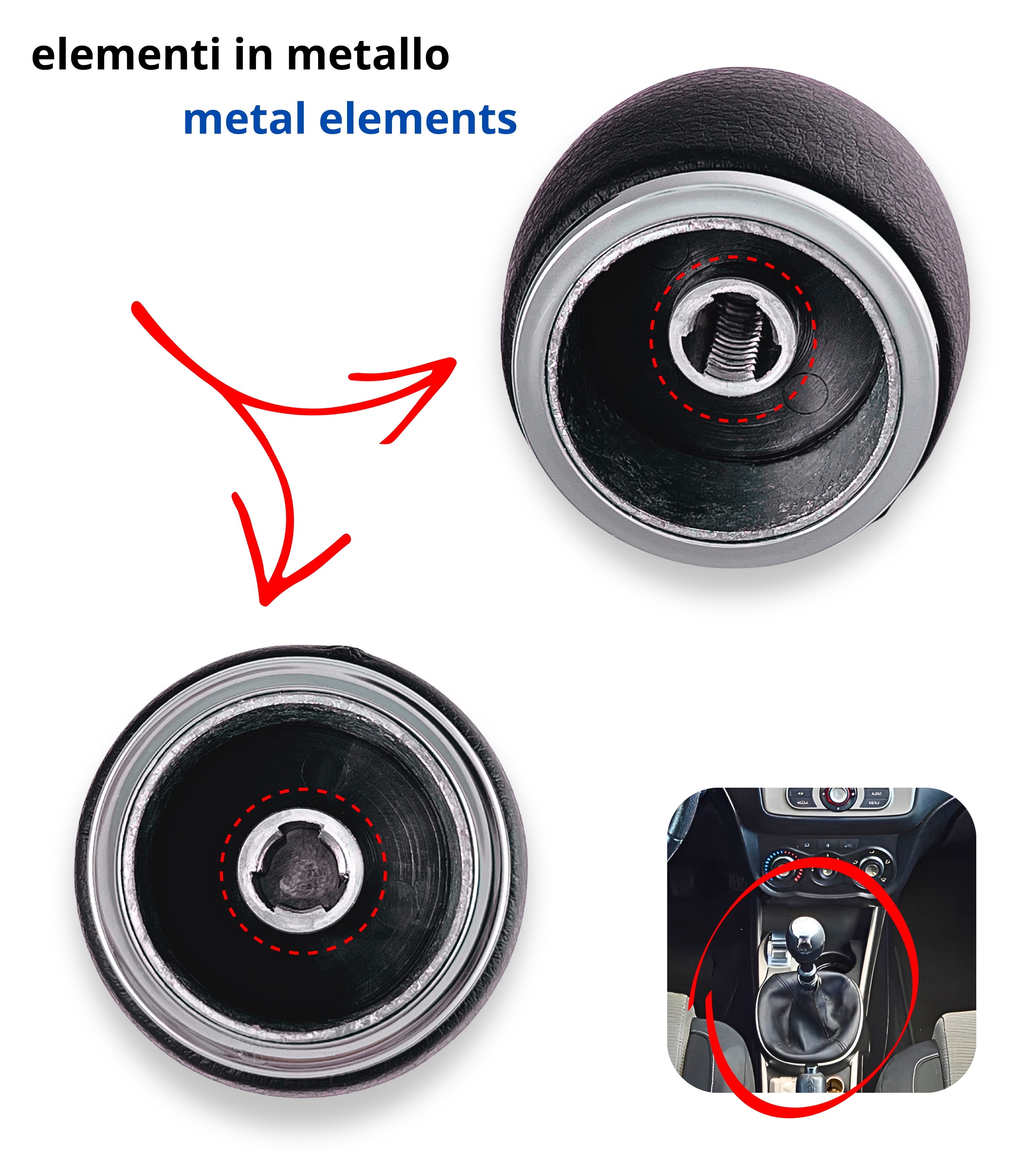 Impugnatura nera in materiale sintetico con lente superiore color argento satinato. I numeri delle marce sono incisi in colore argento per una perfetta leggibilità. Foro di innesto in metallo per una connessione stabile e duratura alla leva cambio. Retromarcia in alto a sinistra.