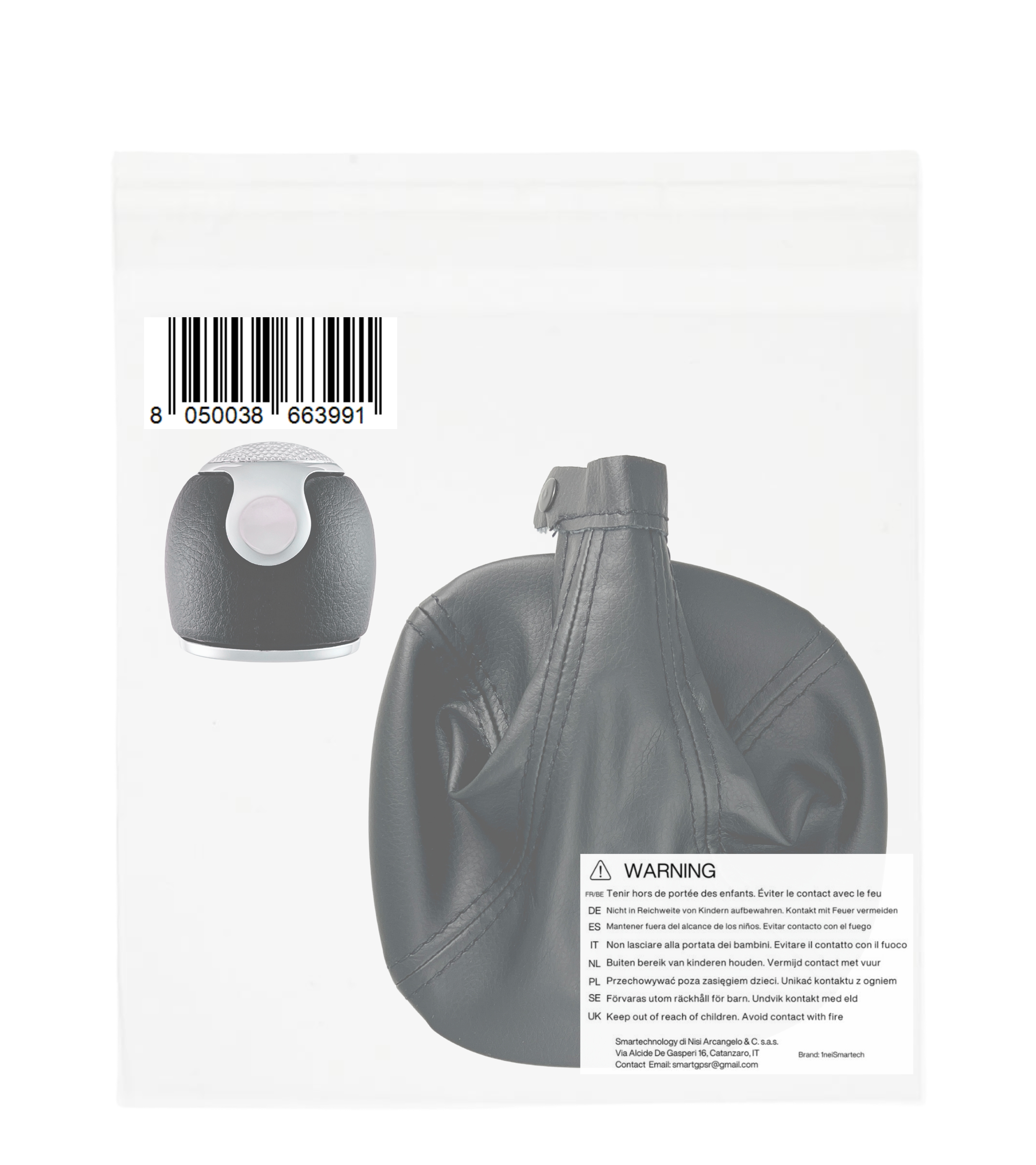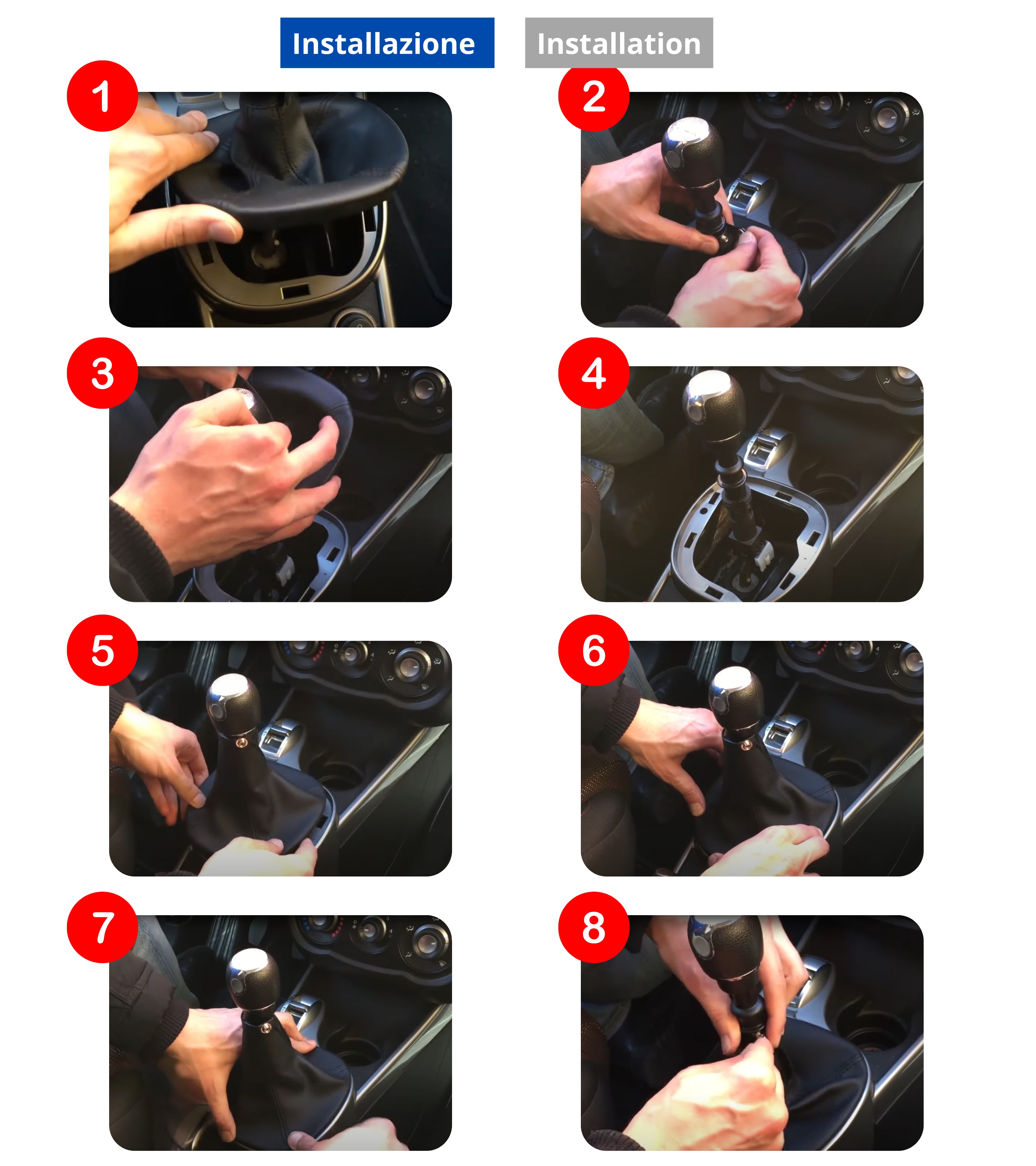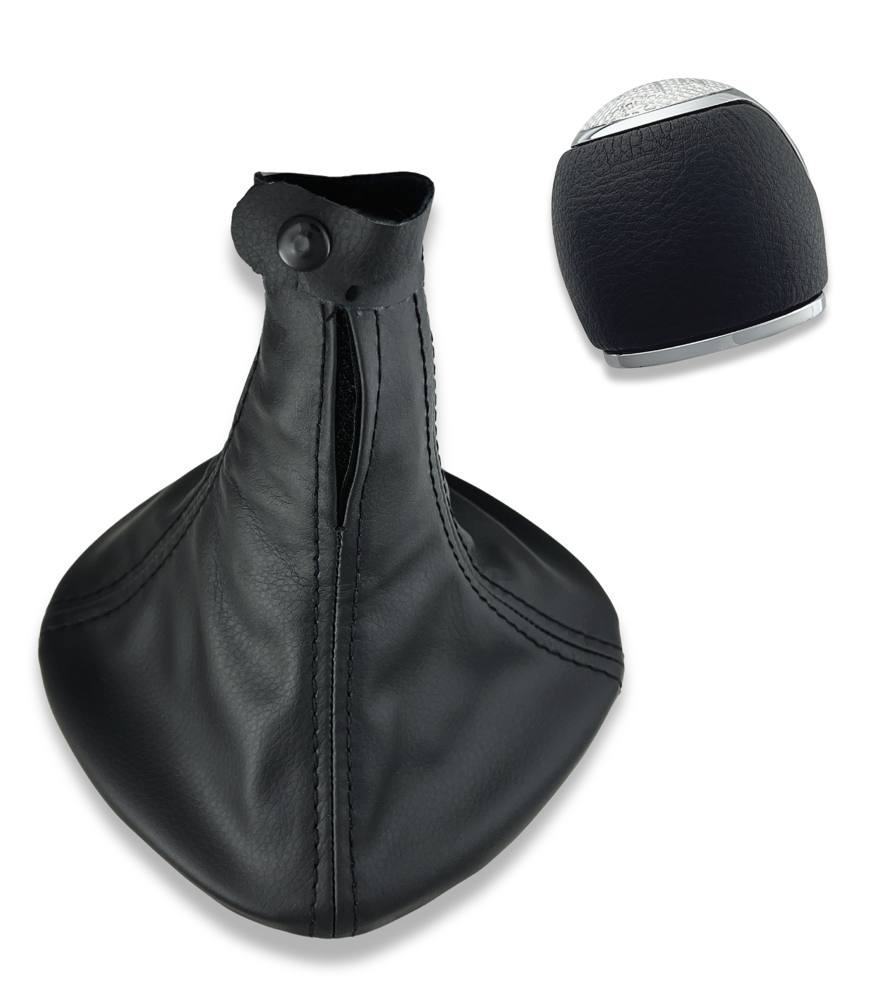 Impugnatura nera in materiale sintetico con lente superiore color argento satinato. I numeri delle marce sono incisi in colore argento per una perfetta leggibilità. Foro di innesto in metallo per una connessione stabile e duratura alla leva cambio. Retromarcia in alto a sinistra.