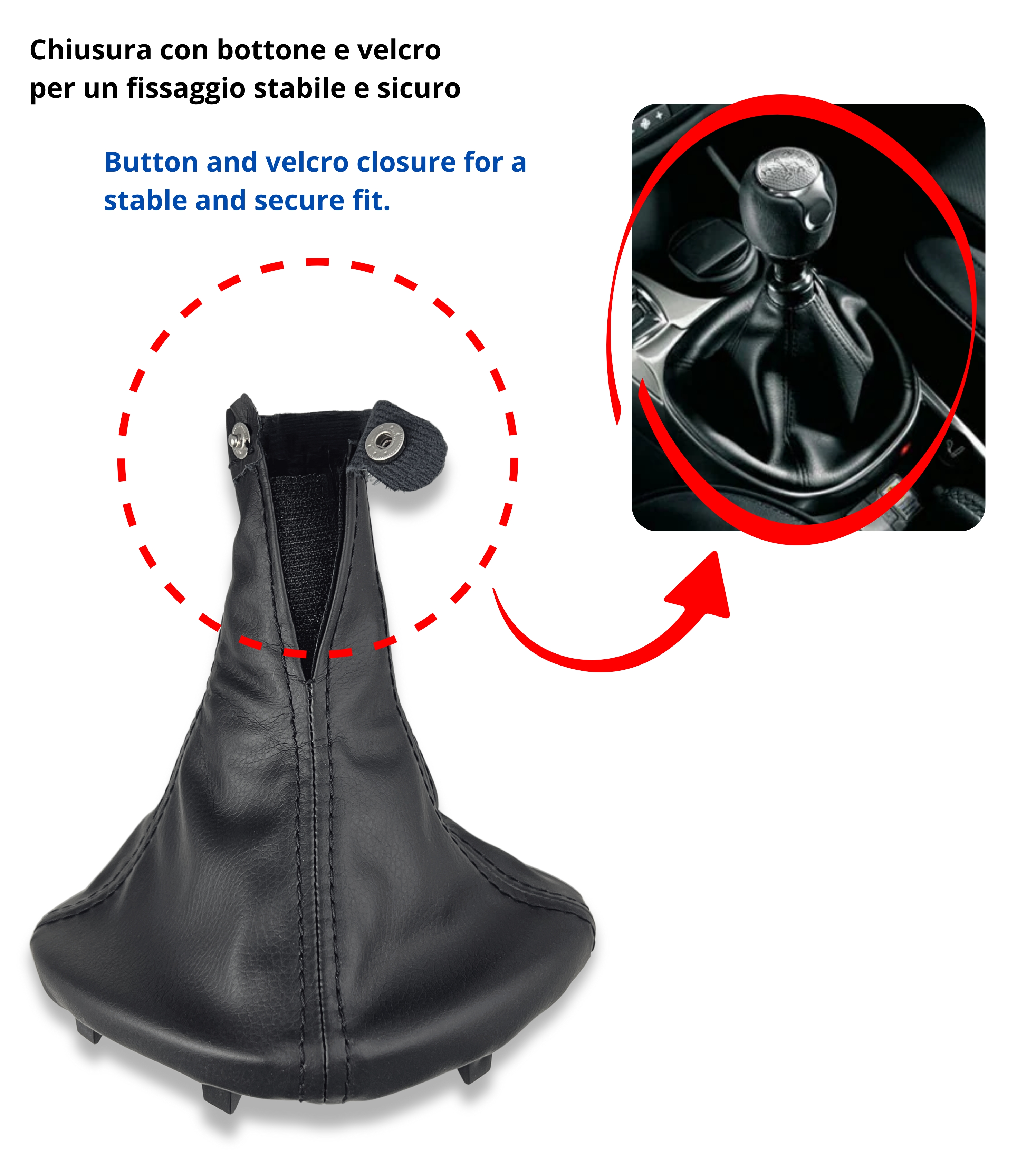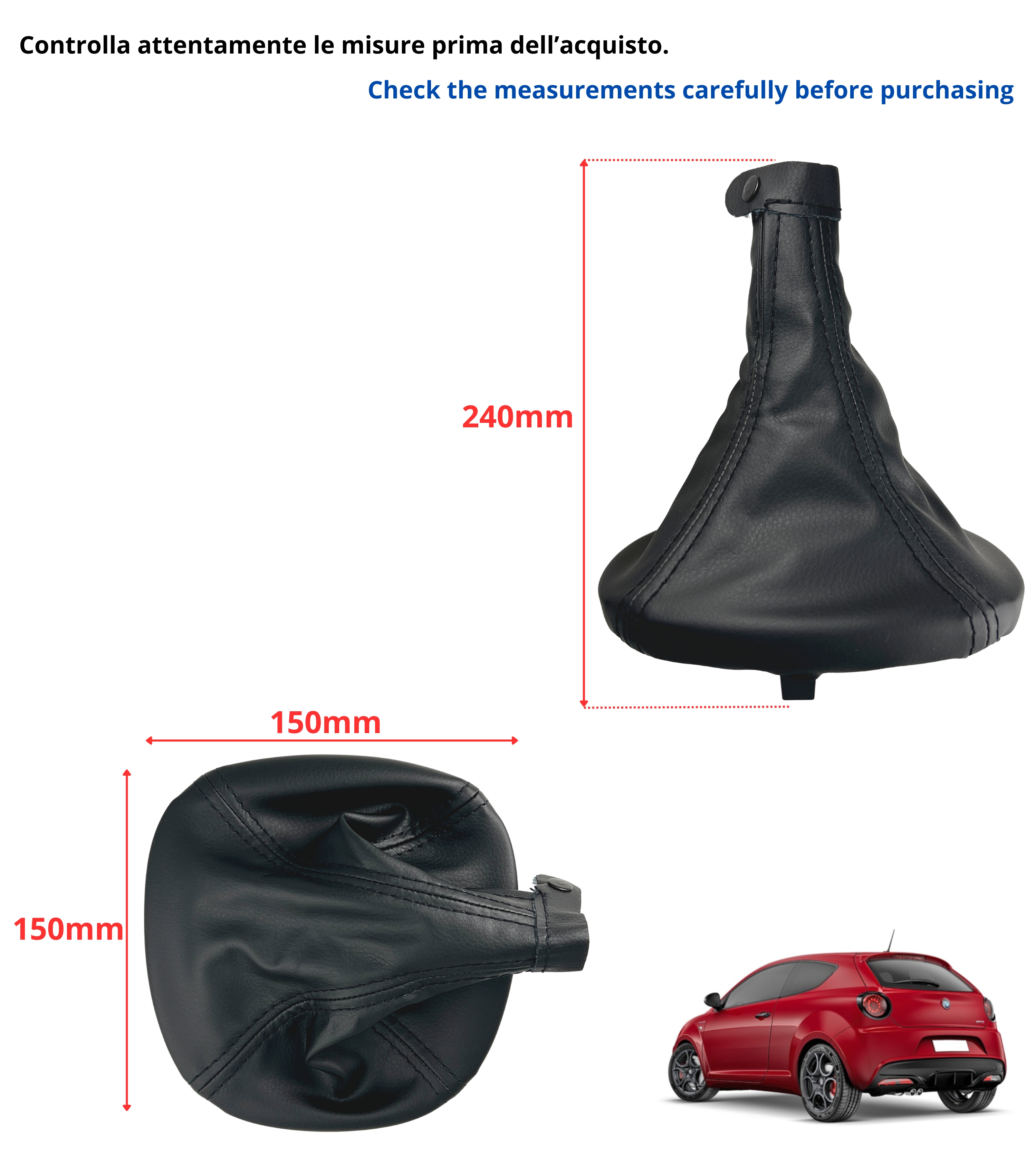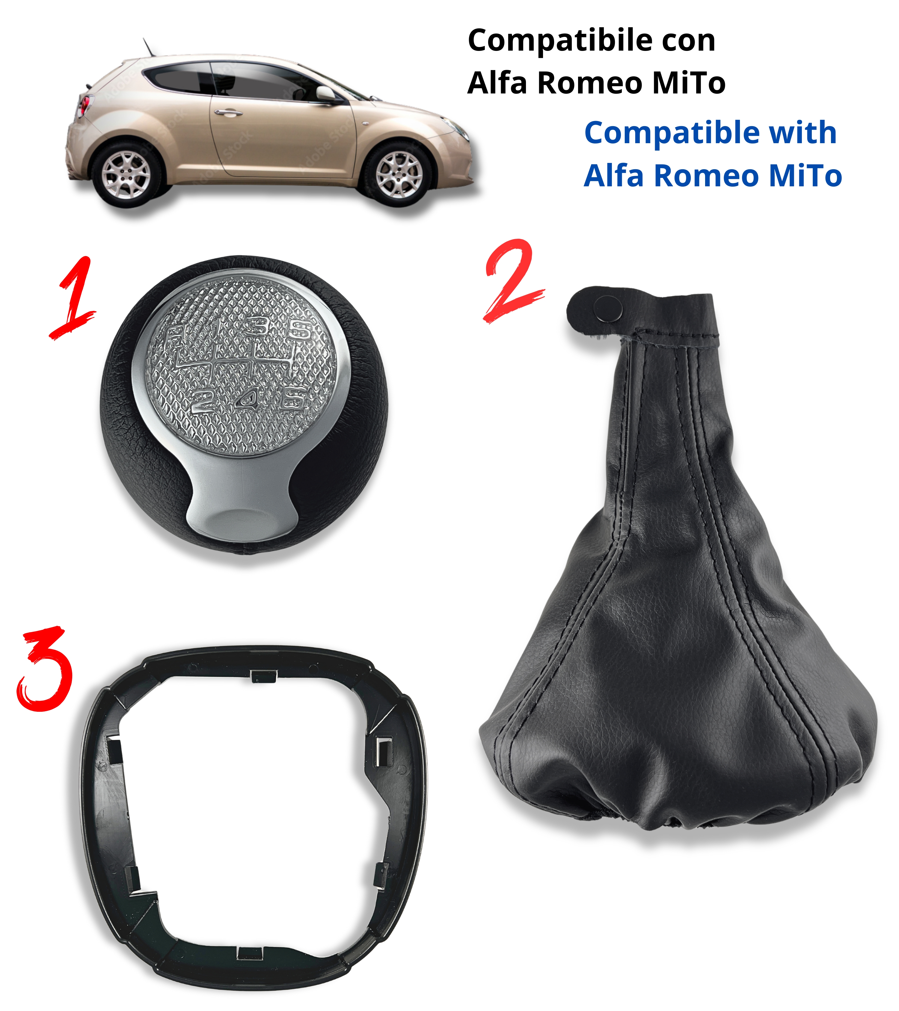 Kit completo composto da pomello leva cambio 6 marce, cuffia in materiale sintetico e ghiera di ritenzione, compatibile con Alfa Romeo MiTo prodotti dal 2008. Un ricambio pratico, funzionale ed esteticamente curato per rinnovare il gruppo leva cambio della tua auto.