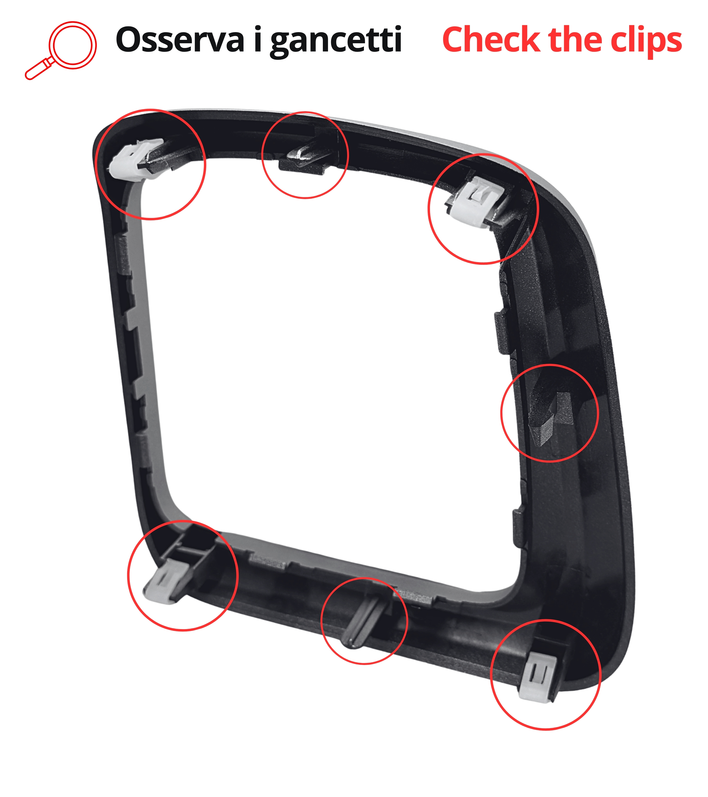 La ghiera è fornita completa di clips in plastica removibili, un dettaglio fondamentale che consente un fissaggio stabile e un montaggio preciso della ghiera alla plancia del cambio della tua auto