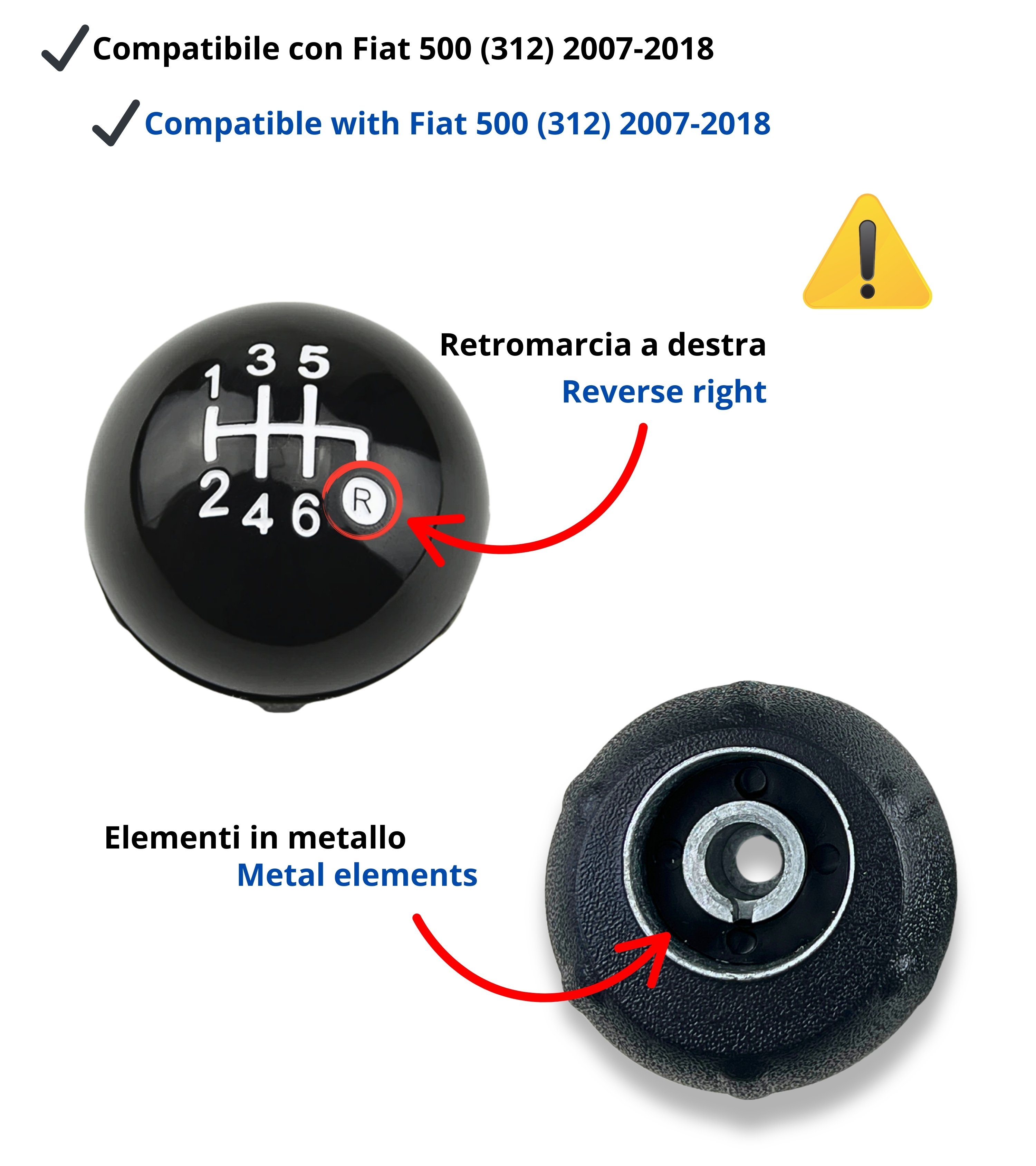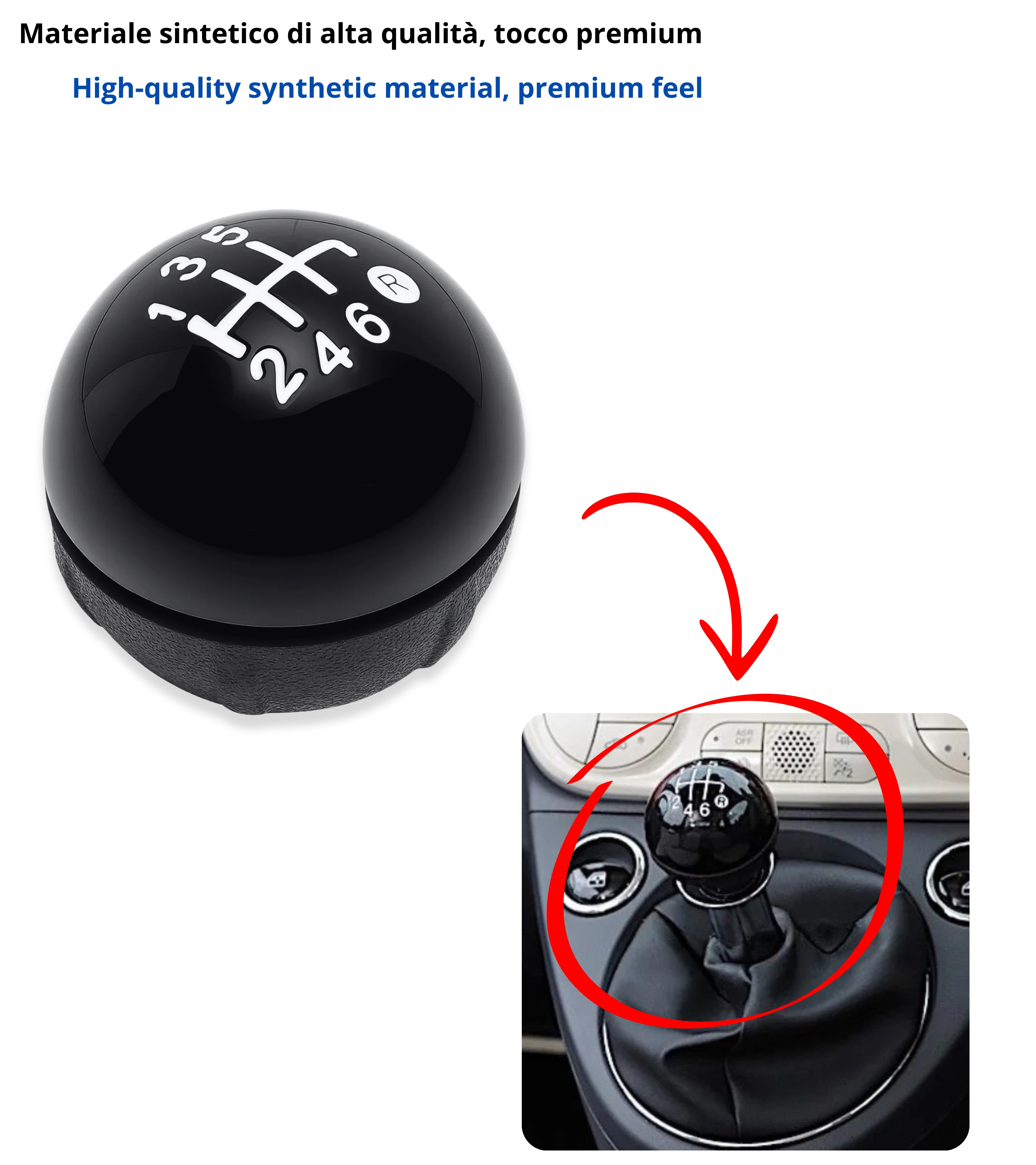 Pomello leva cambio 6 marce compatibile con Fiat 500 seconda serie (312) e compatibile con Fiat 500C (312), prodotte dal 2007 al 2018. Design elegante e finitura accurata, ideale per sostituire il pomello usurato della tua vettura senza compromessi estetici o funzionali.