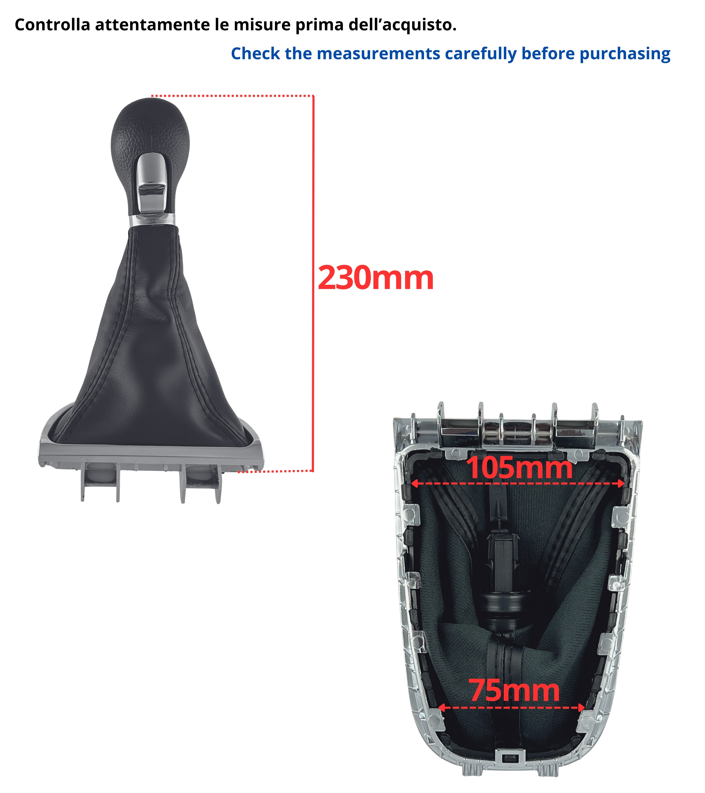 Il pomello (5 marce) è dotato di pulsante cromato color argento per l’innesto della retromarcia e di molla di ritorno, elementi fondamentali per assicurare un funzionamento corretto e identico all’originale. L’impugnatura è realizzata in materiale sintetico resistente, con lente superiore di colore nero, numeri merce leggibili di colore argento.