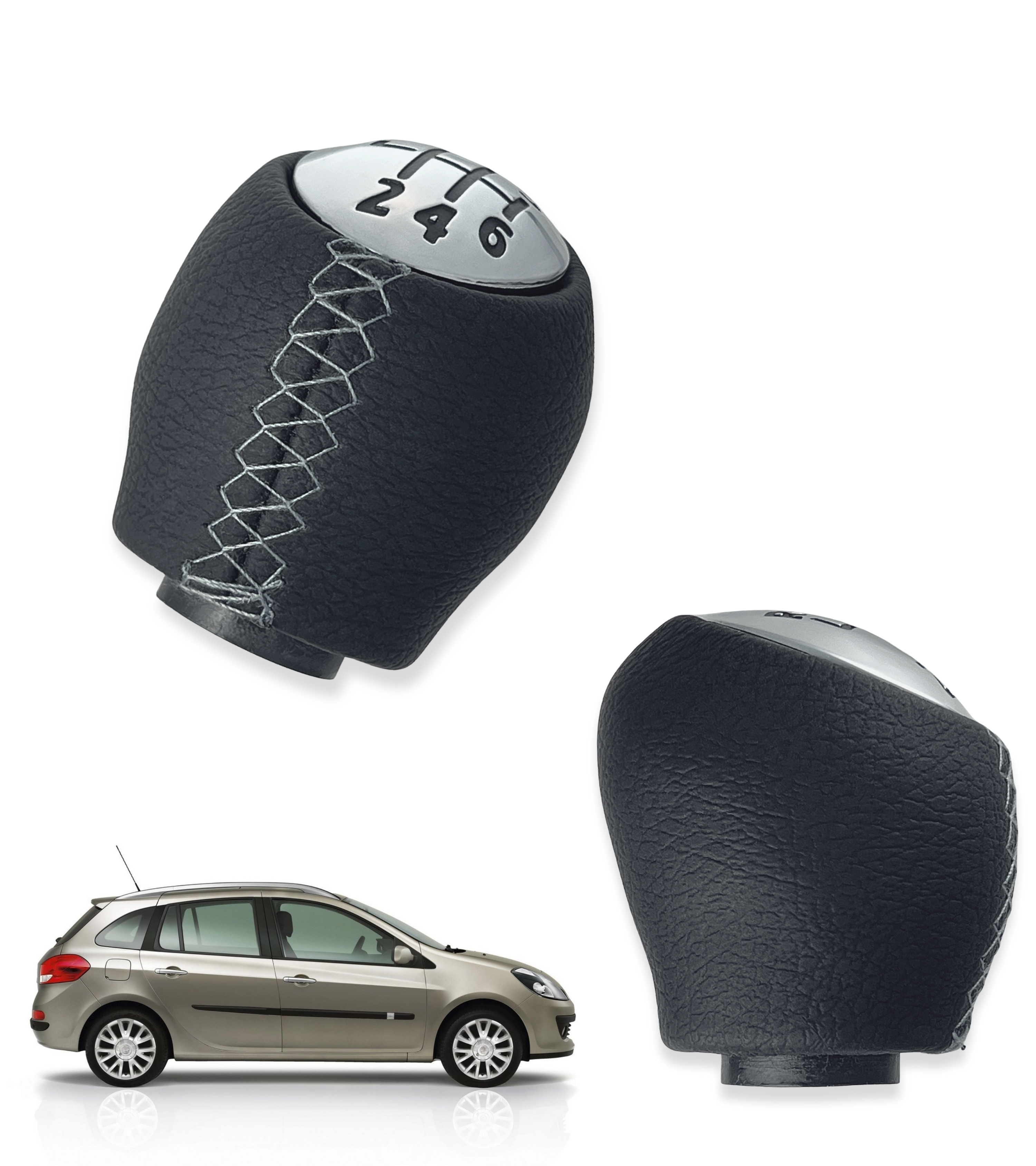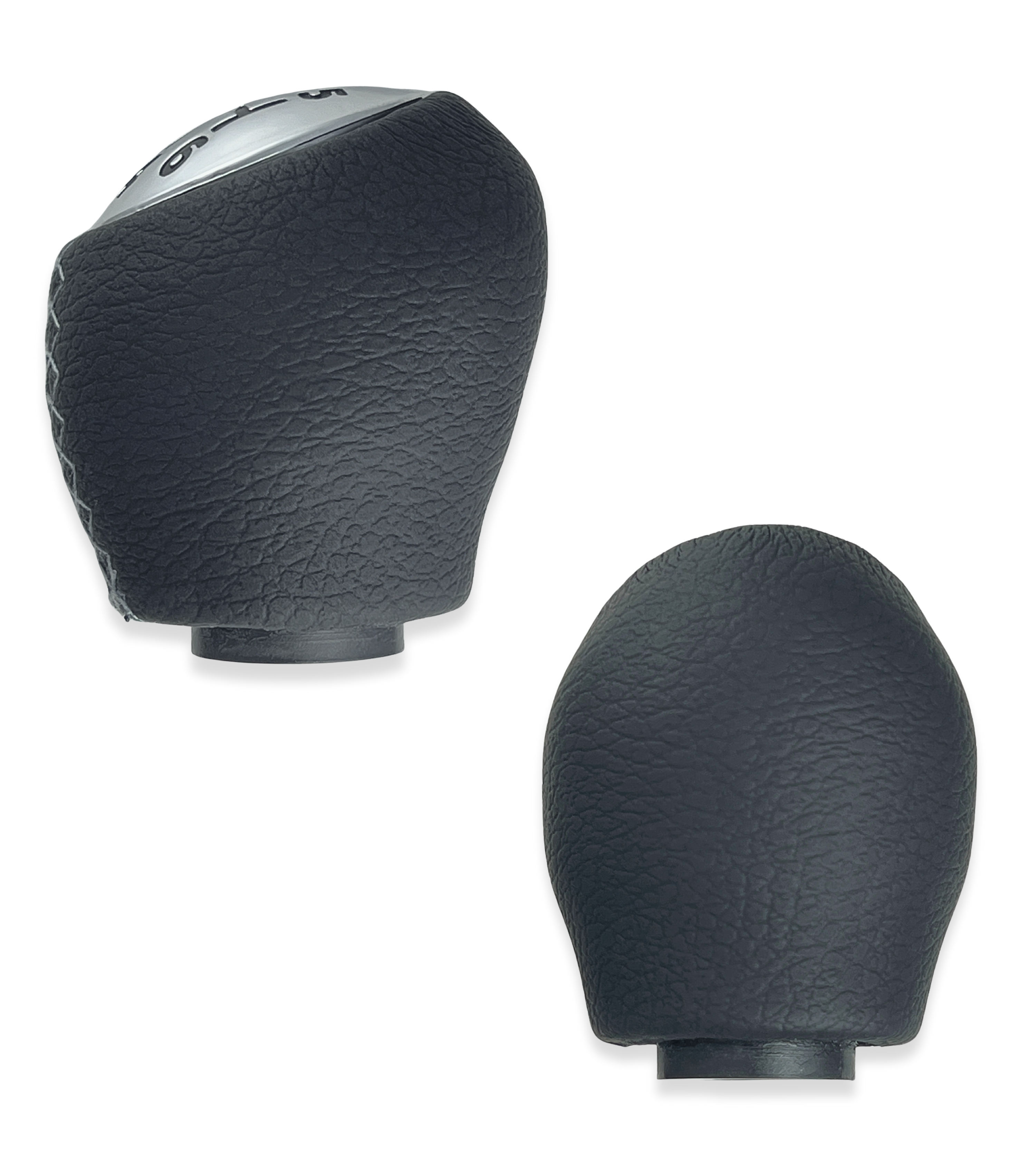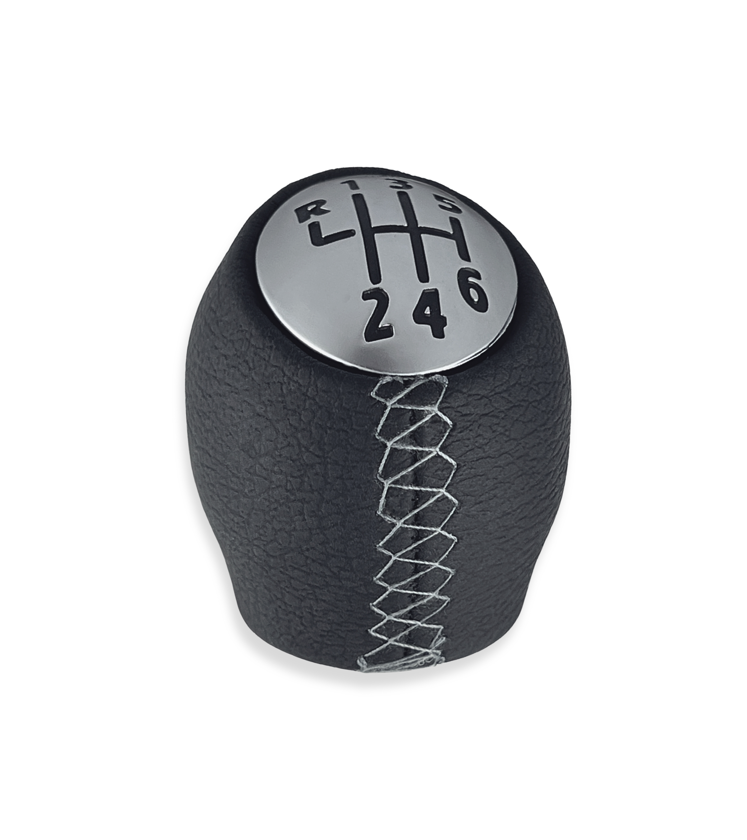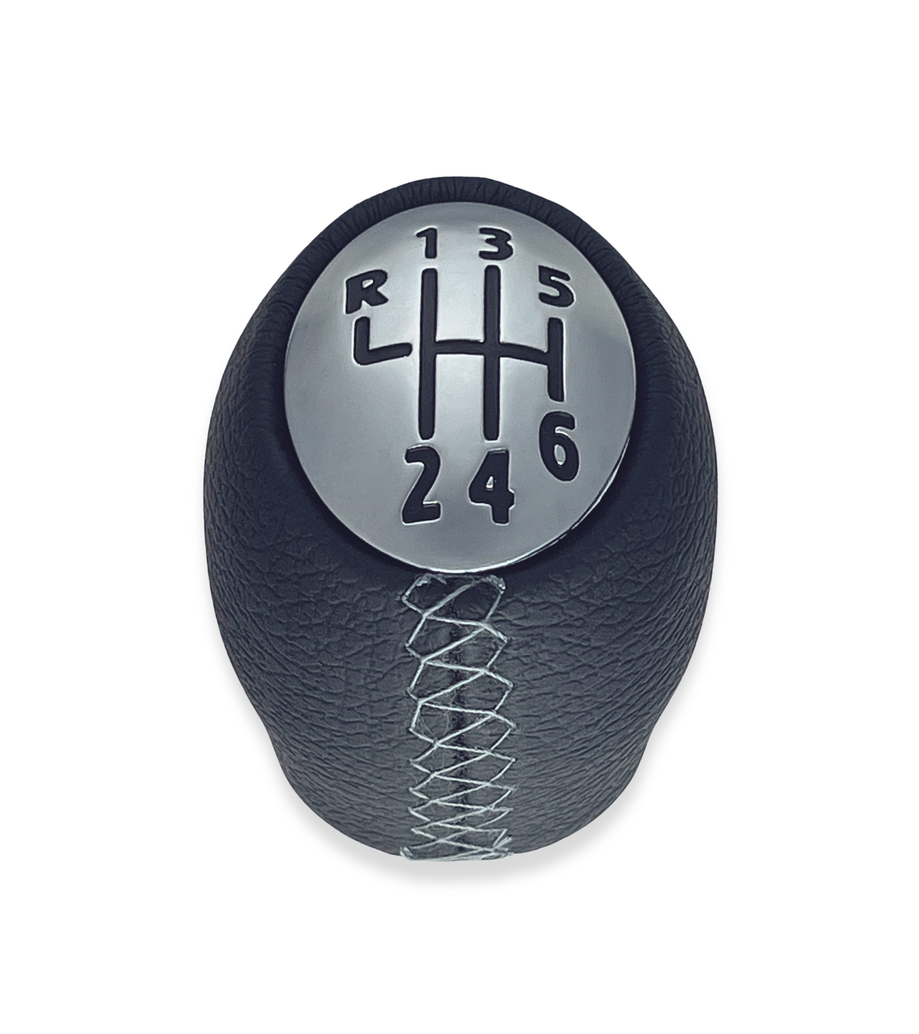 Pomello nero con cuciture grigie, finitura superiore satinata con numeri neri e retromarcia in alto a sinistra. Realizzato in materiale sintetico resistente, offre una presa comoda, sicura e una sensazione piacevole al tatto. Ideale per sostituire il vecchio pomello usurato o danneggiato, migliorando l’aspetto e la funzionalità dell’abitacolo.