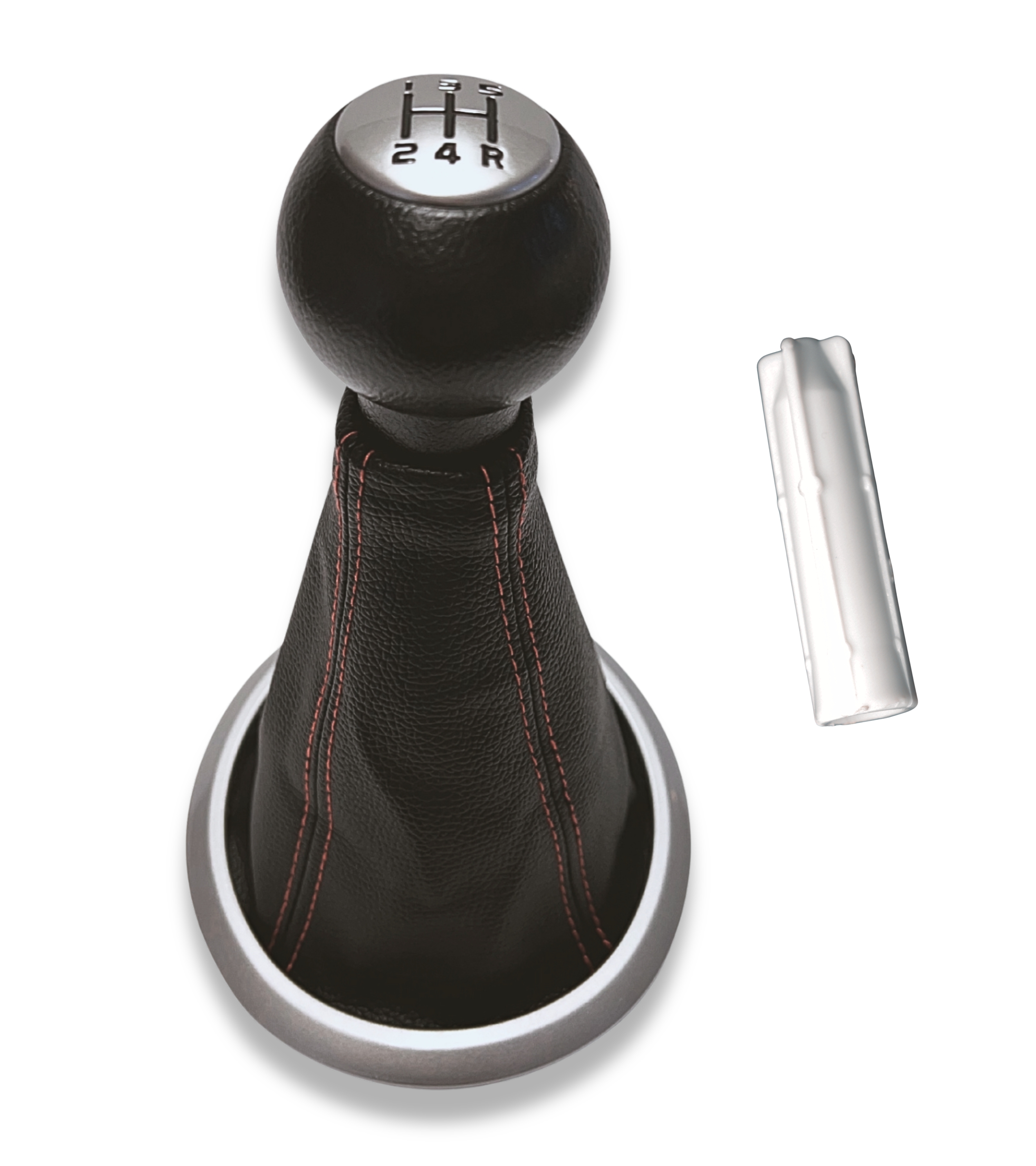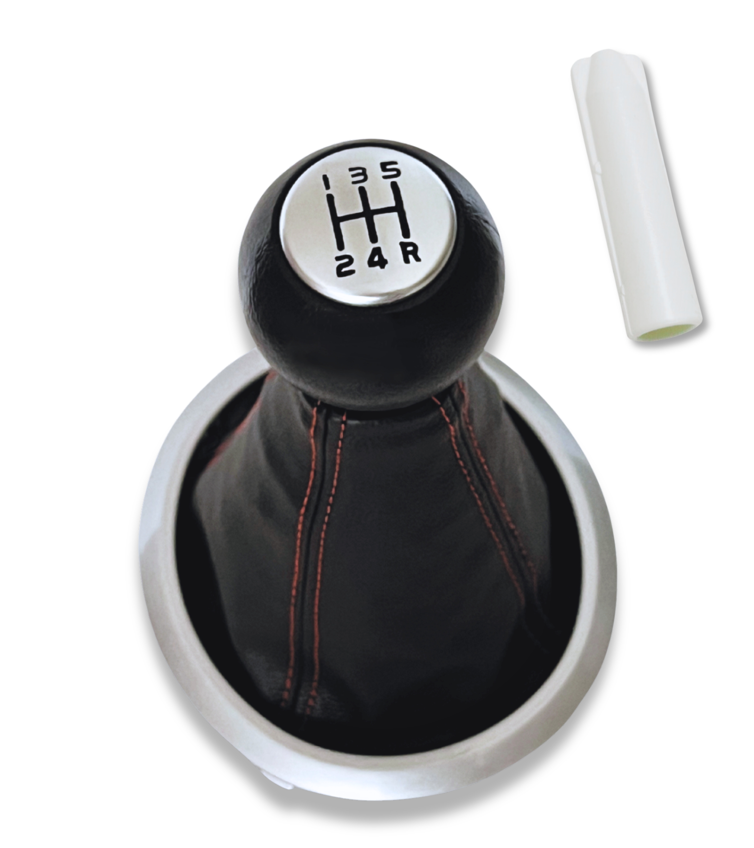 Pomello 5 marce manuali con impugnatura antiscivolo e placca in argento con numeri incisi di colore nero. Retromarcia in basso a destra. Necessita di adattatore in plastica per la leva cambio (incluso nella confezione).