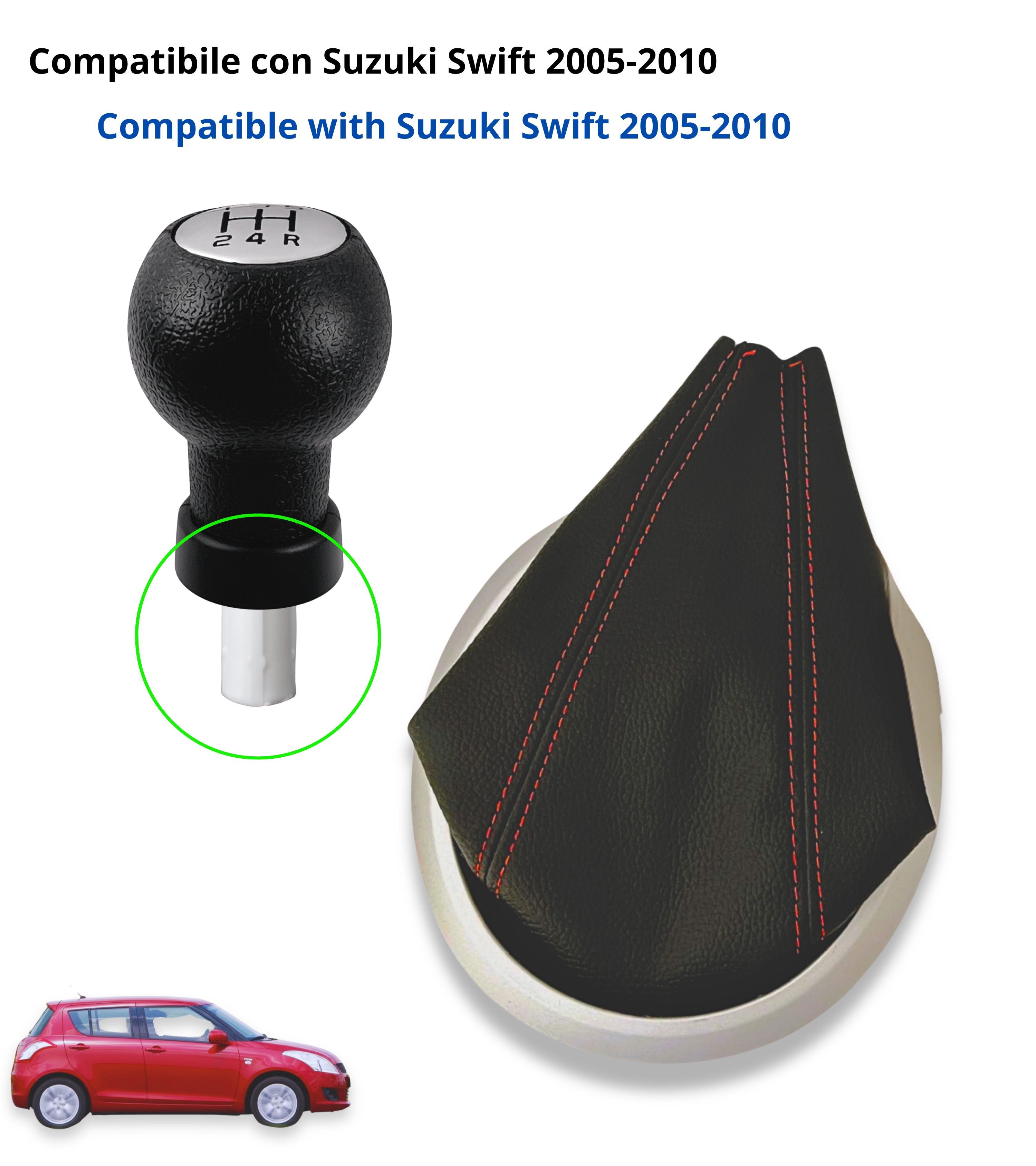 Kit composto da pomello 5 marce, cuffia con cuciture rosse, cornice esterna argento, ghiera di ritenzione e adattatore leva cambio, compatibile con Suzuki.